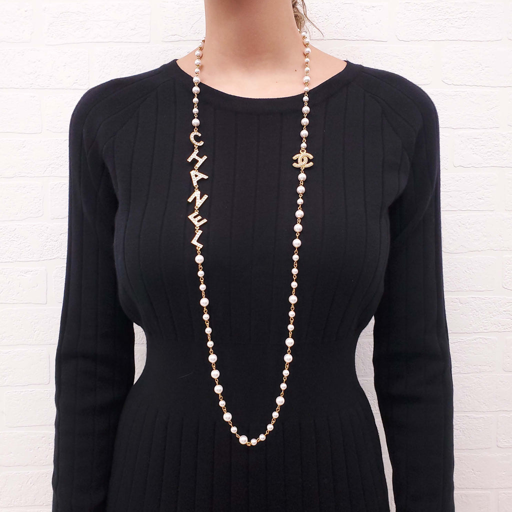 CHANEL LONG PEARL NECKLACE WITH CRYSTAL LETTERS AND LOGO