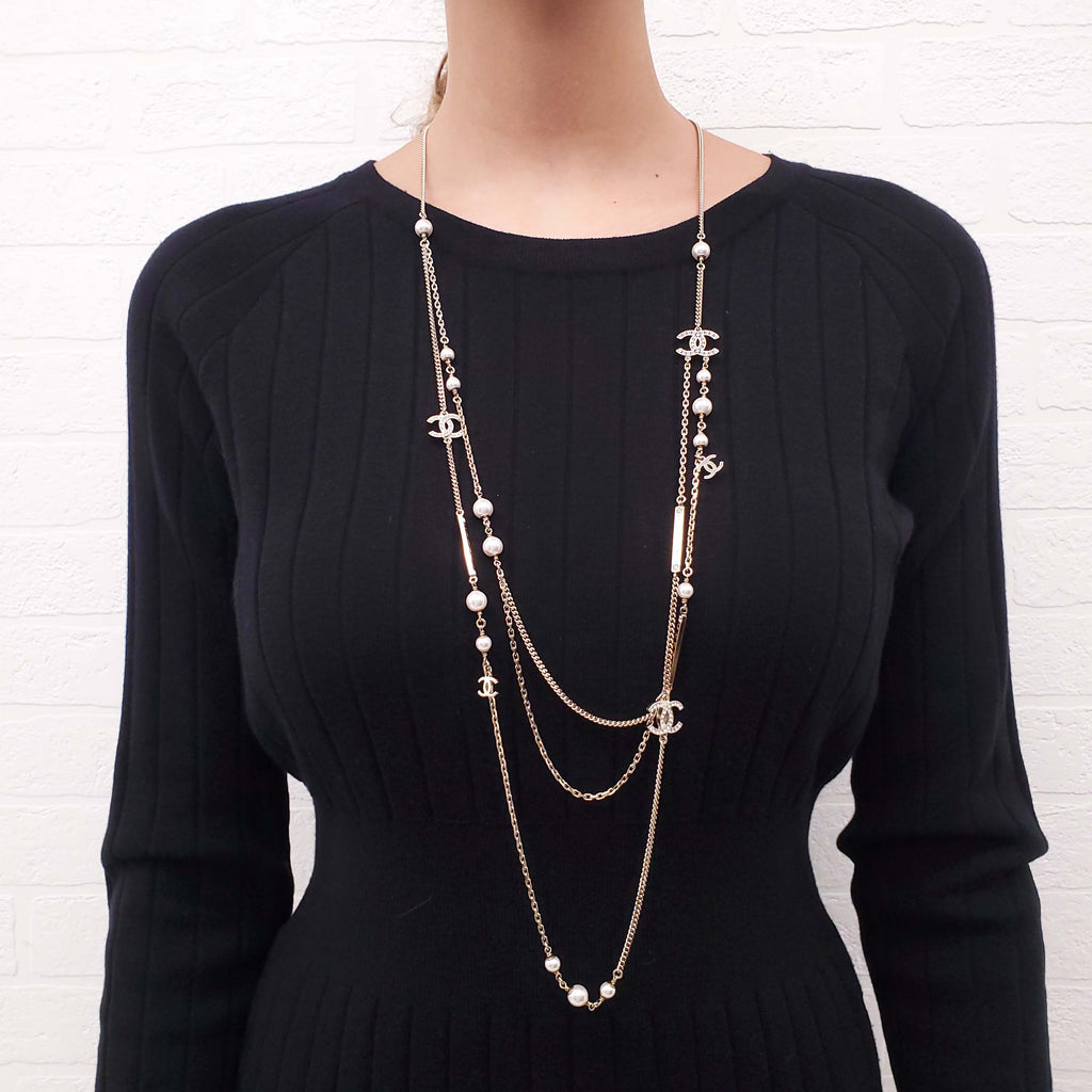 CHANEL MULTI-STRAND PEARL AND CHAIN LOGO NECKLACE