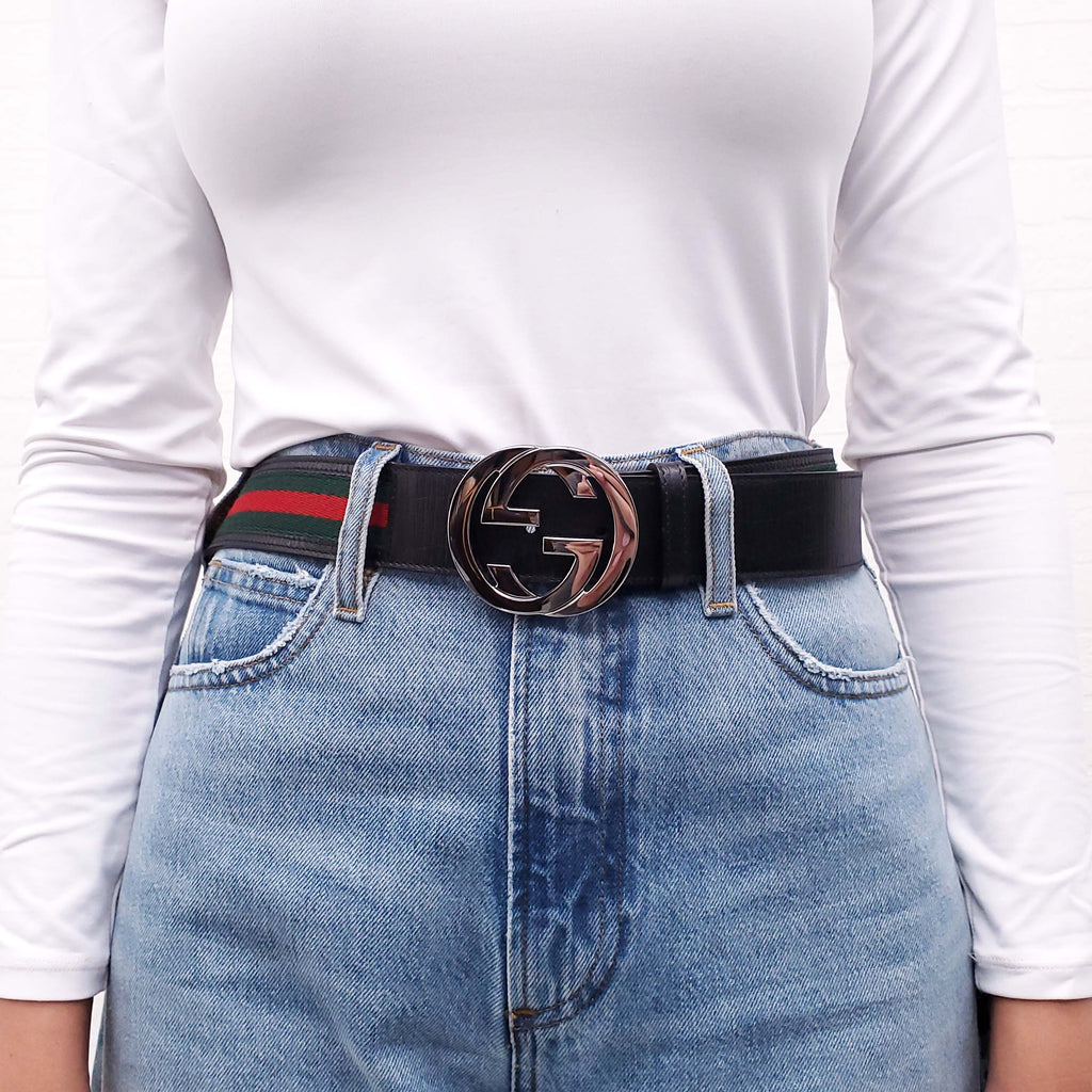 GUCCI MENS GREEN AND RED RIBBON BELT WITH BLACK LEATHER DETAIL AND SILVER LOGO - SIZE 105