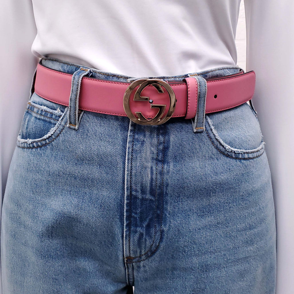 GUCCI PINK LEATHER LOGO BELT WITH SILVER HARDWARE - SIZE 80