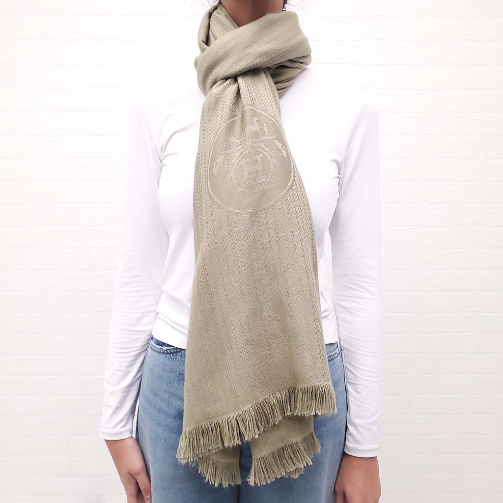HERMÈS SAGE GREEN CASHMERE AND SILK LOGO SHAWL