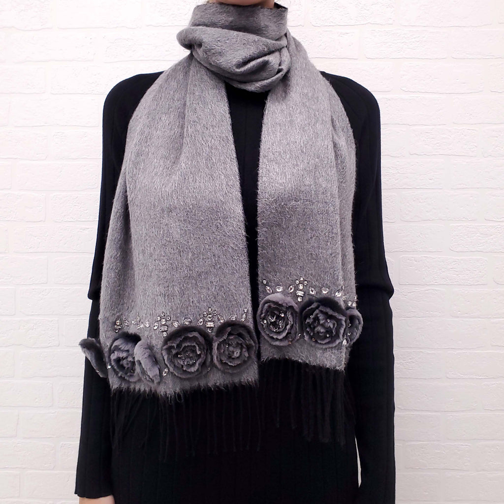 VALENTINO GREY SCARF WITH FUR FLOWERS