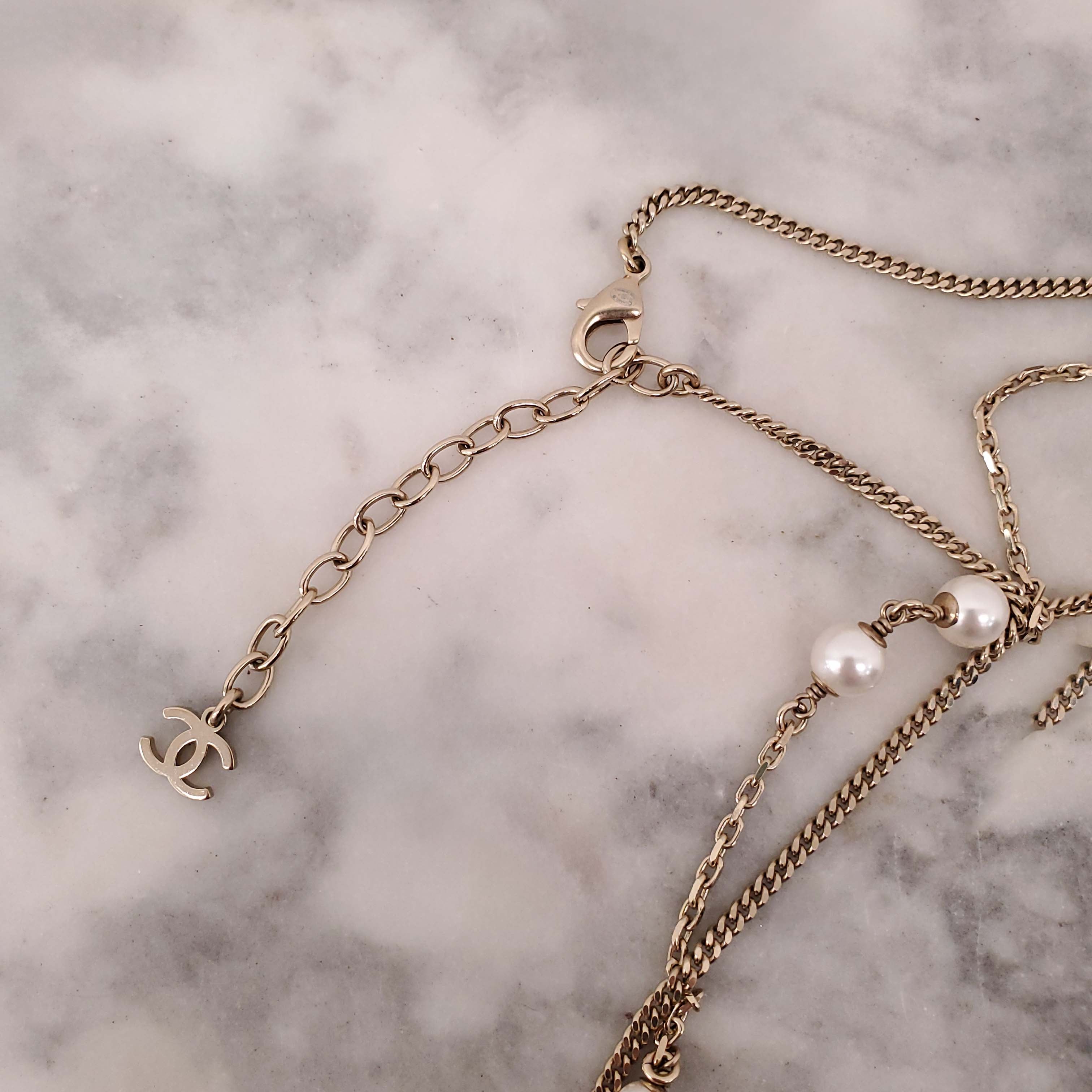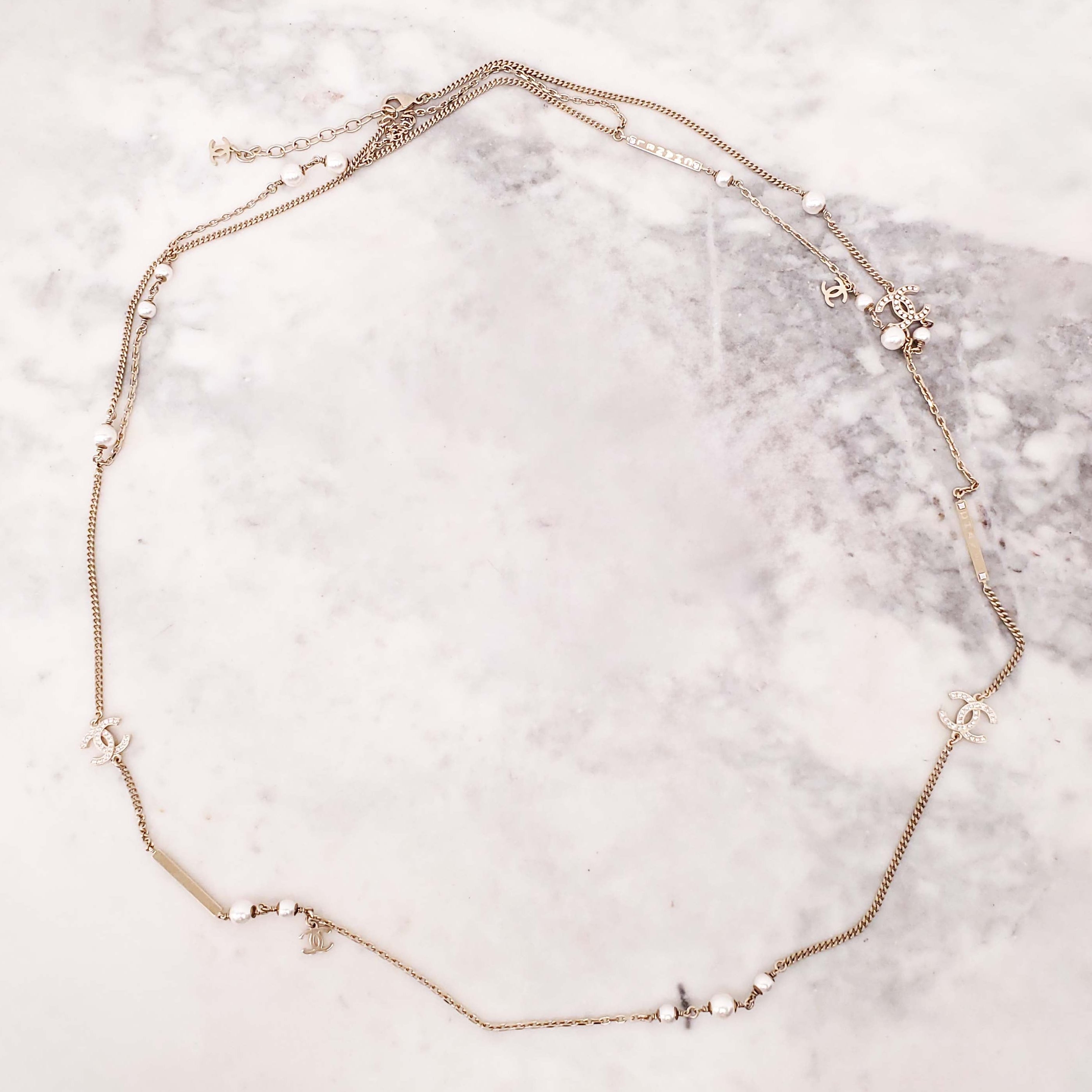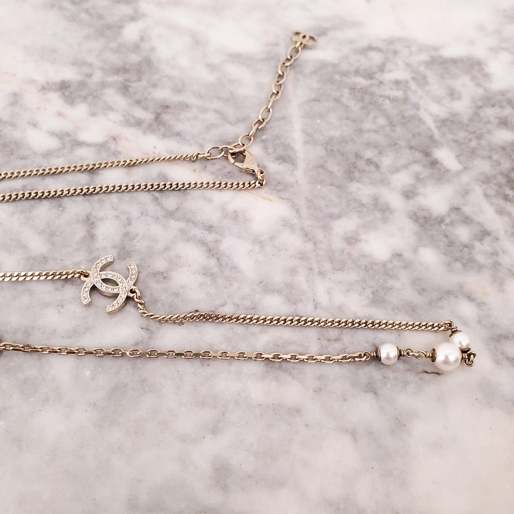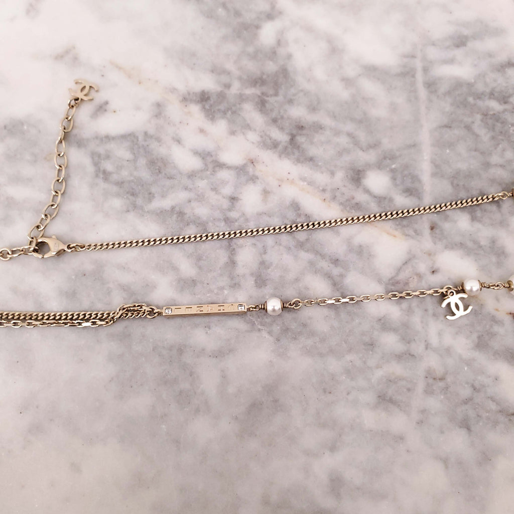 CHANEL MULTI-STRAND PEARL AND CHAIN LOGO NECKLACE