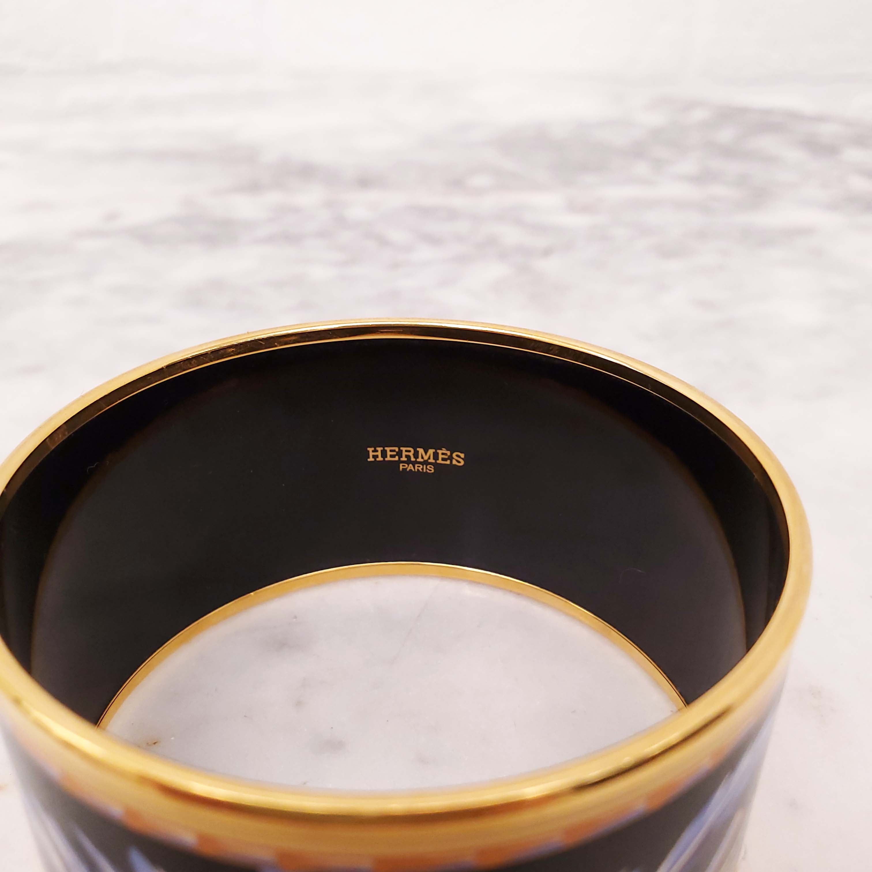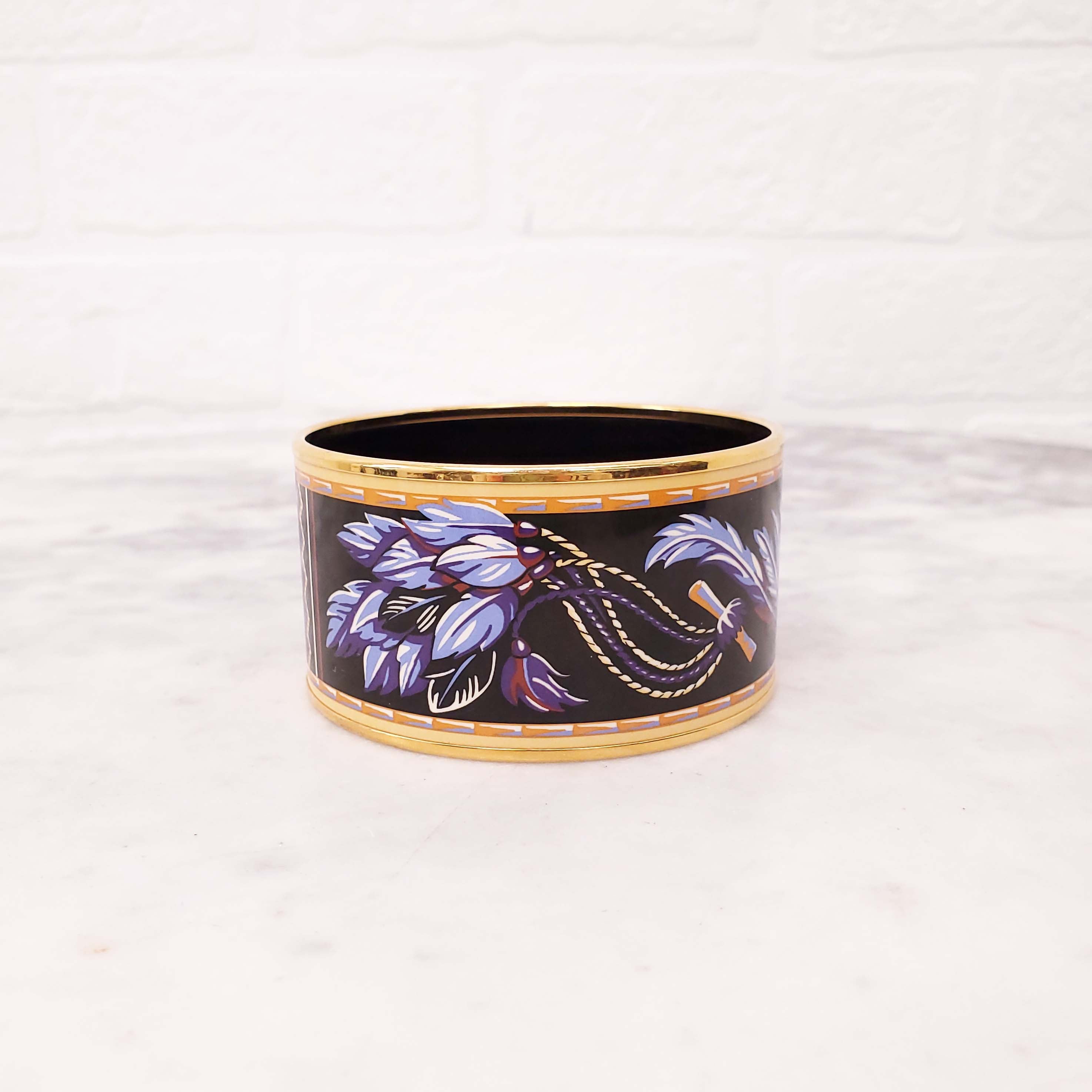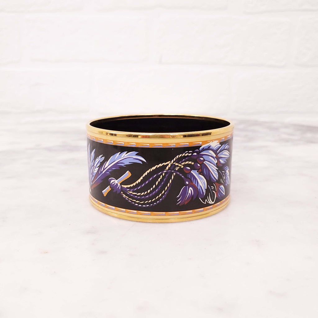 HERMÈS PURPLE AND YELLOW FEATHER PRINT WIDE ENAMEL BANGLE - SIZE S