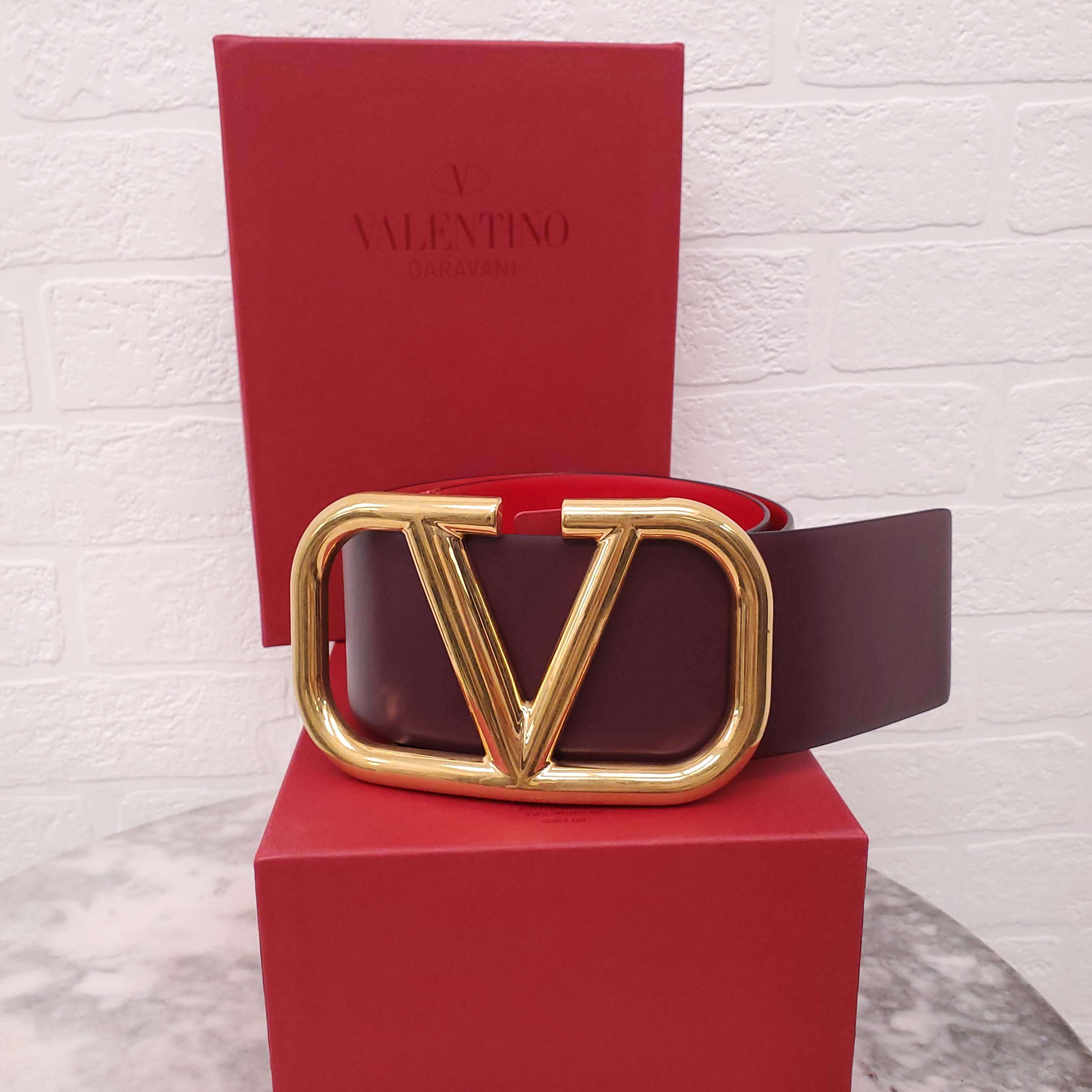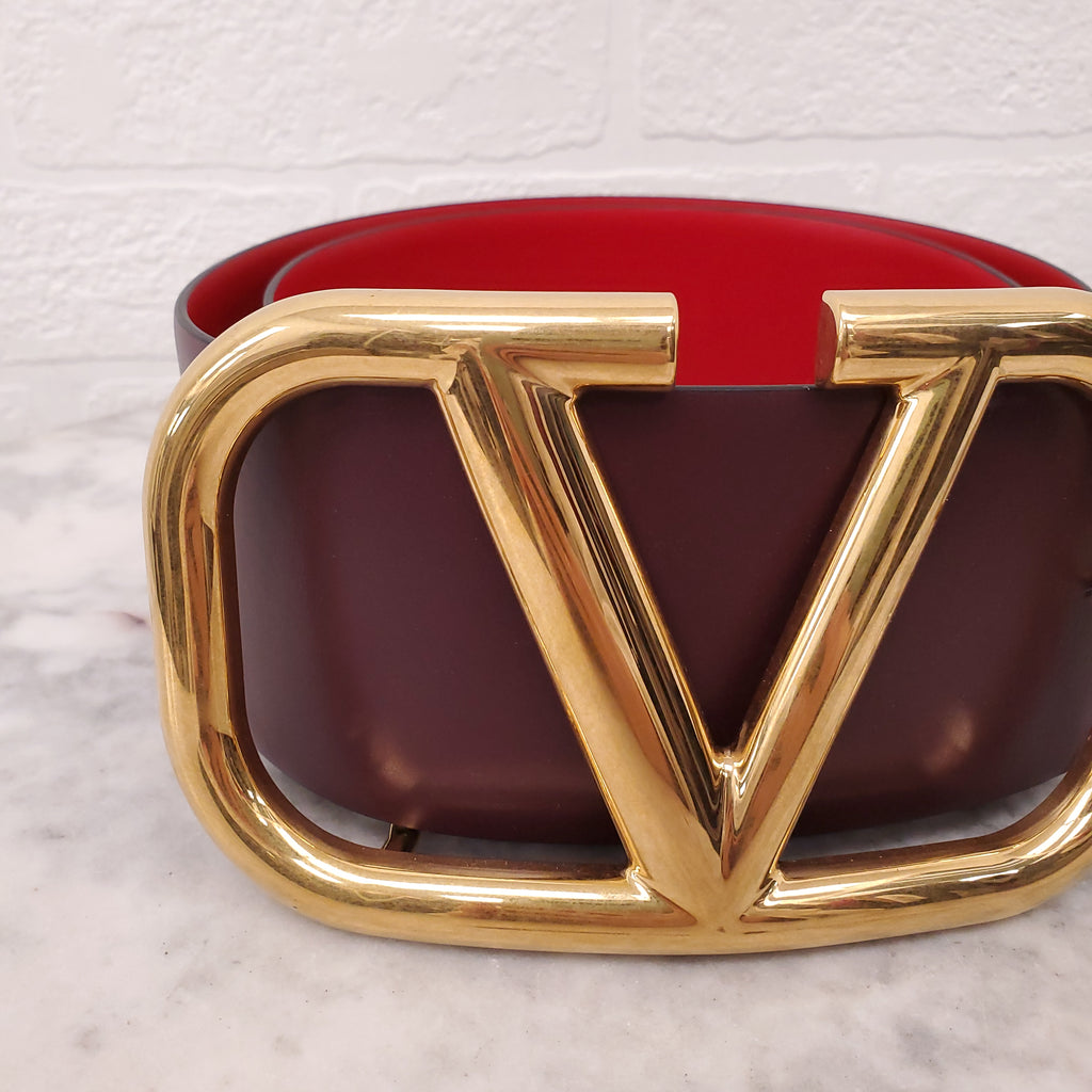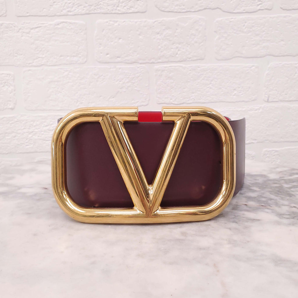 VALENTINO BURGUNDY AND RED WIDE LEATHER LOGO BELT - SIZE 75