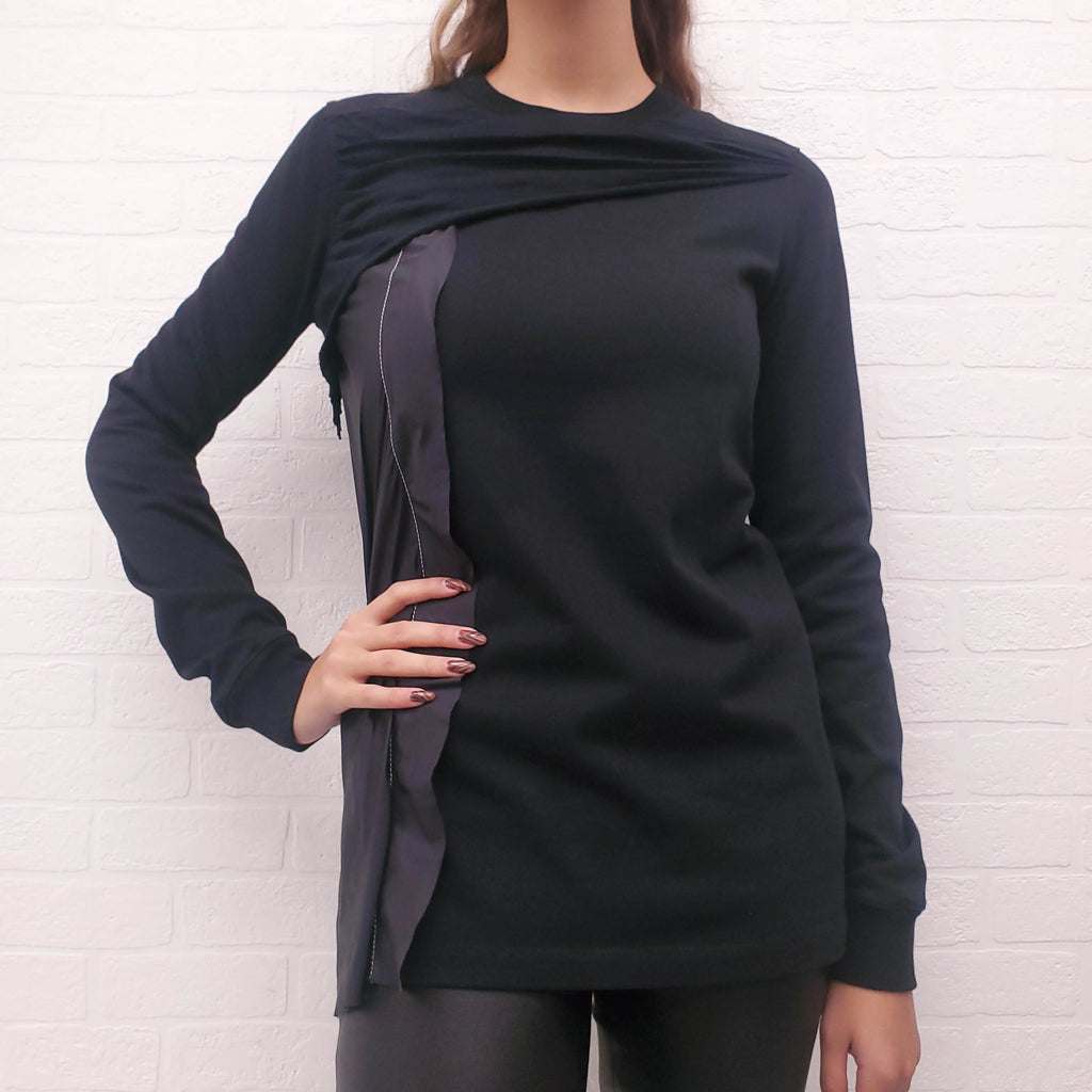 RICK OWENS BLACK SWEATSHIRT WITH SILK LAYERED DETAIL - SIZE 4