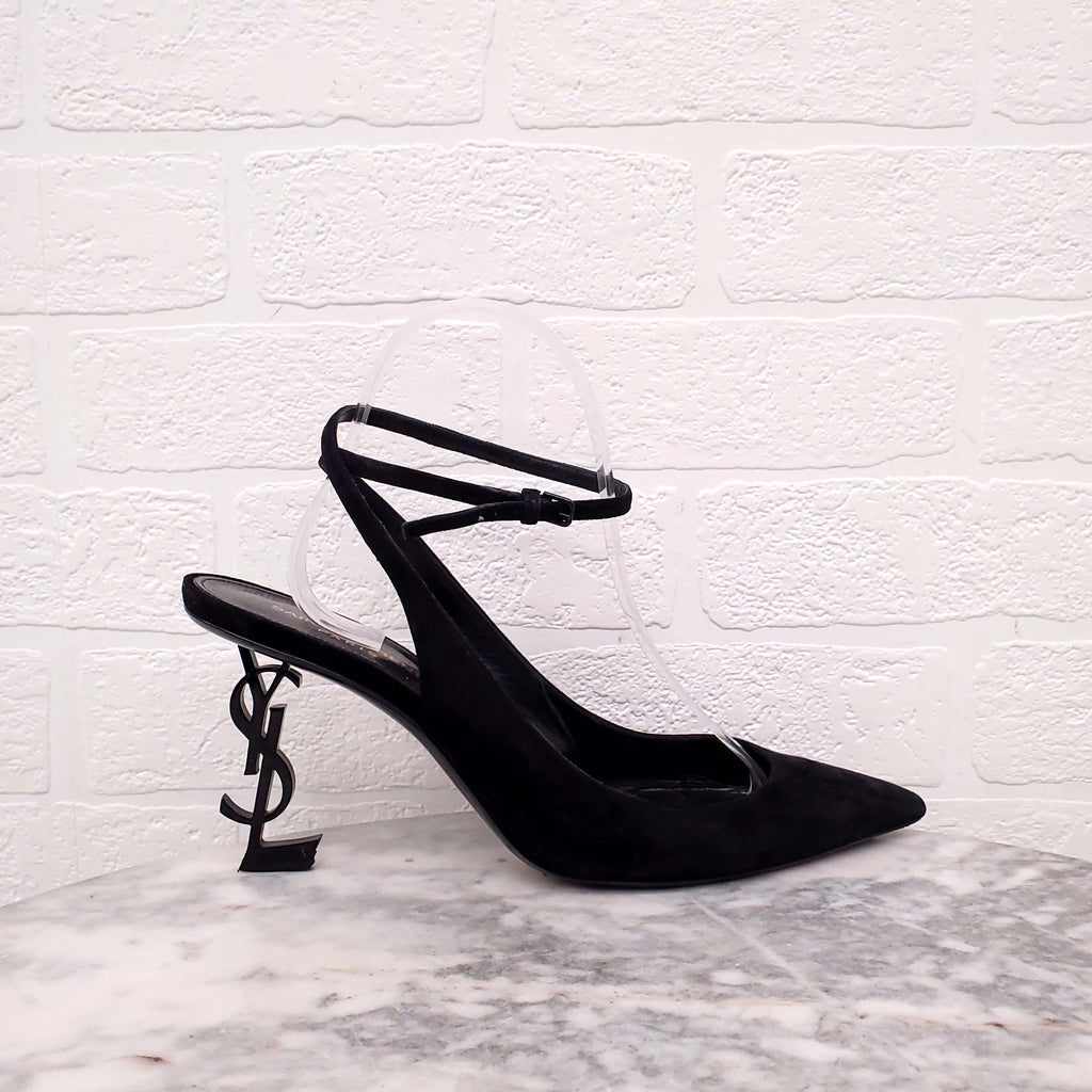SAINT LAURENT BLACK SUEDE 'OPYUM' LOGO HEELS - SIZE 40.5
