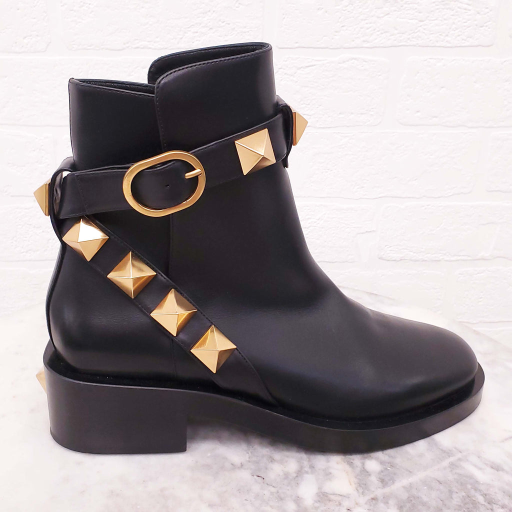 VALENTINO BLACK LEATHER ROMAN ROCKSTUD ANKLE BOOTS - SIZE 38
