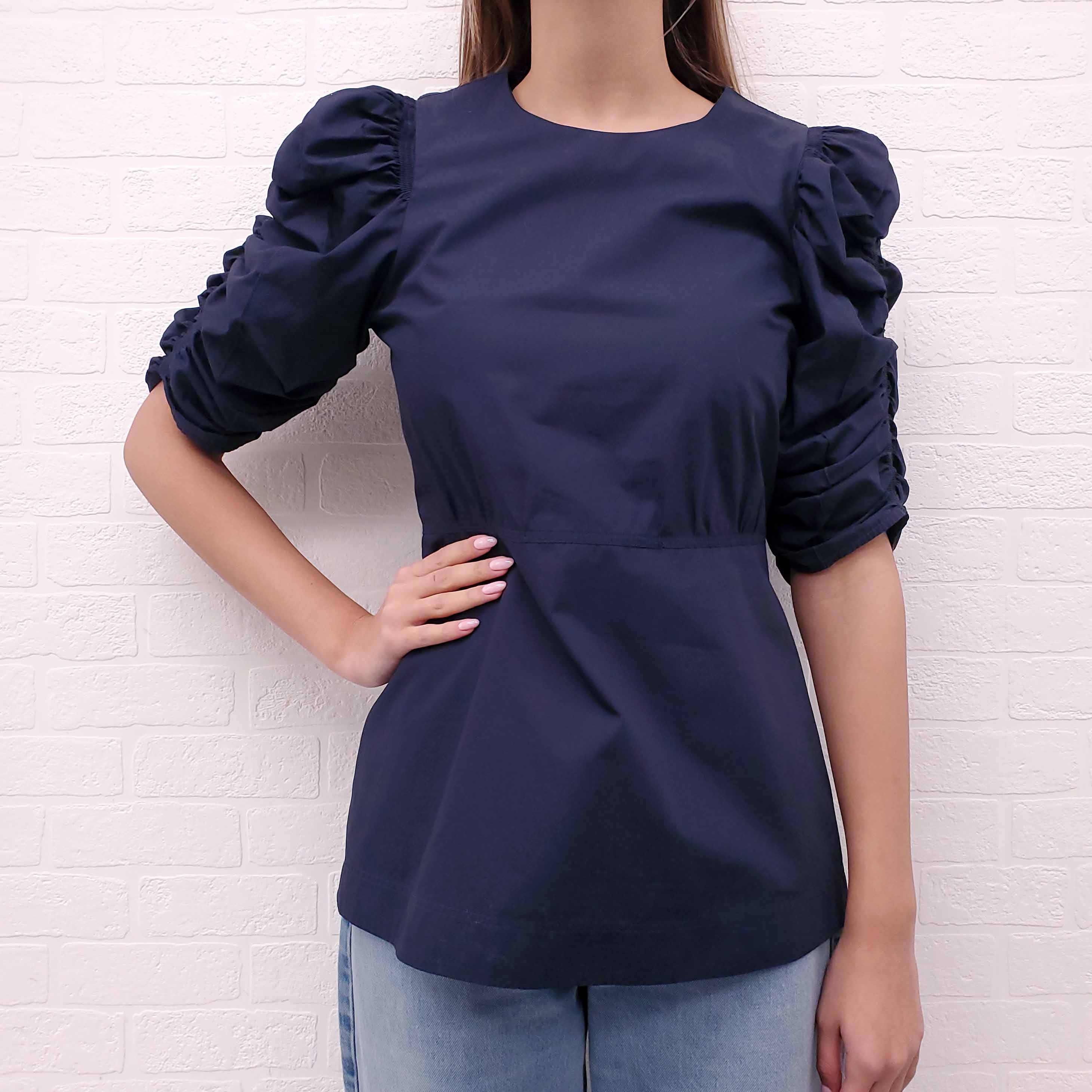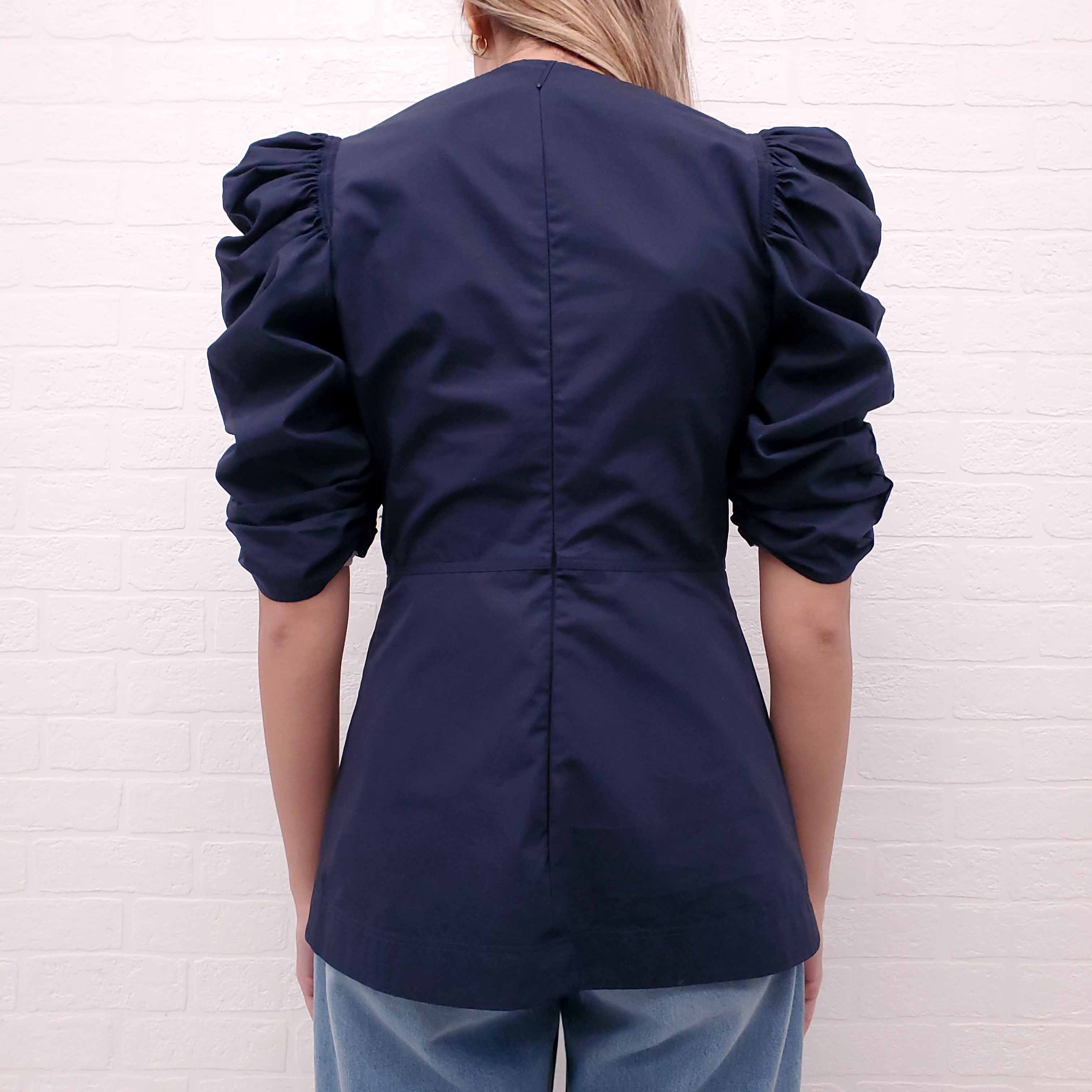 CELINE BLUE COTTON BLOUSE WITH RUCHED SLEEVE DETAIL - SIZE 40