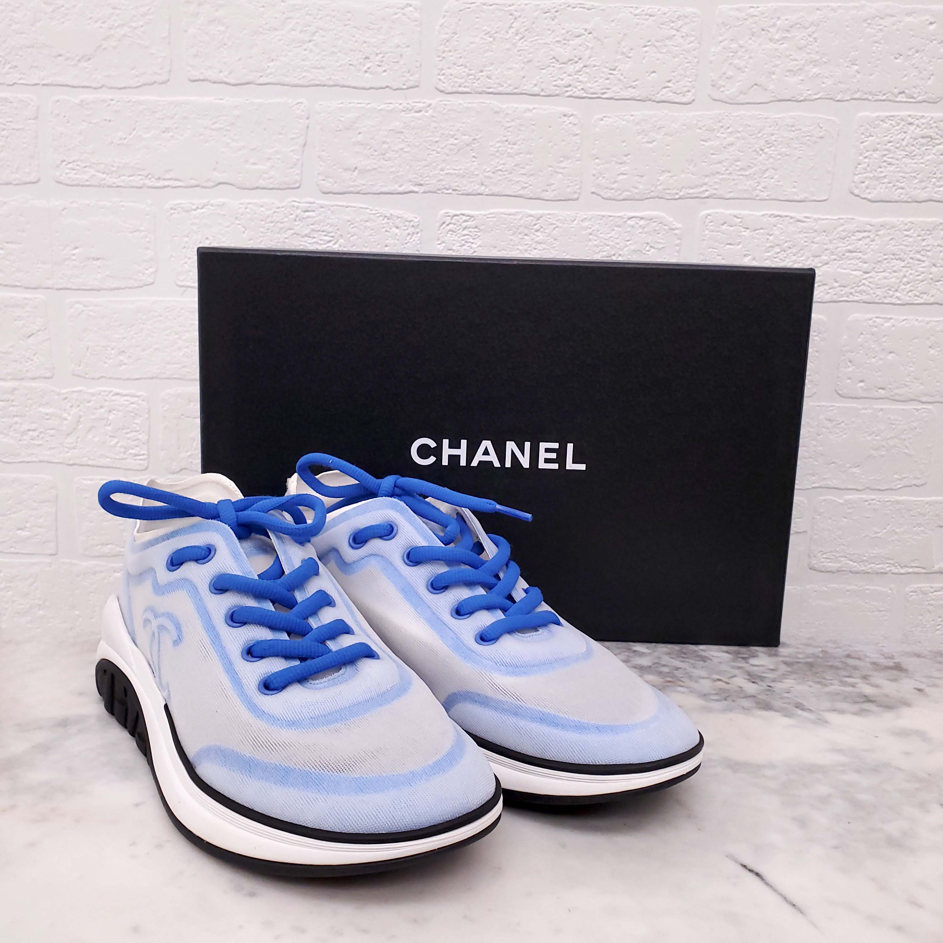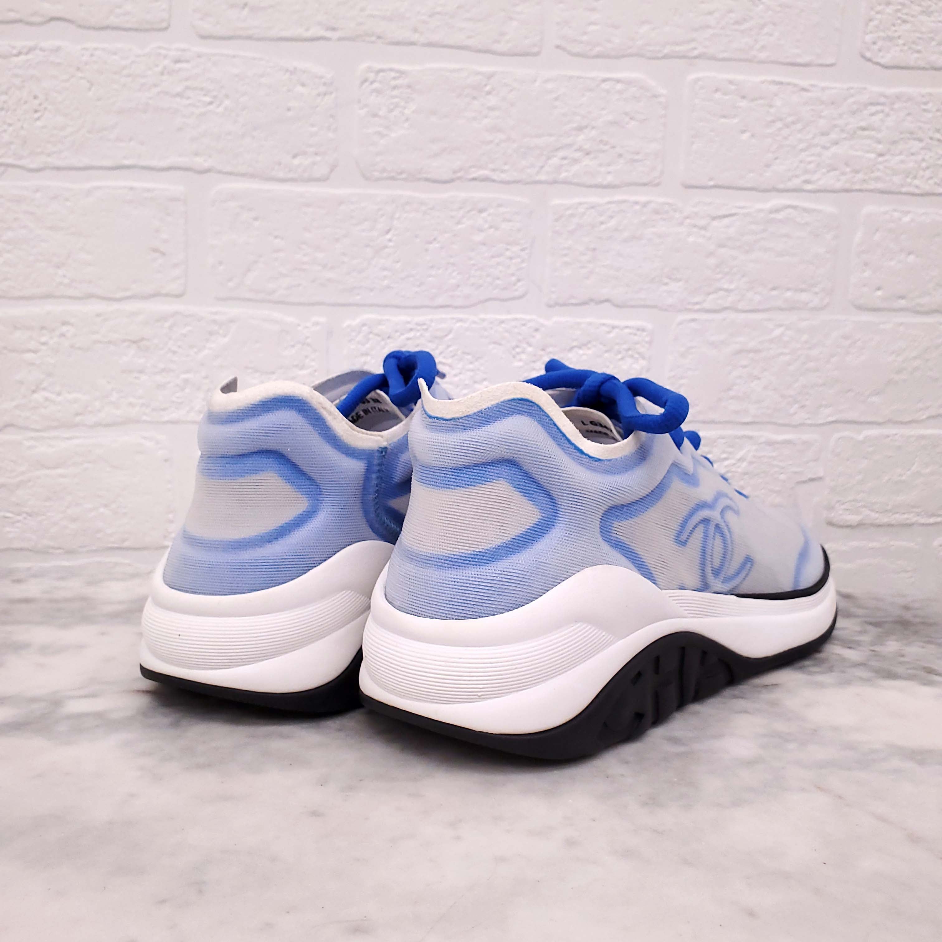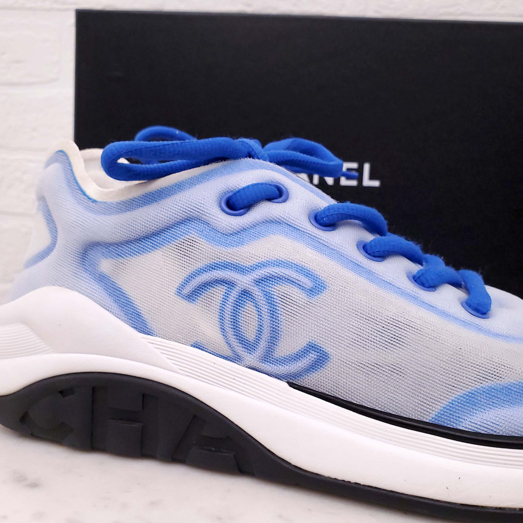 CHANEL WHITE AND BLUE '19P' SNEAKERS - SIZE 38