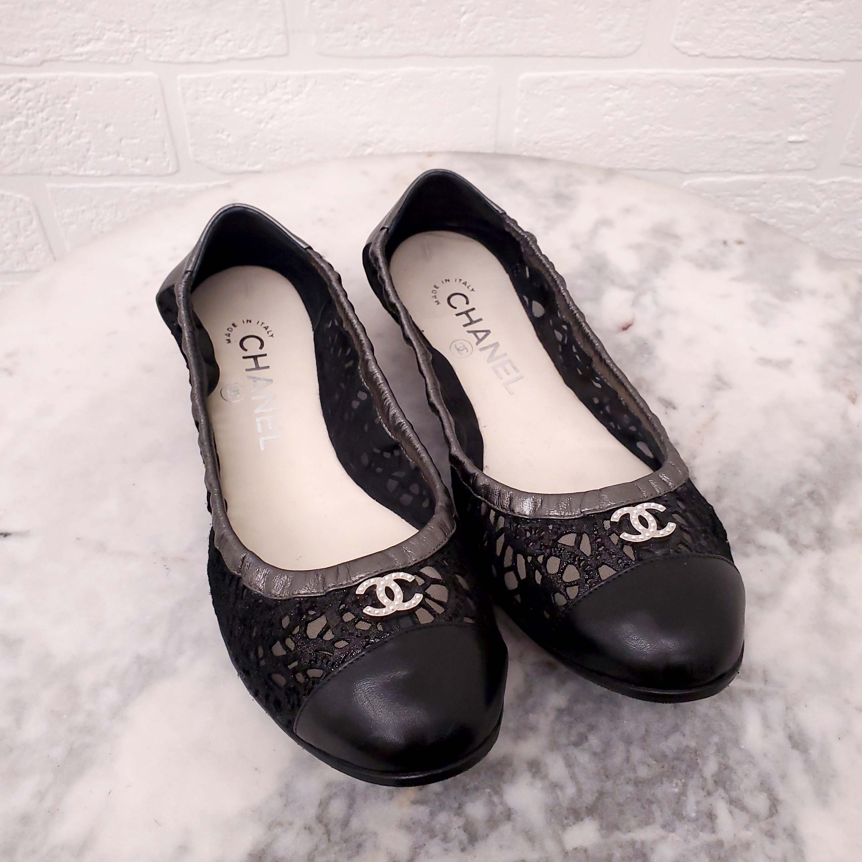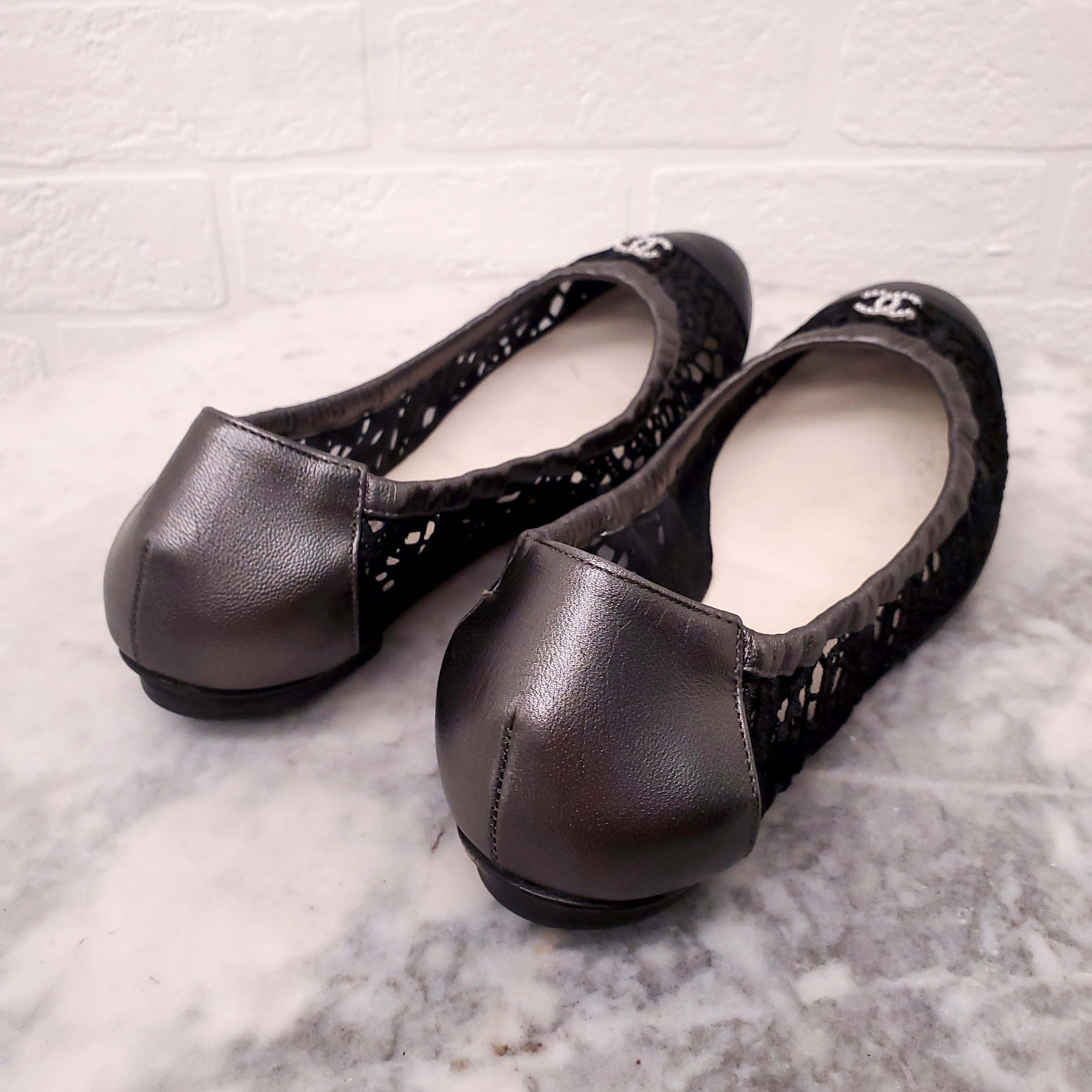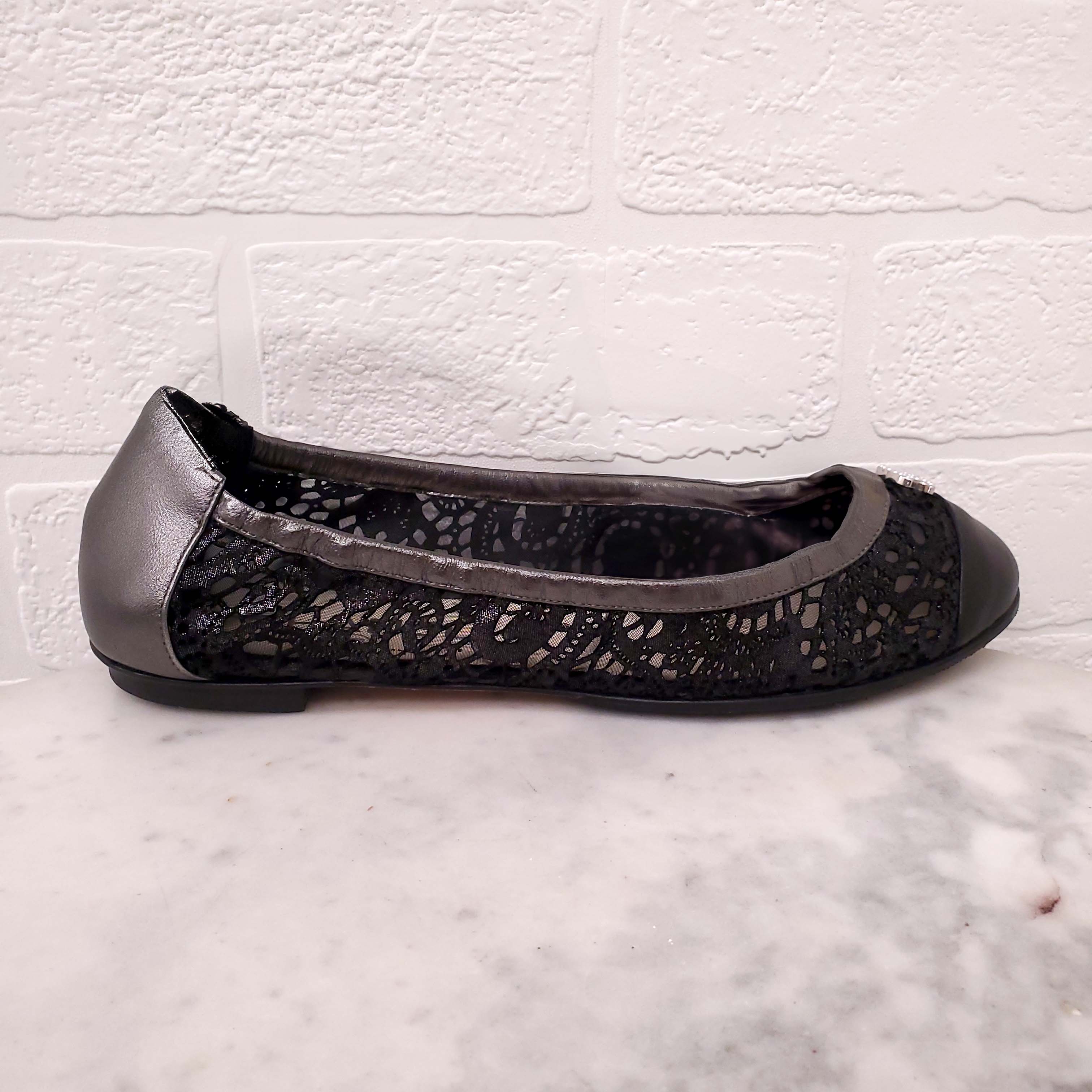CHANEL SILVER LACE BALLET FLATS WITH LOGO - SIZE 36.5