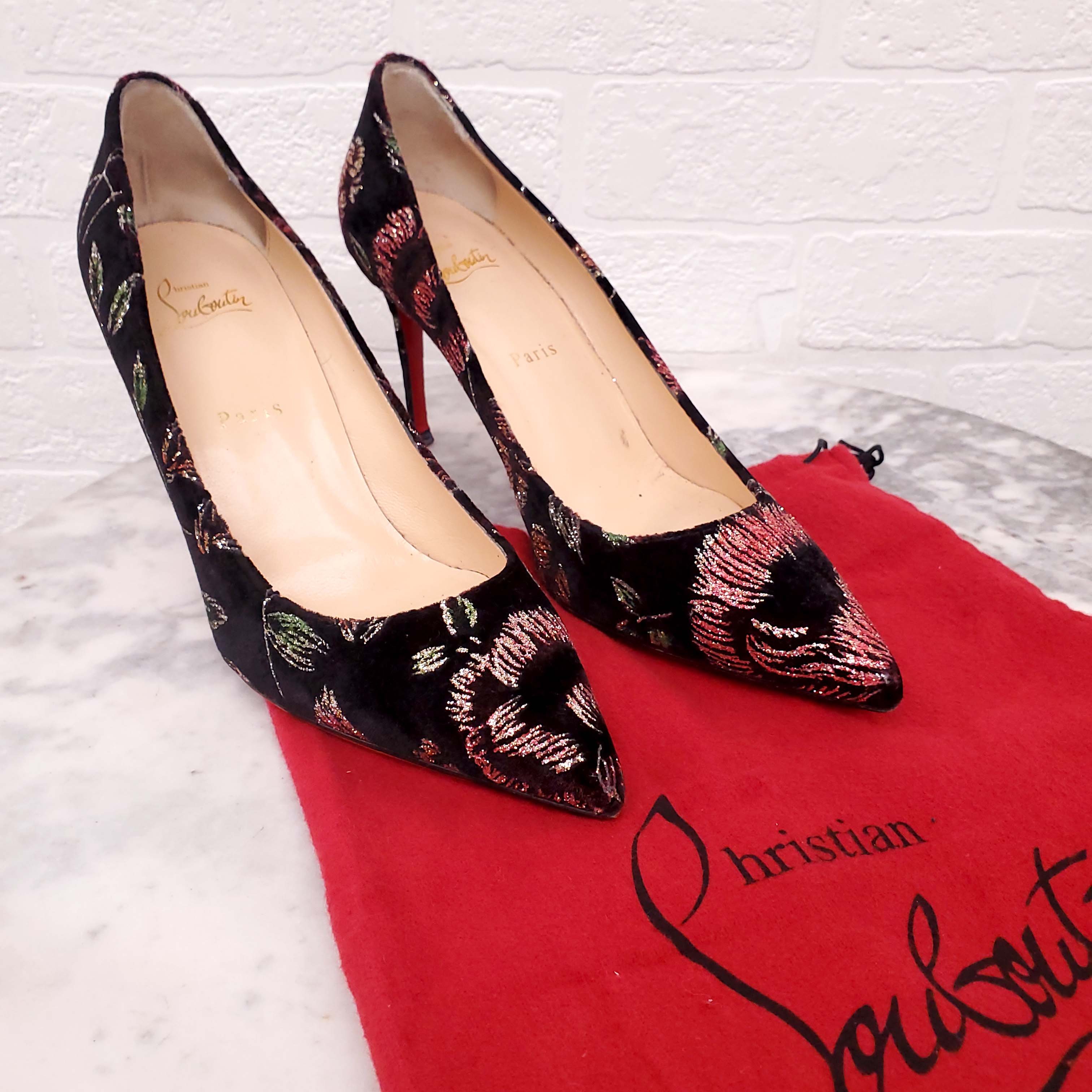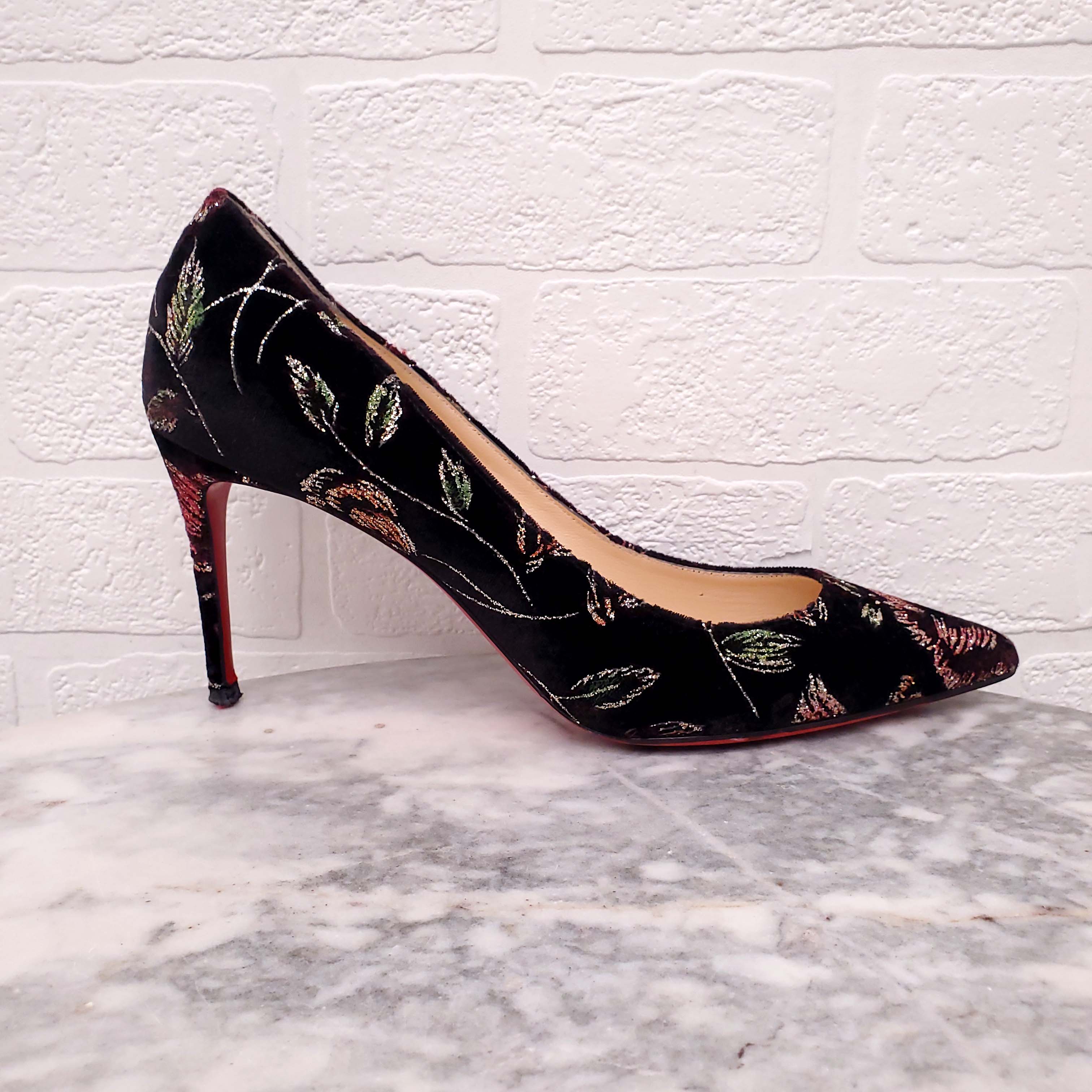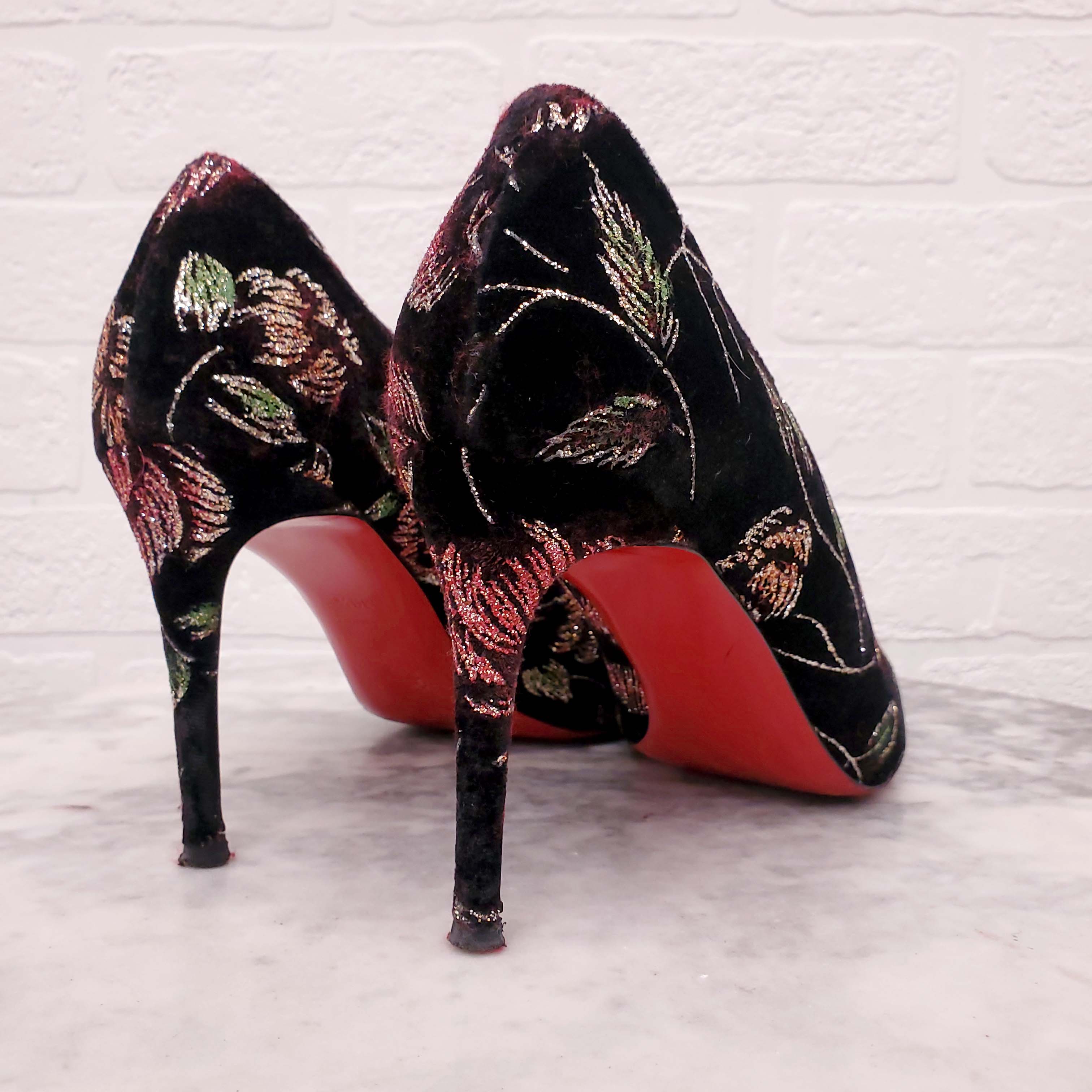CHRISTIAN LOUBOUTIN BLACK VELVET FLORAL SPARKLE HEEL - SIZE 39.5