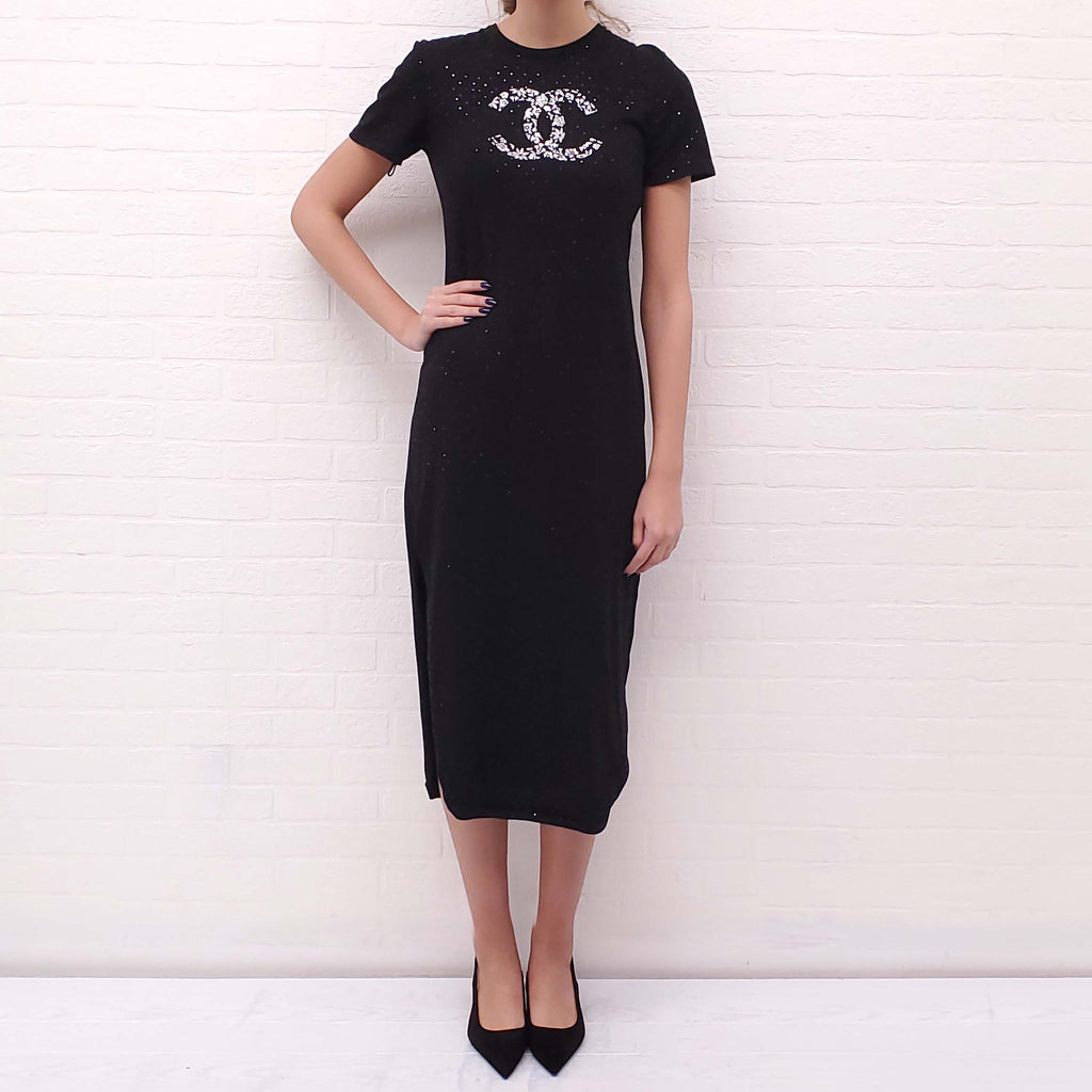 CHANEL 2021 BLACK SHORT SLEEVE MAXI DRESS WITH FLORAL LOGO AND SEQUINS - SIZE 34