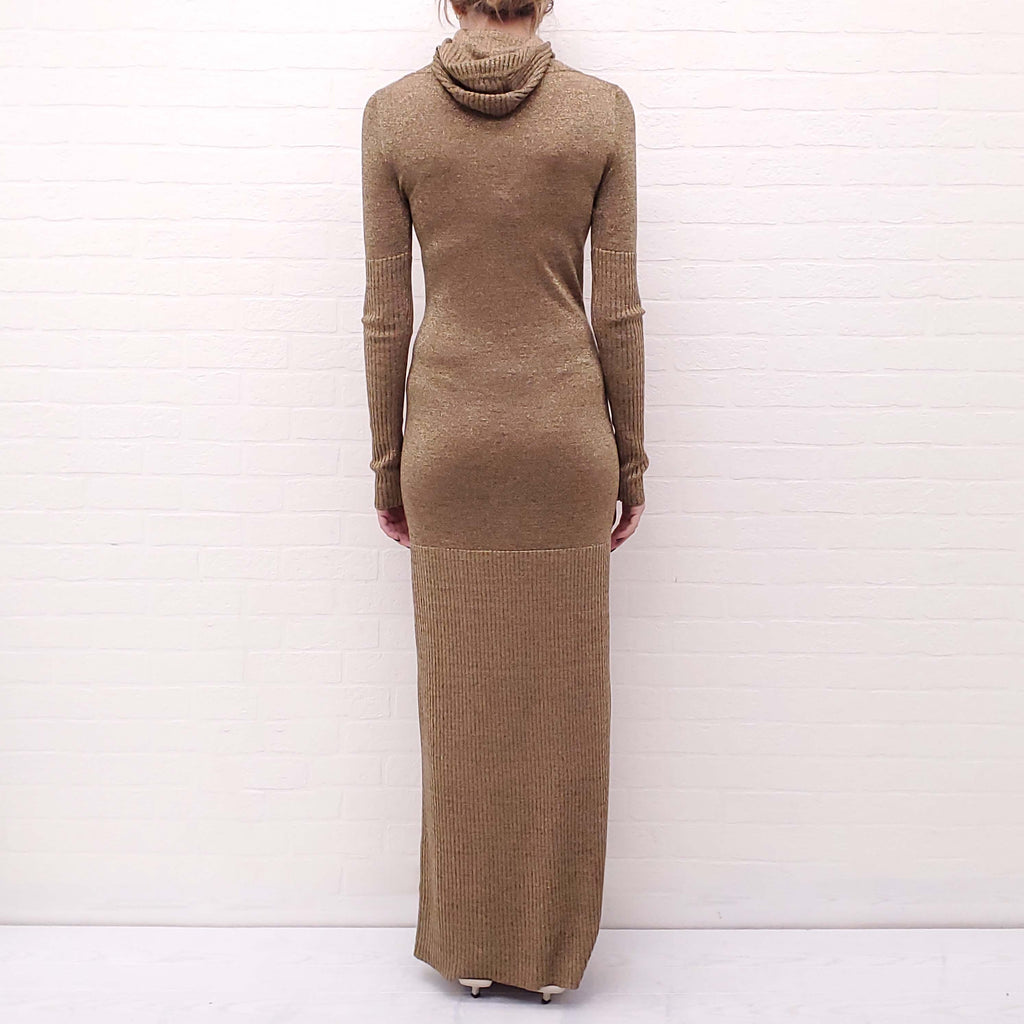 CHANEL GOLD METALLIC KNIT GOWN WITH HOOD - SIZE 36