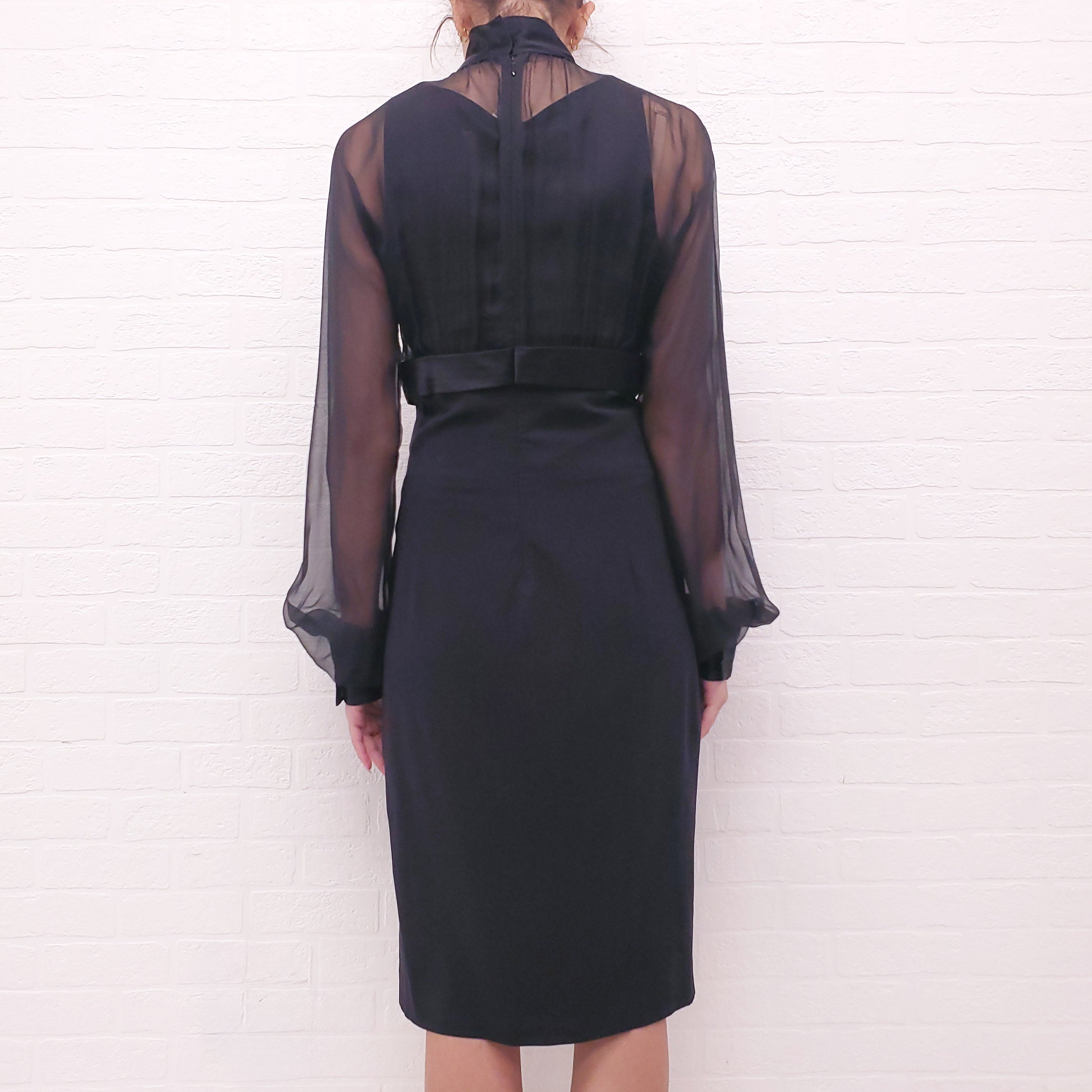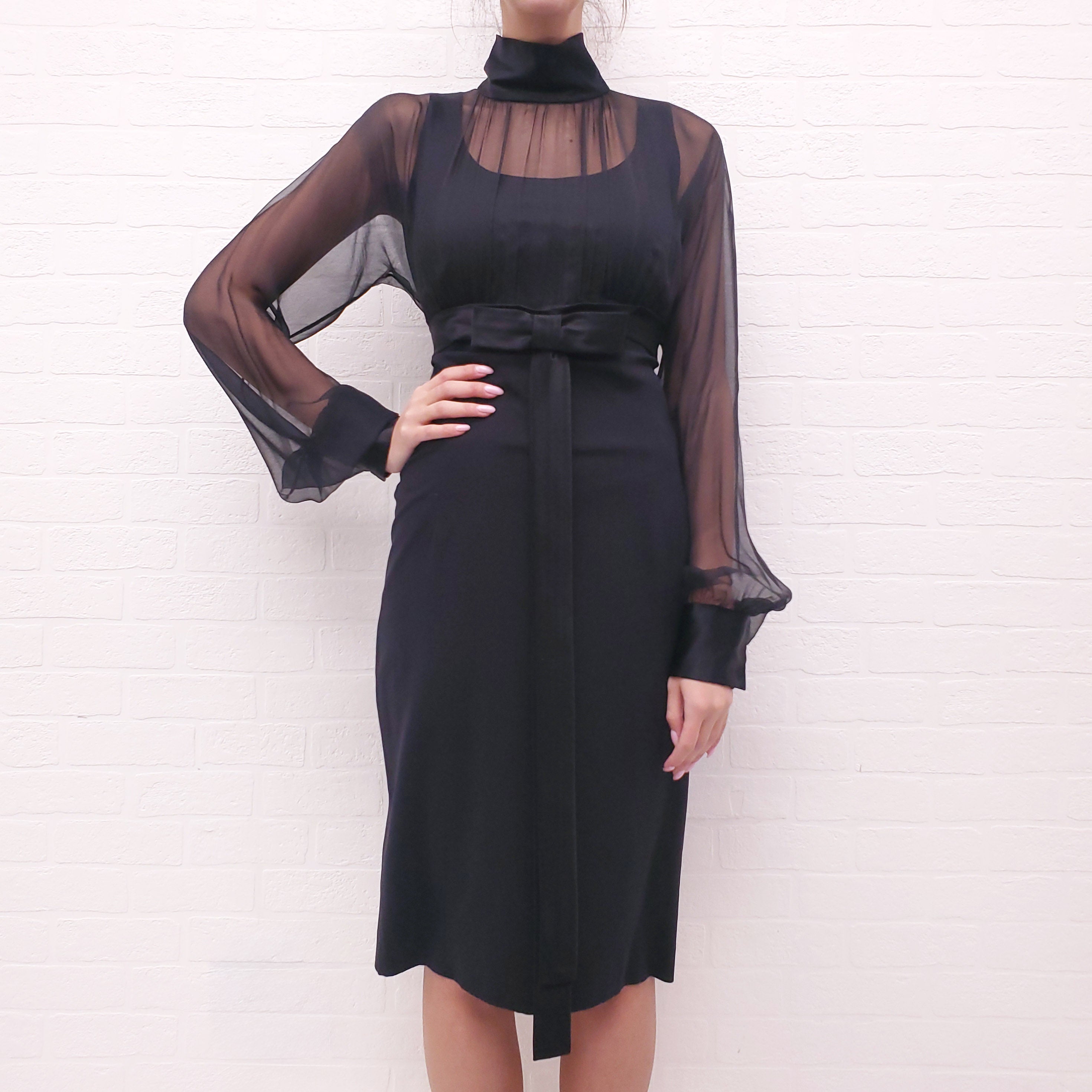 DOLCE & GABBANA BLACK SILK DRESS WITH SHEER ORGANZA TOP WITH BOW - SIZE 48