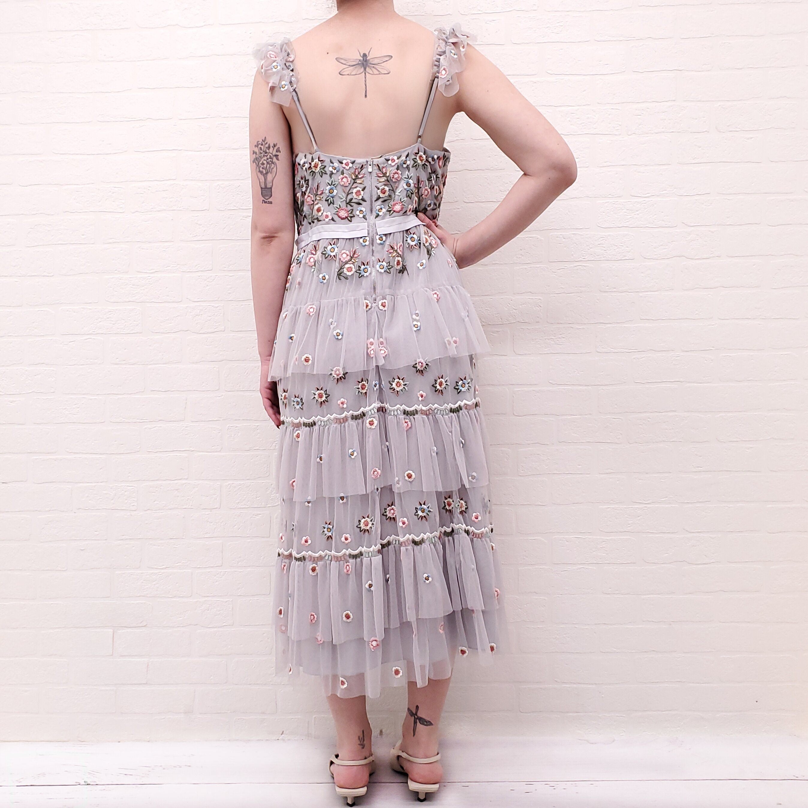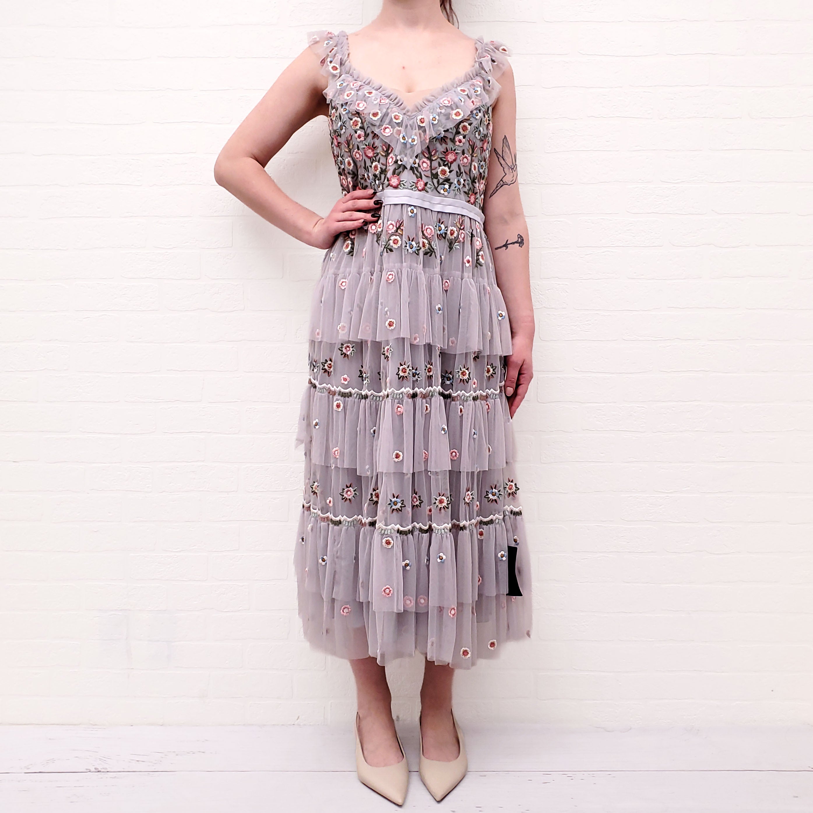 NEEDLE & THREAD GREY FLORAL RUFFLED DRESS - SIZE 8