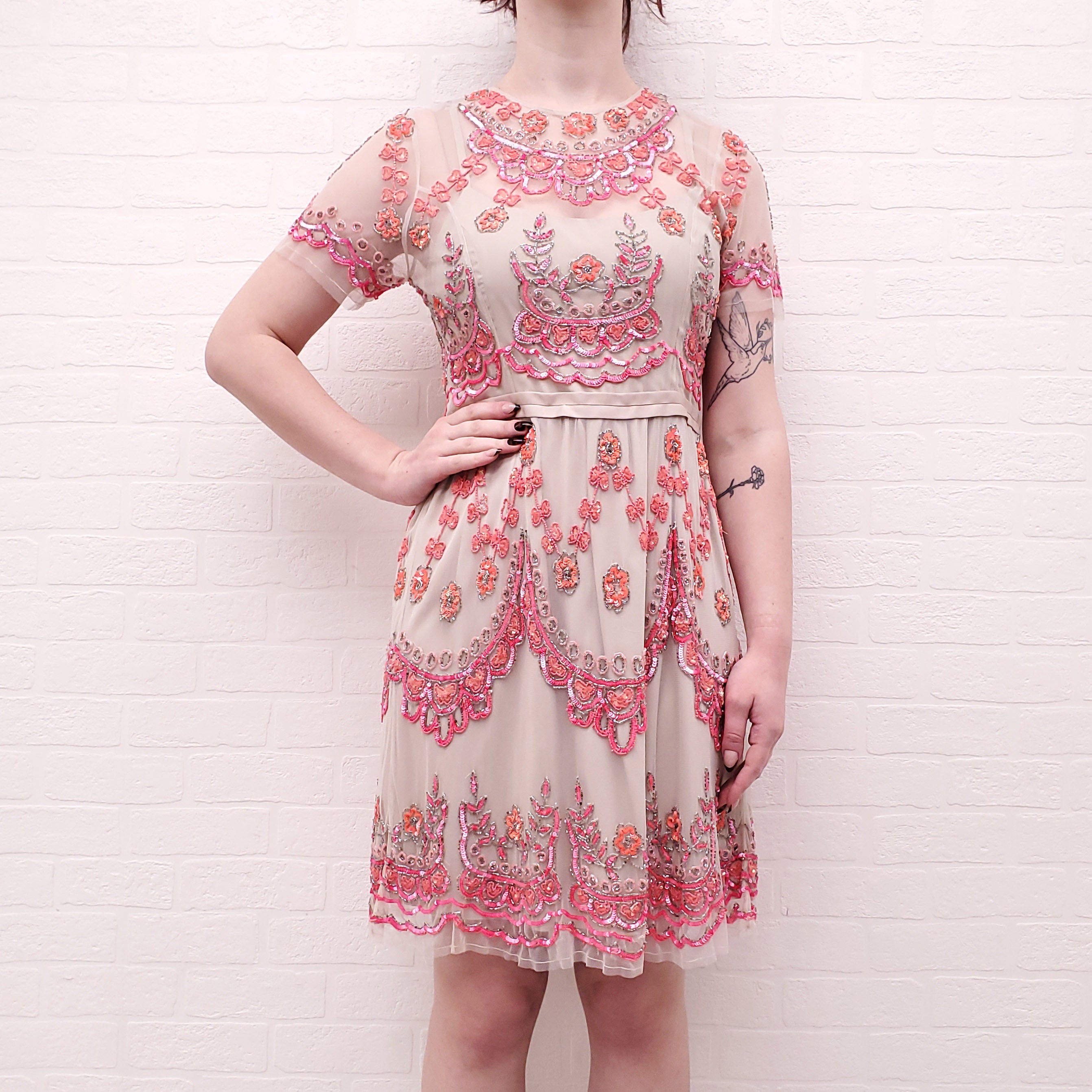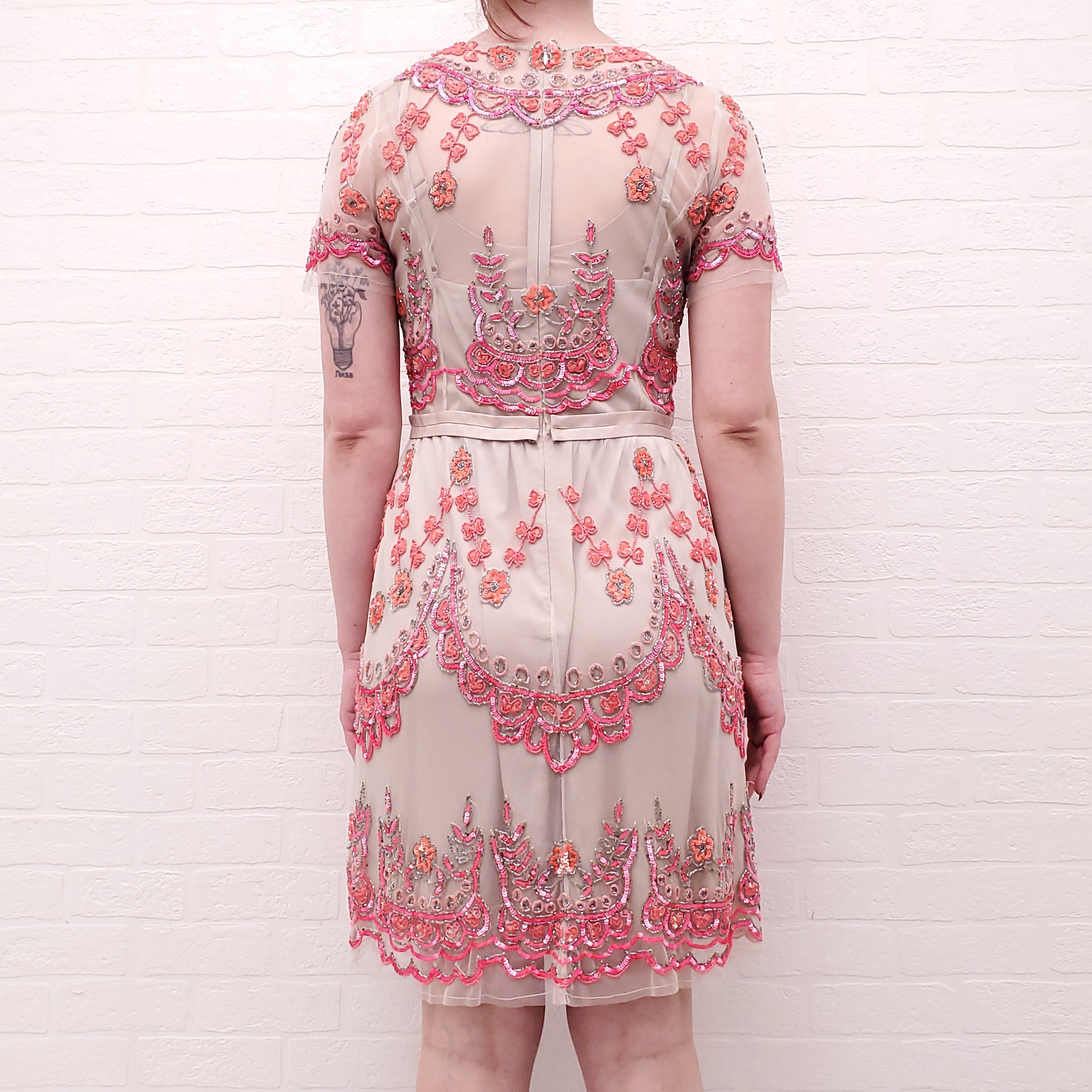 NEEDLE & THREAD PINK AND NUDE MESH SEQUIN DRESS - SIZE 8