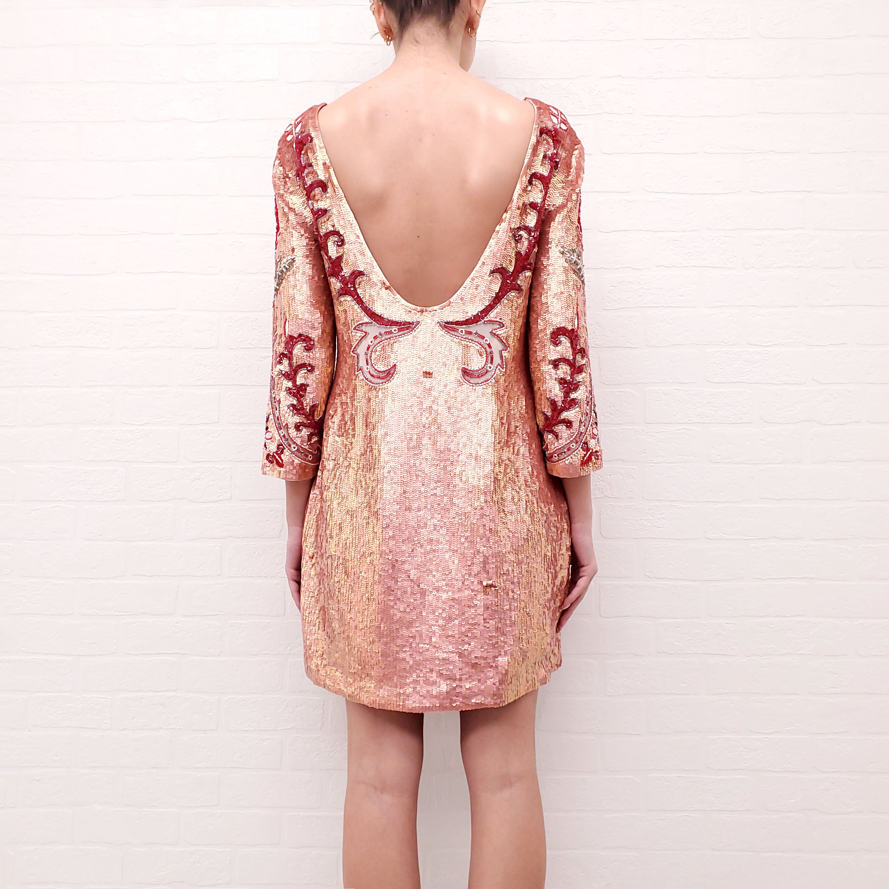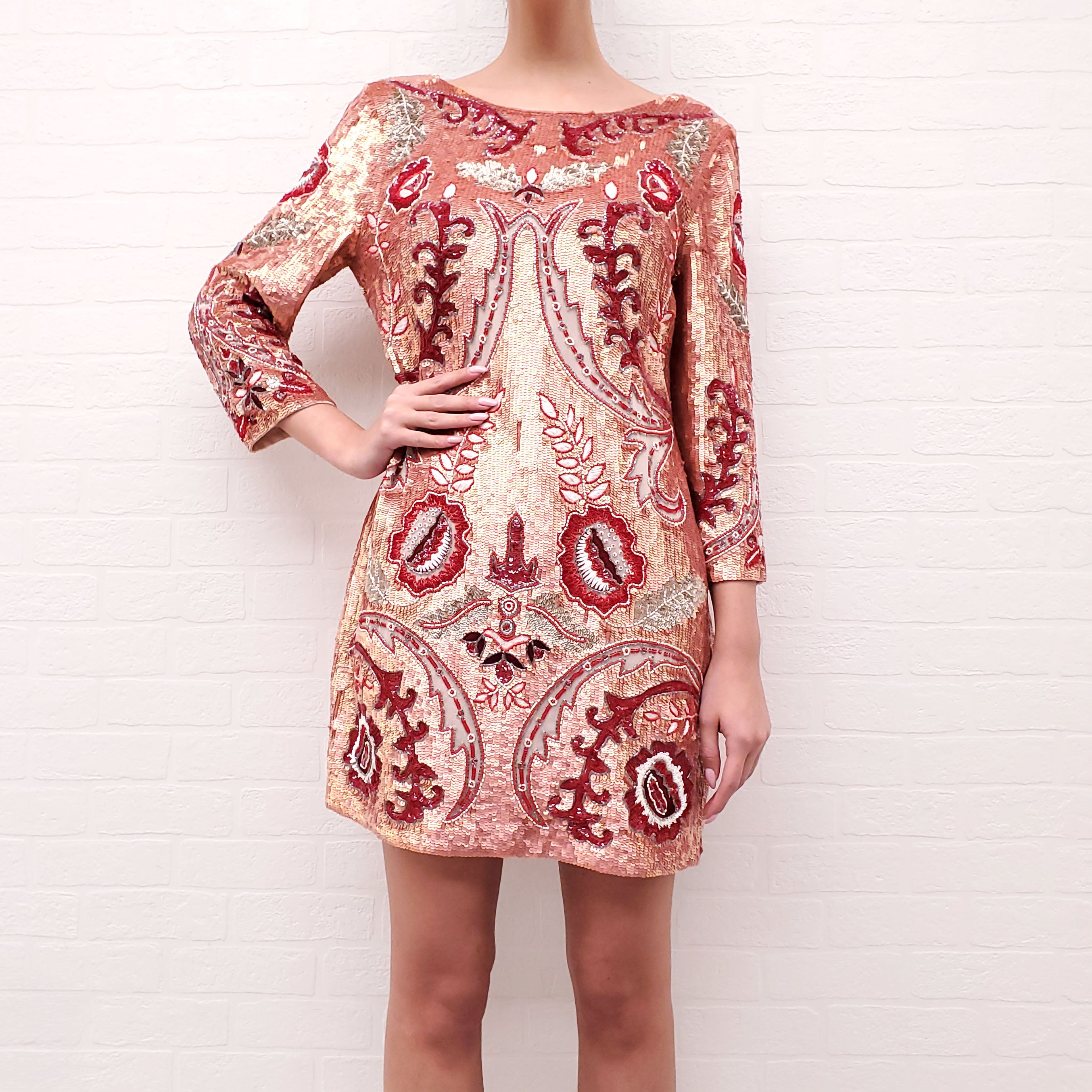 NEEDLE & THREAD ROSE GOLD & RED PATTERNED SEQUIN BEADED DRESS - SIZE 10