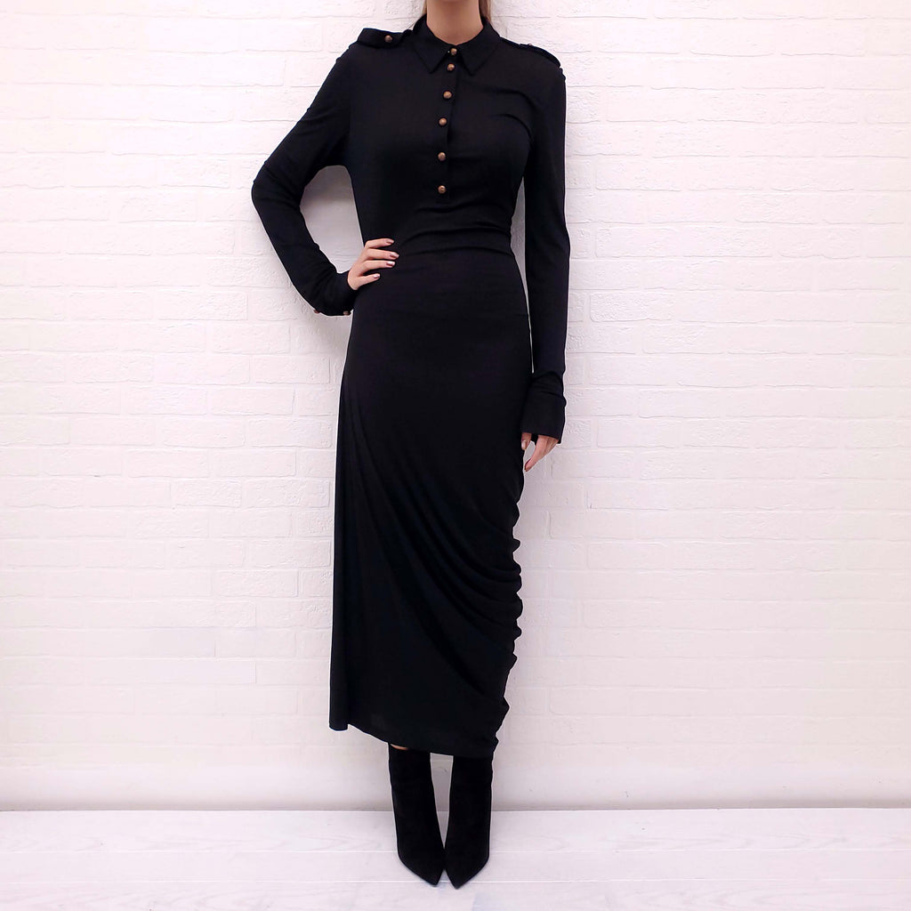 ALEXANDER MCQUEEN BLACK LONG SLEEVE ROUCHED DRESS WITH BRONZE BUTTONS - SIZE 44