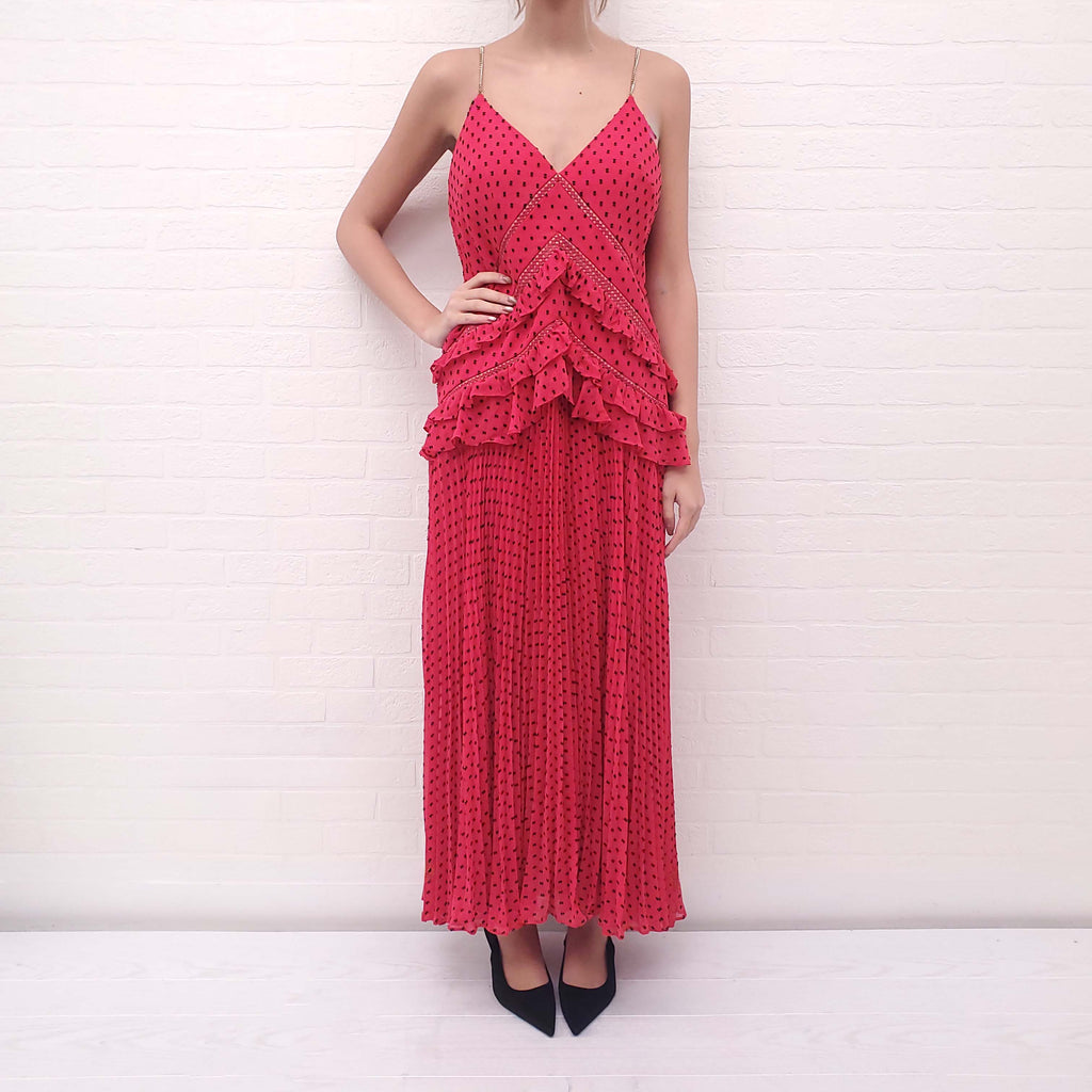SELF-PORTRAIT RED POLKA DOT PLEATED DRESS WITH FRILL DETAIL - SIZE 6
