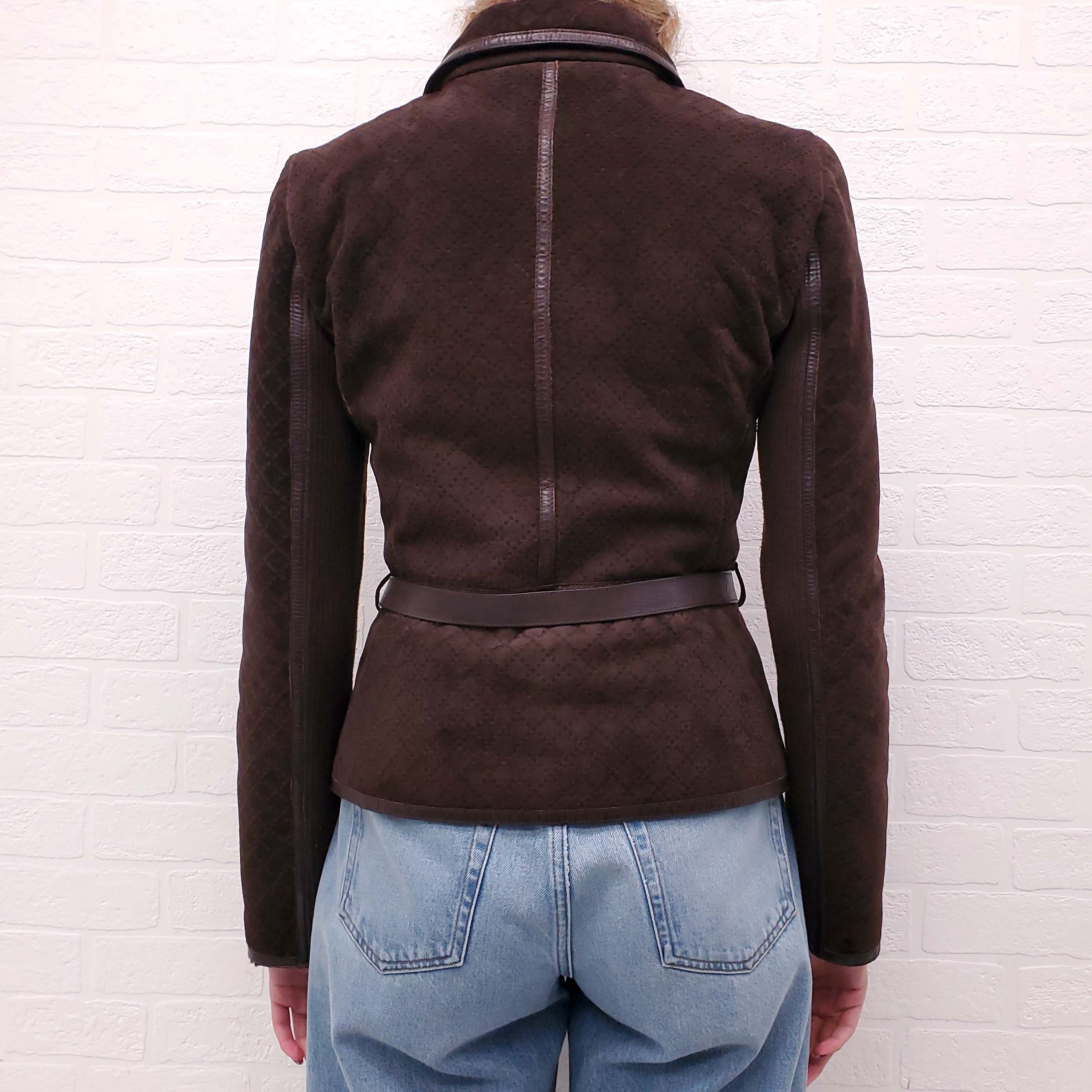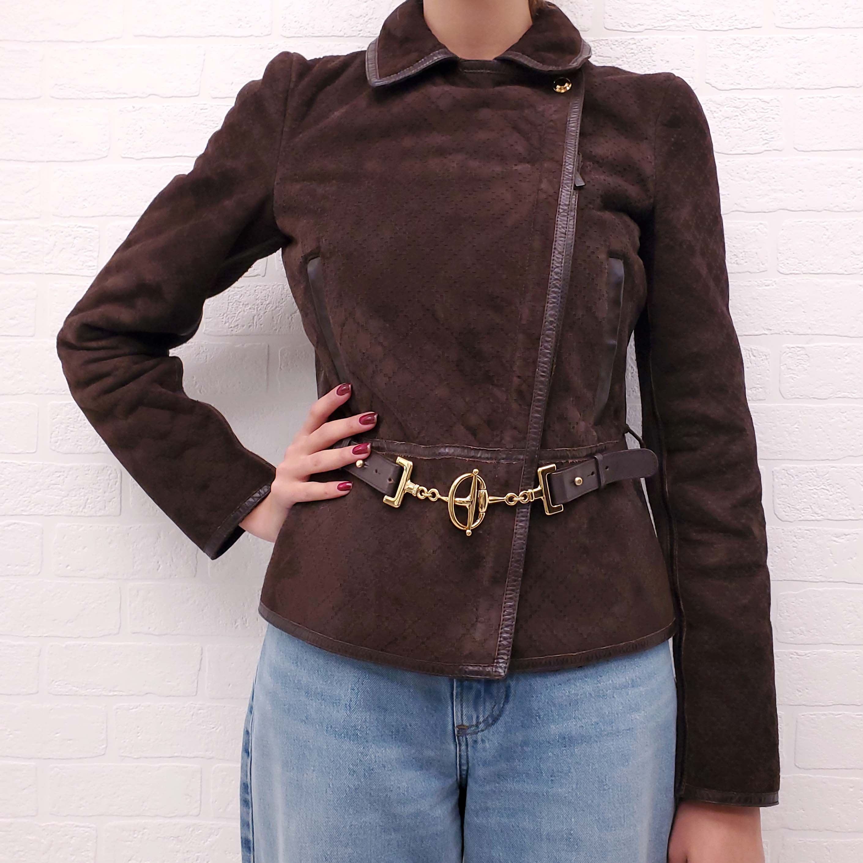 GUCCI BROWN SUEDE JACKET WITH SHEARLING INTERIOR AND HORSEBIT BELT - SIZE 40