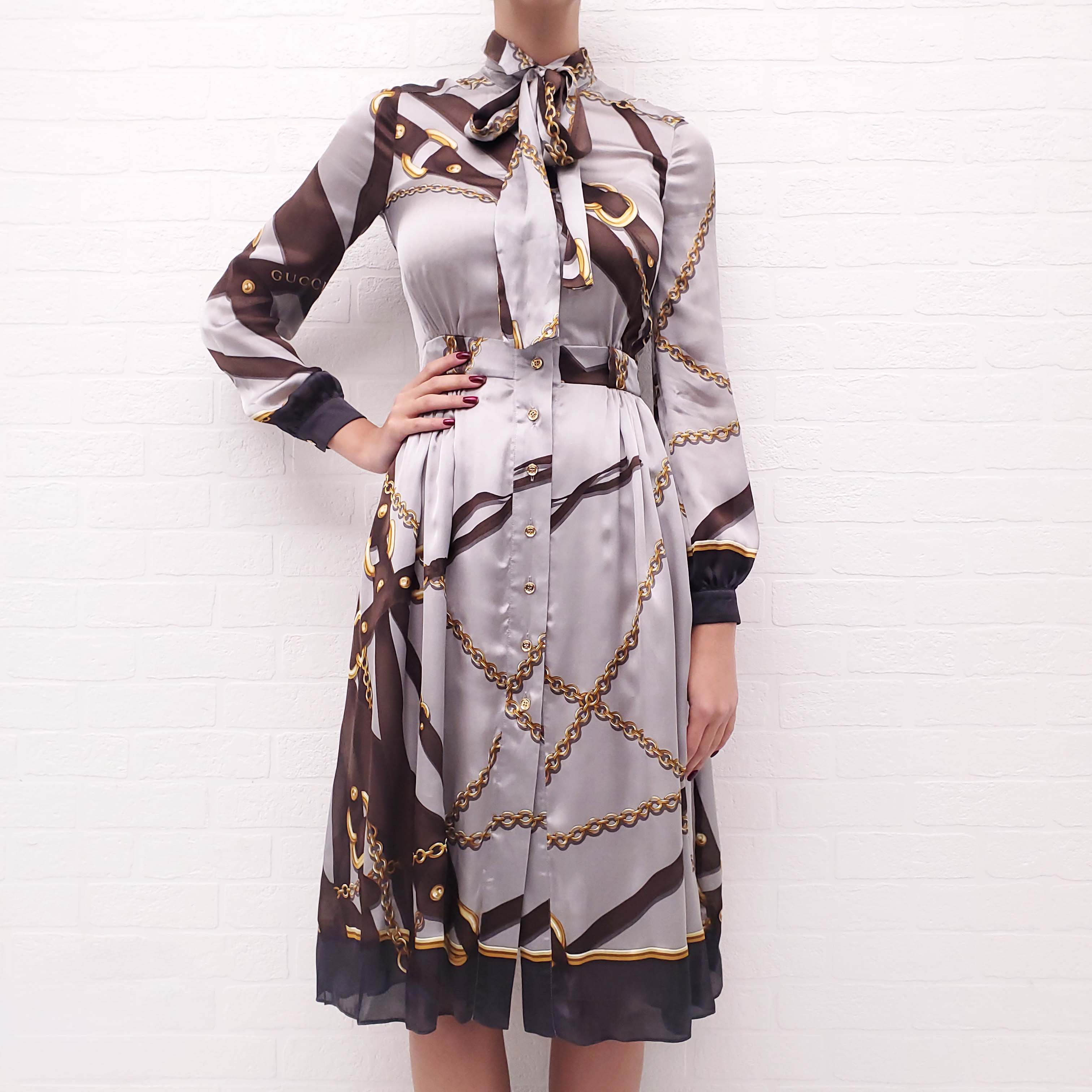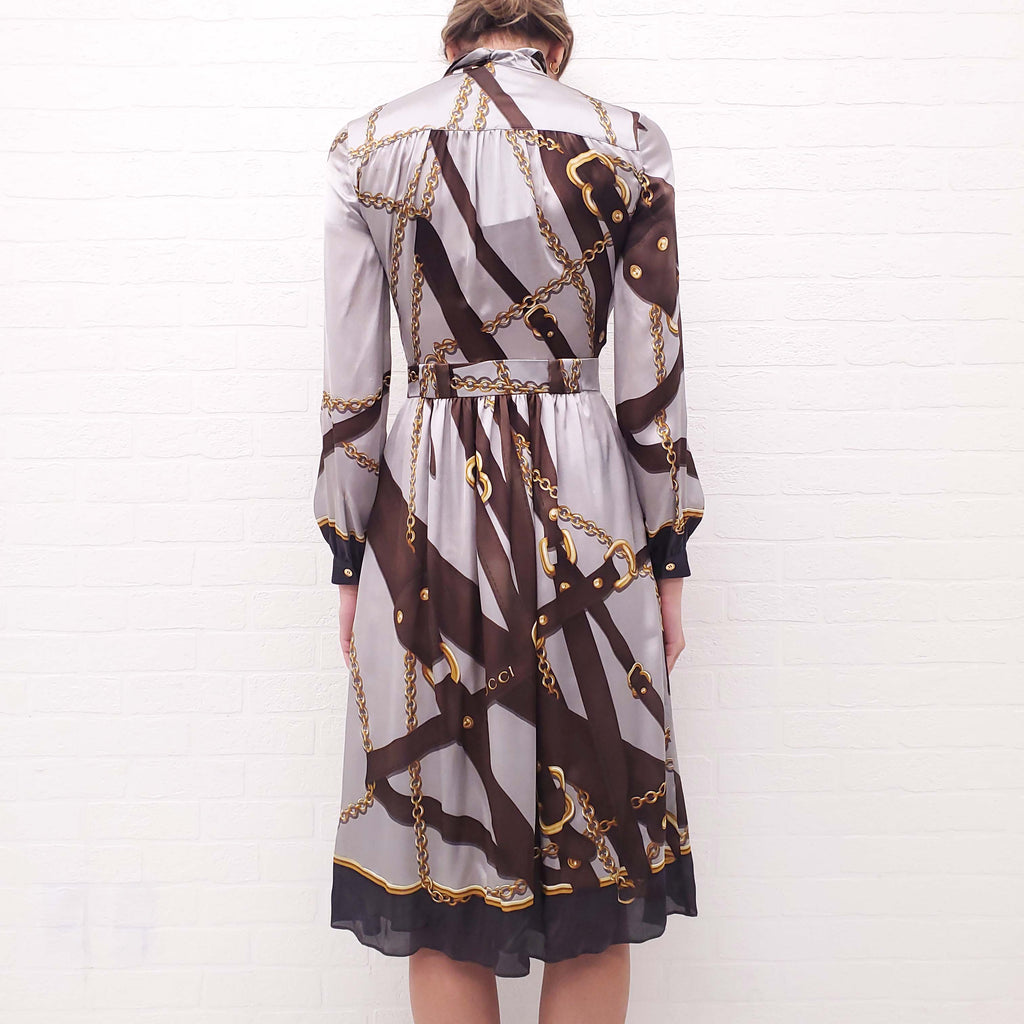 GUCCI GREY SILK CHAIN AND BELT PRINT LOGO DRESS - SIZE 36