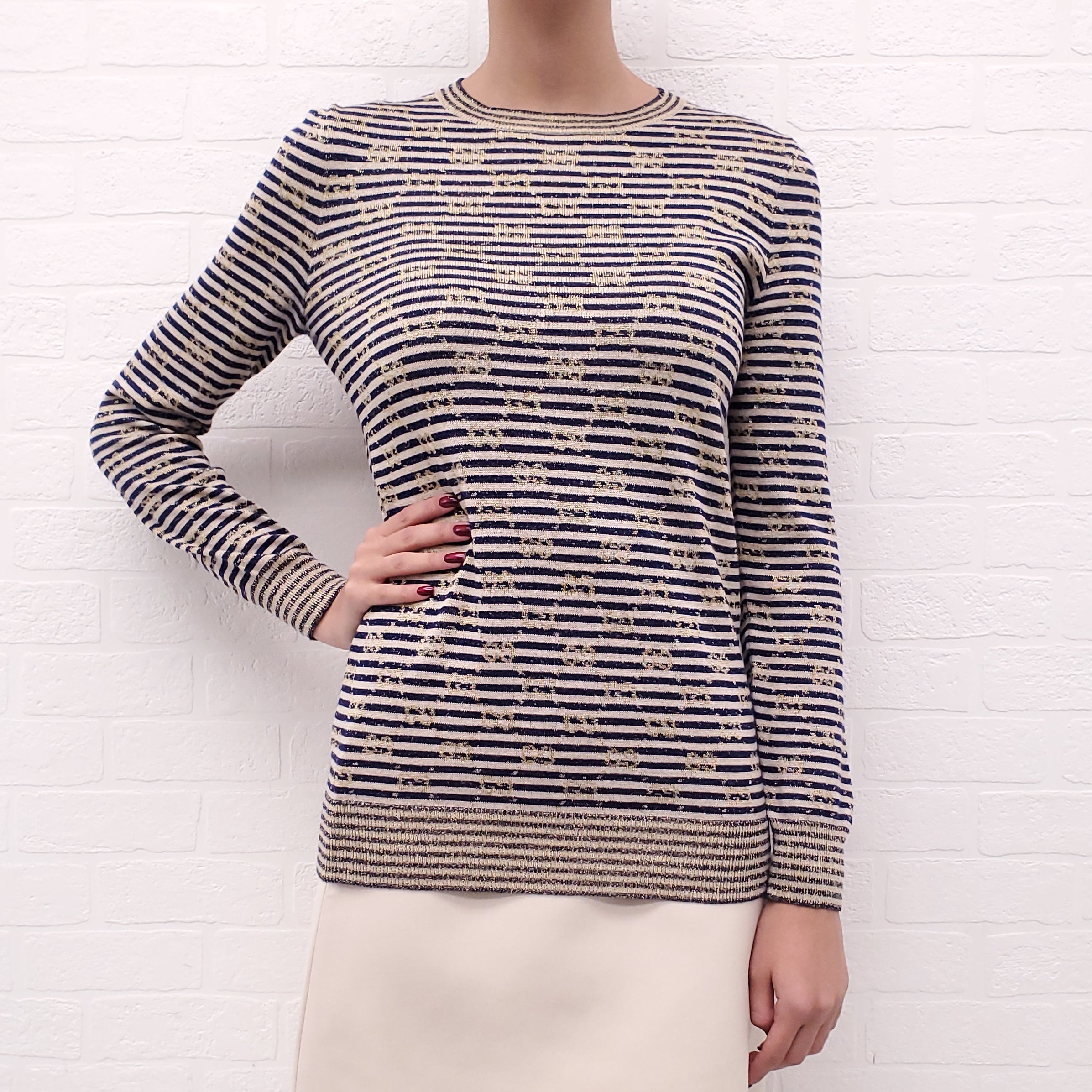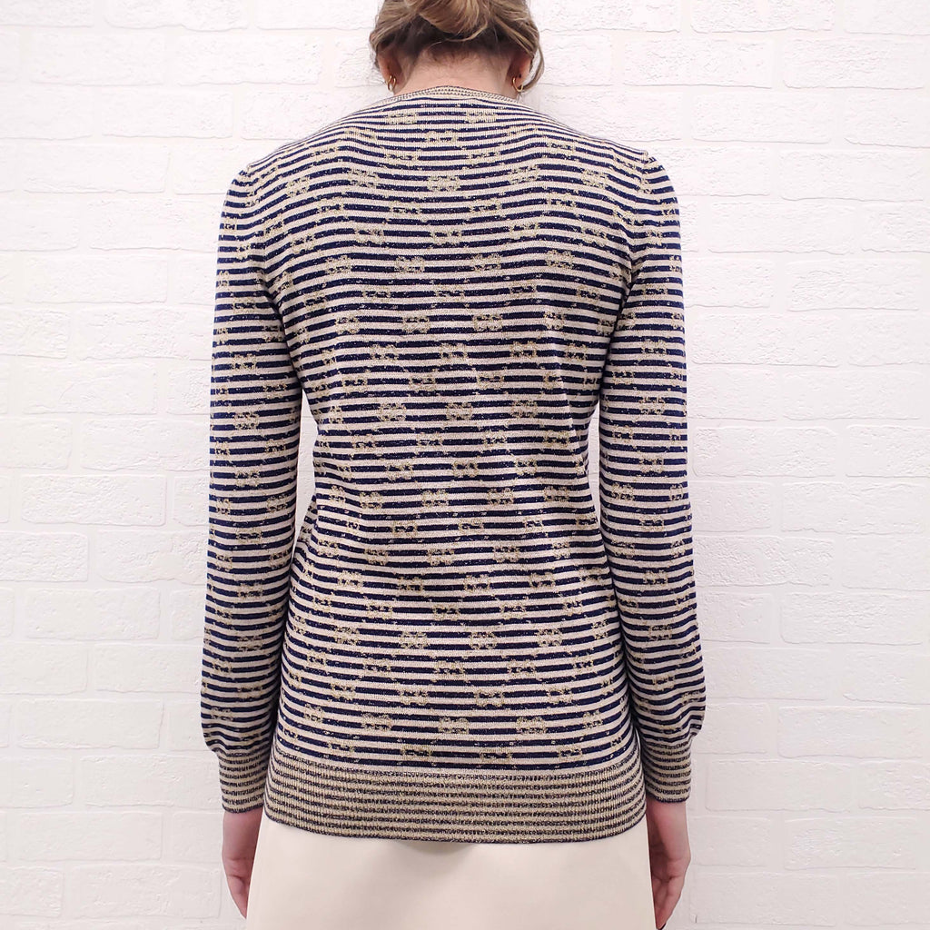 GUCCI TAN AND NAVY STRIPED LOGO SWEATER - SIZE S