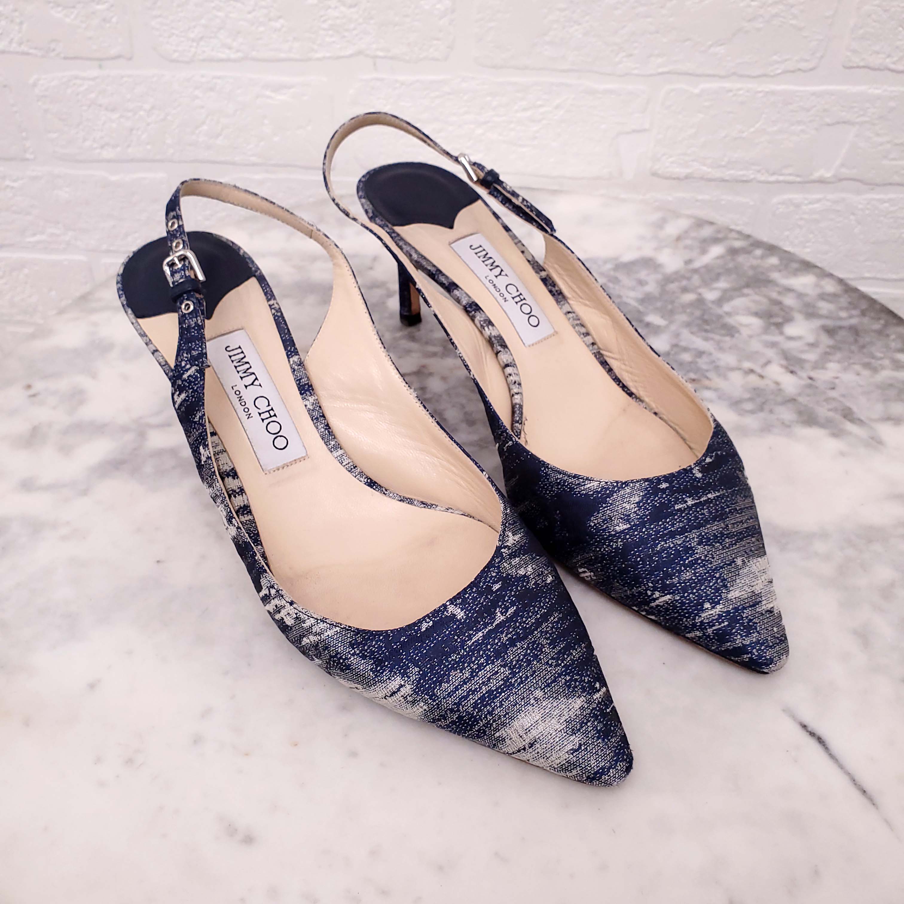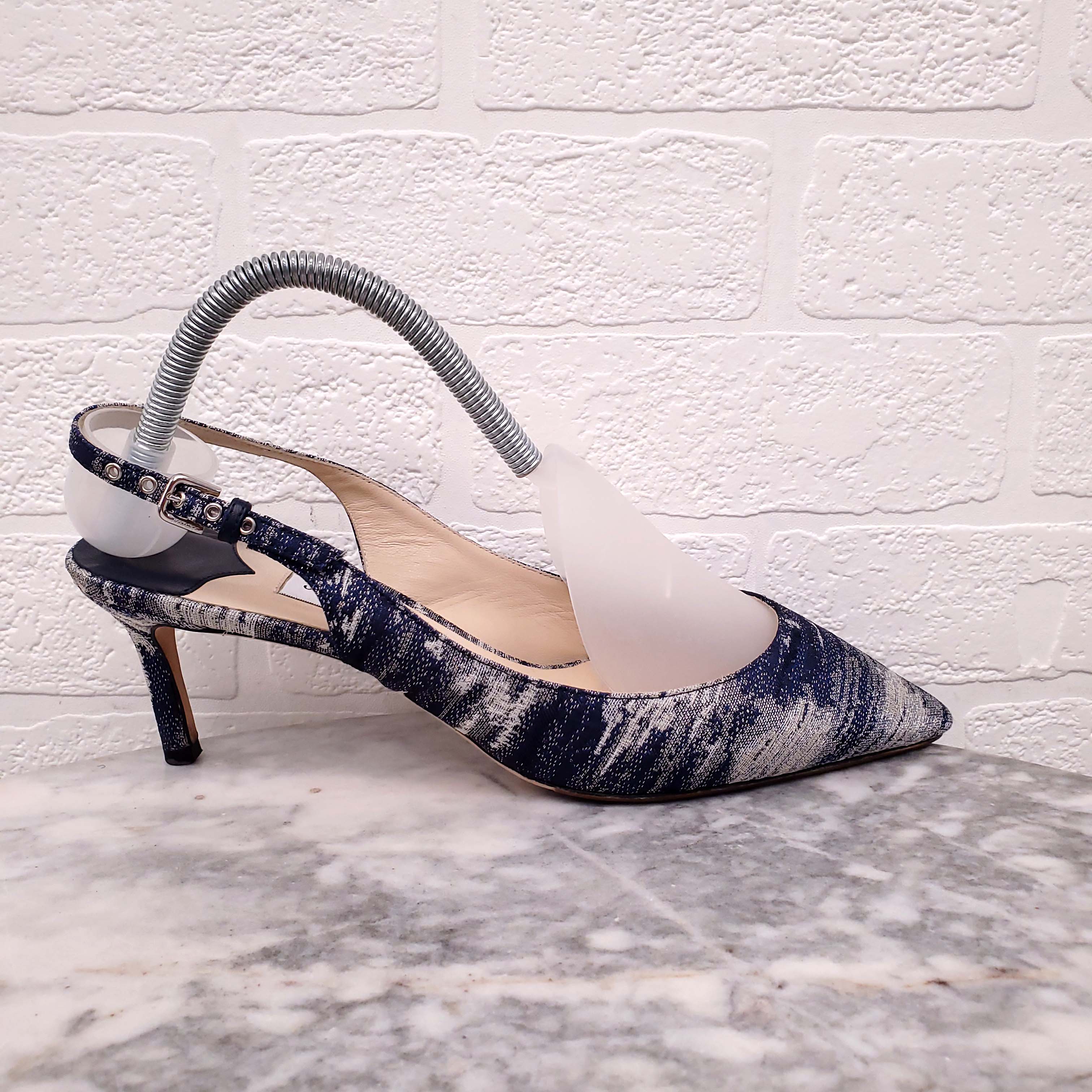 JIMMY CHOO BLUE AND SILVER SLING BACK KITTEN HEEL - SIZE 39.5
