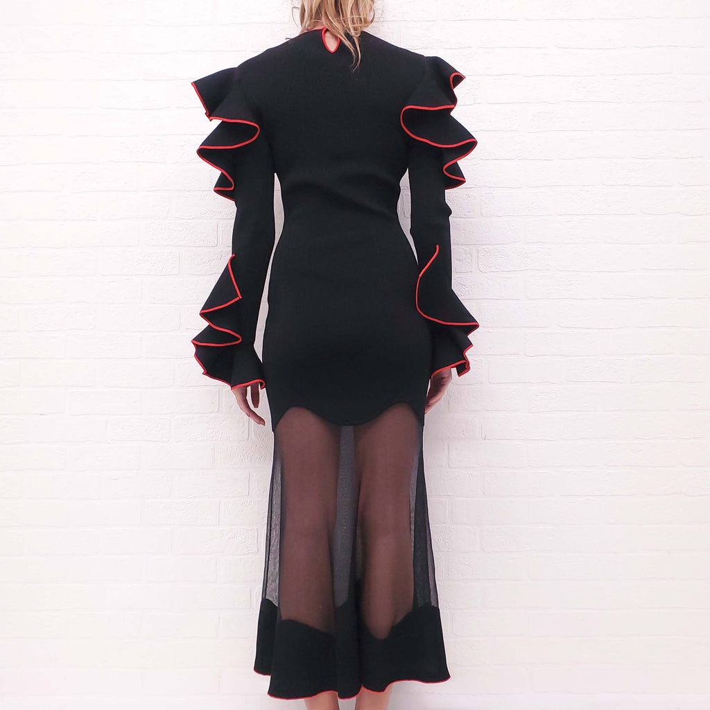 ALEXANDER MCQUEEN BLACK AND RED RUFFLE DRESS WITH SHEER DETAIL - SIZE S