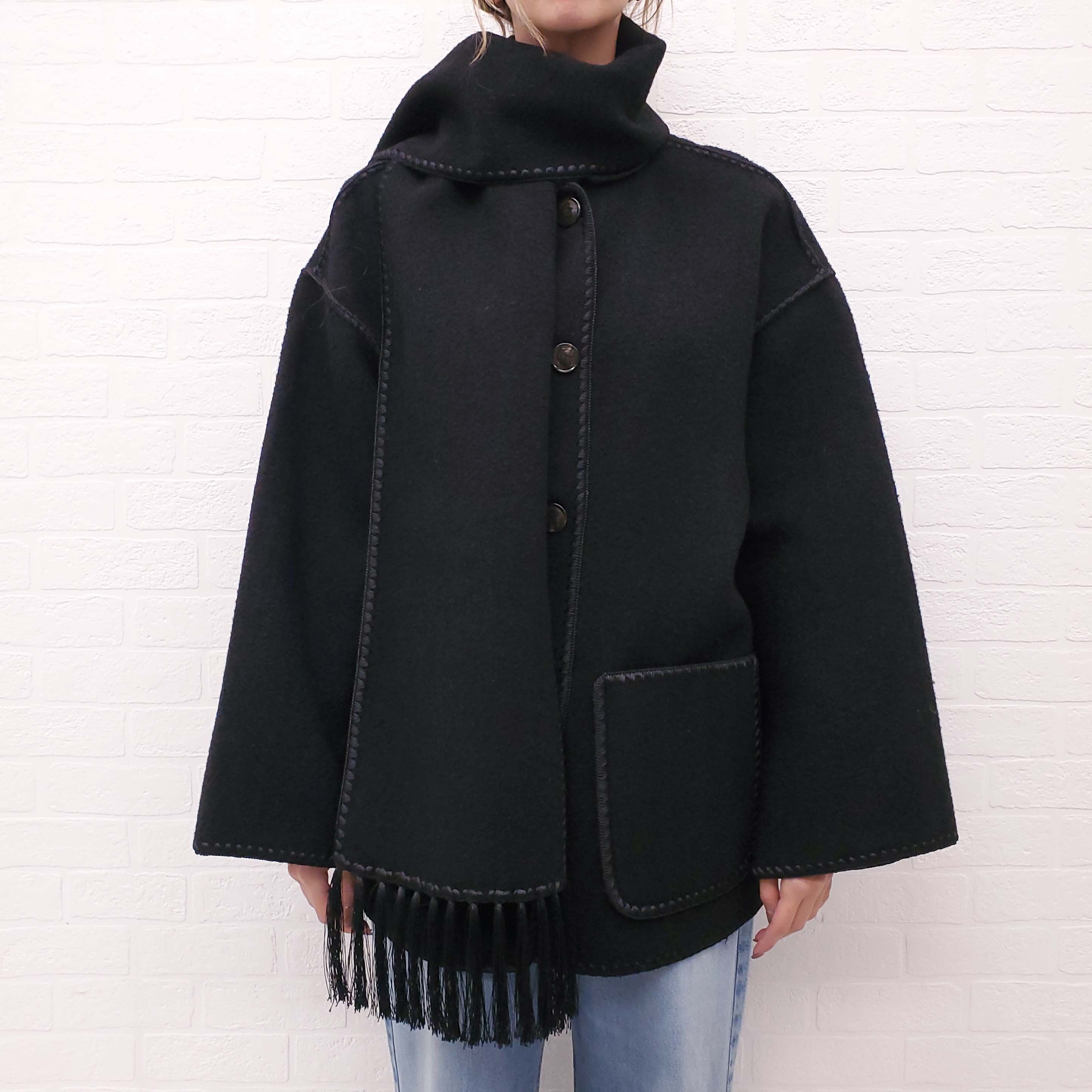 TOTEME BLACK 'DRAPED FRINGED WOOL-BLEND SCARF' JACKET - SIZE 40