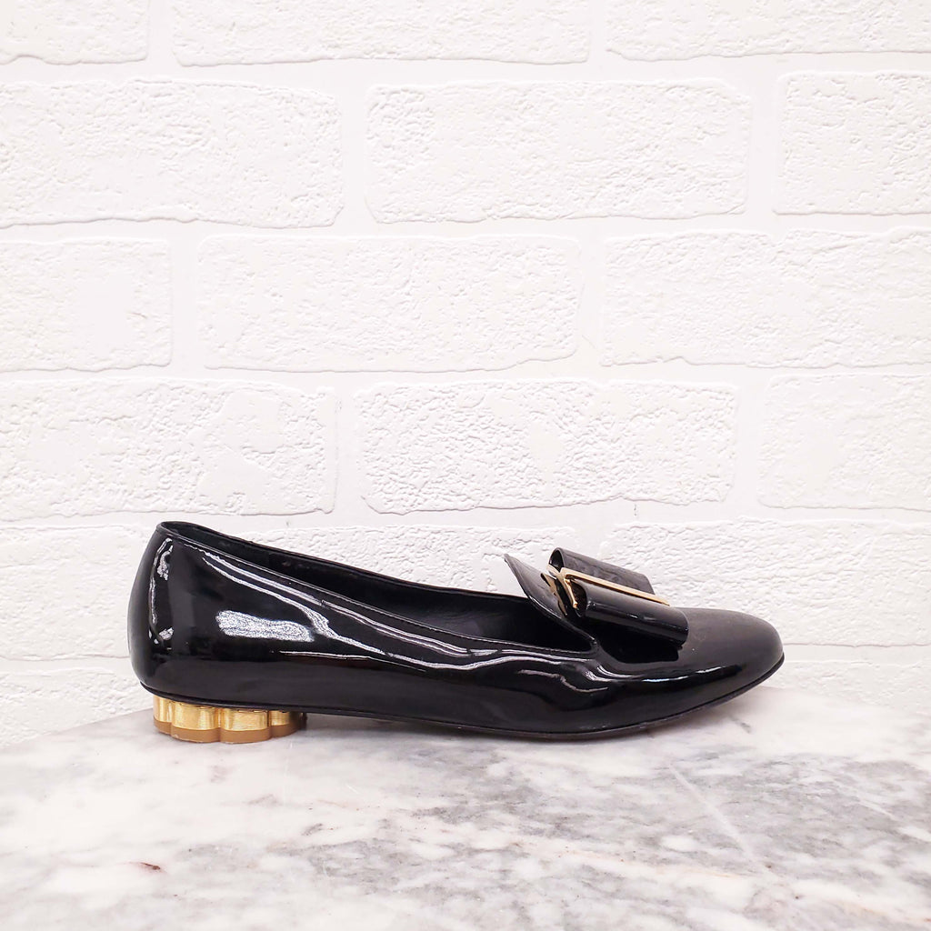 FERRAGAMO BLACK PATENT LOAFERS WITH BOW - SIZE 7B