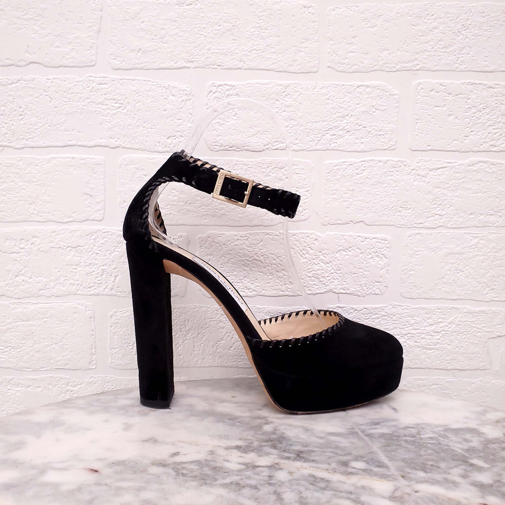 JIMMY CHOO BLACK SUEDE HEELS WITH WOVEN DETAIL - SIZE 37