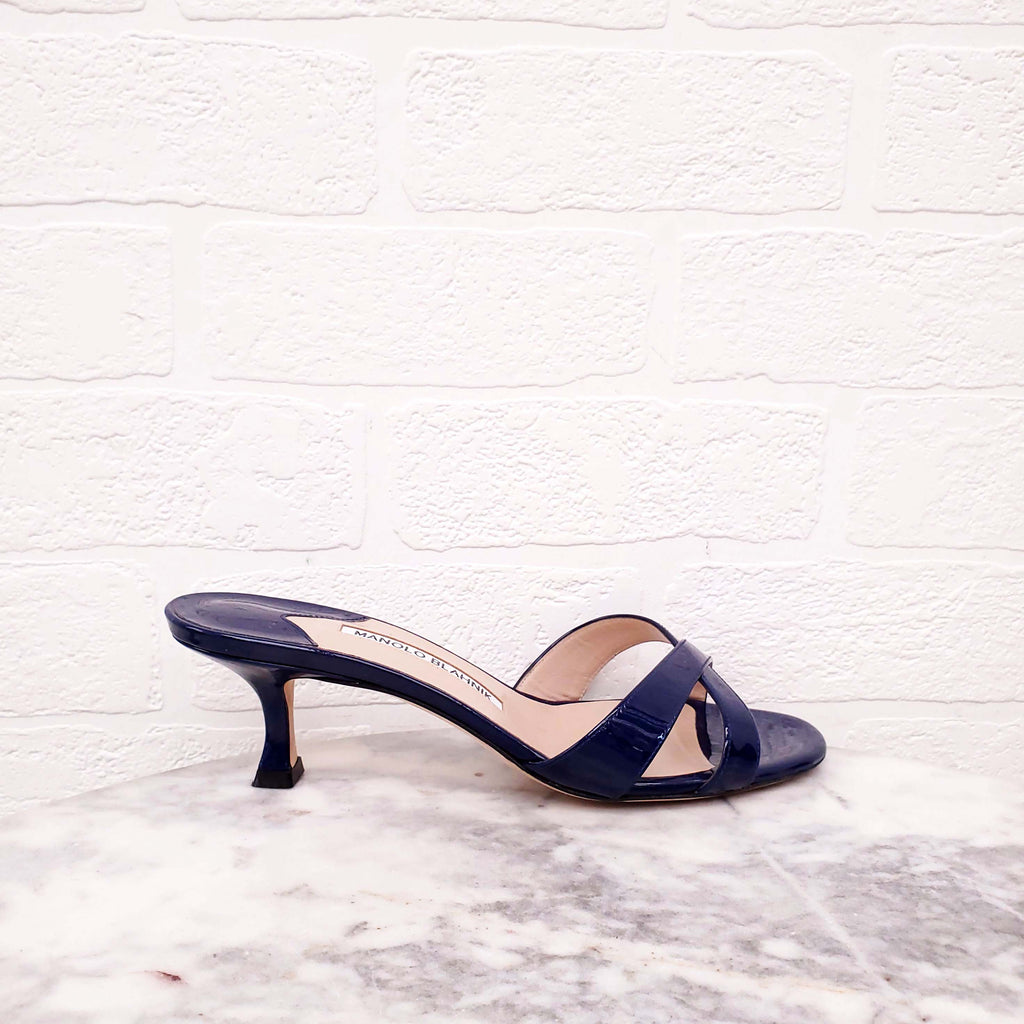 MANOLO BLAHNIK BLUE PATENT KITTEN HEELS - SIZE 37.5