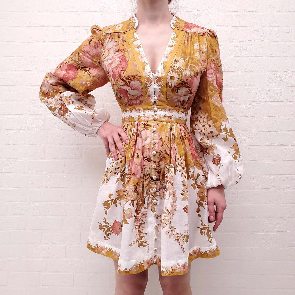 ZIMMERMANN MUSTARD AND YELLOW FLORAL PATTIE PLUNGE DRESS - SIZE 2