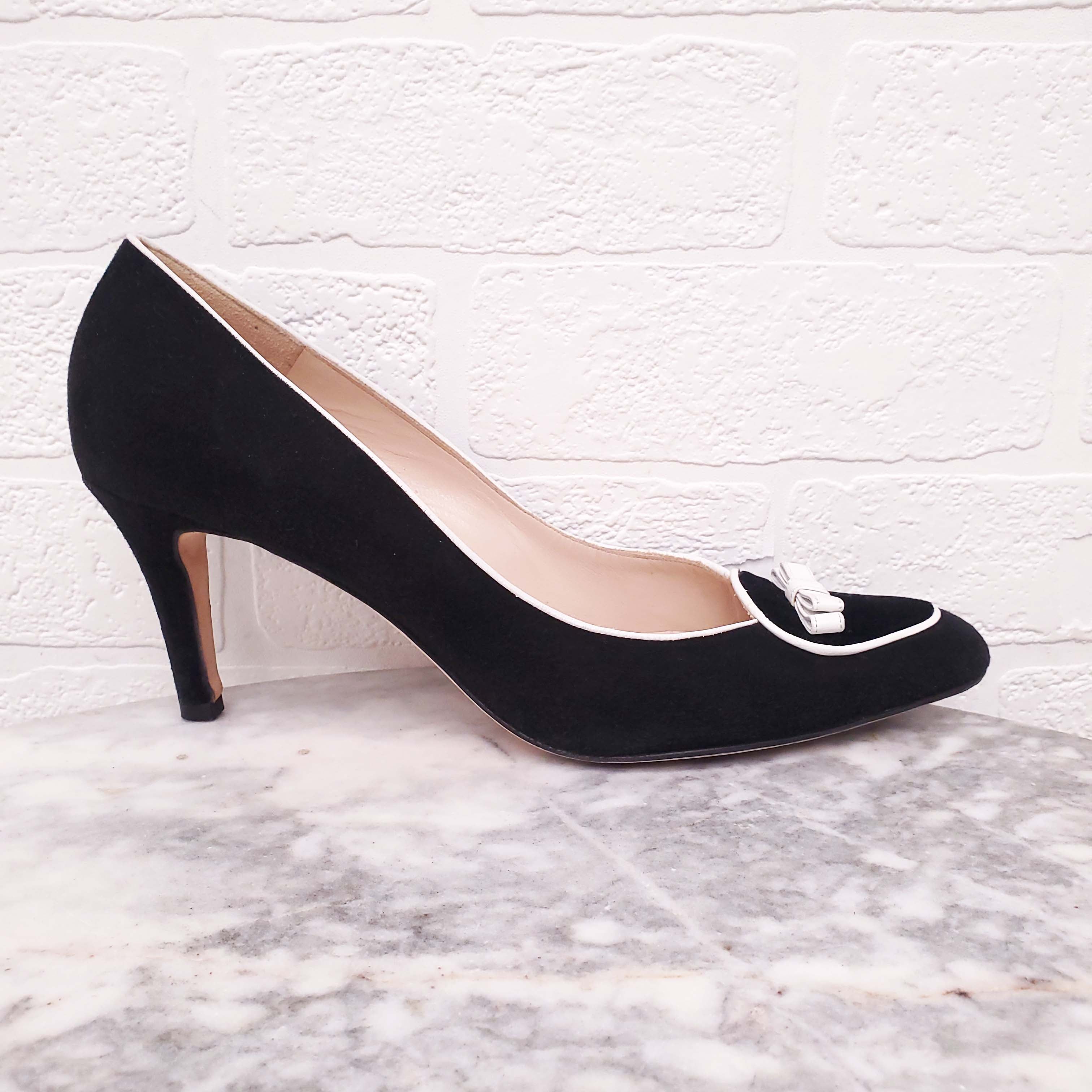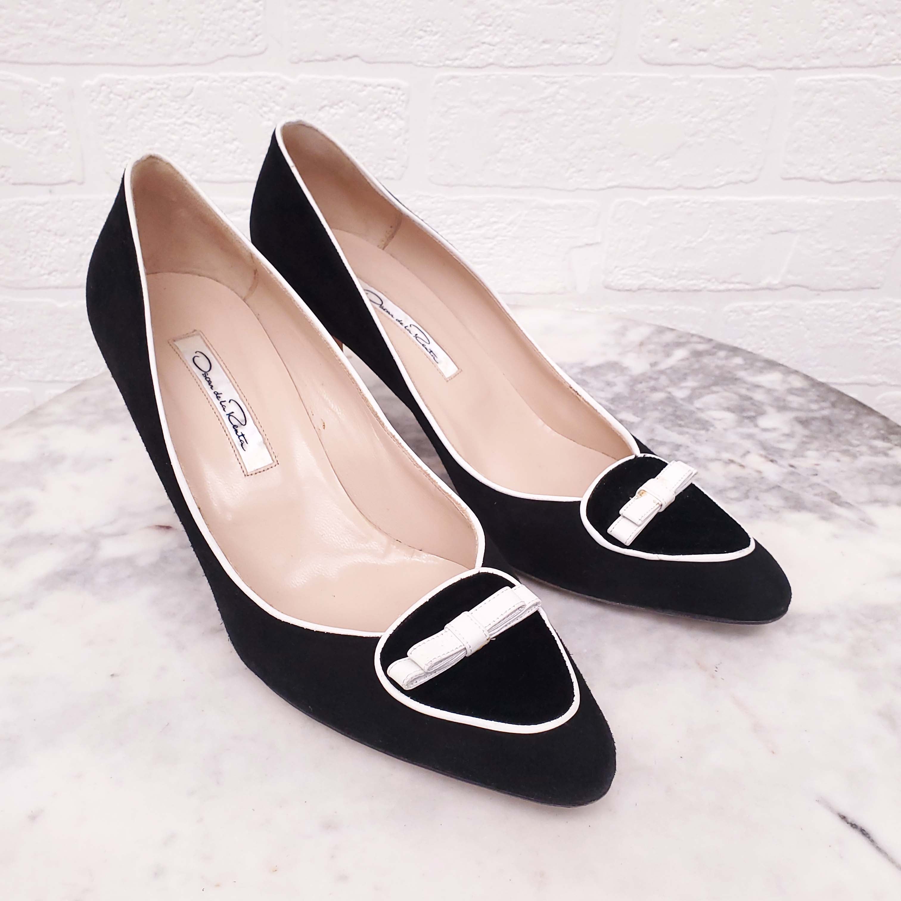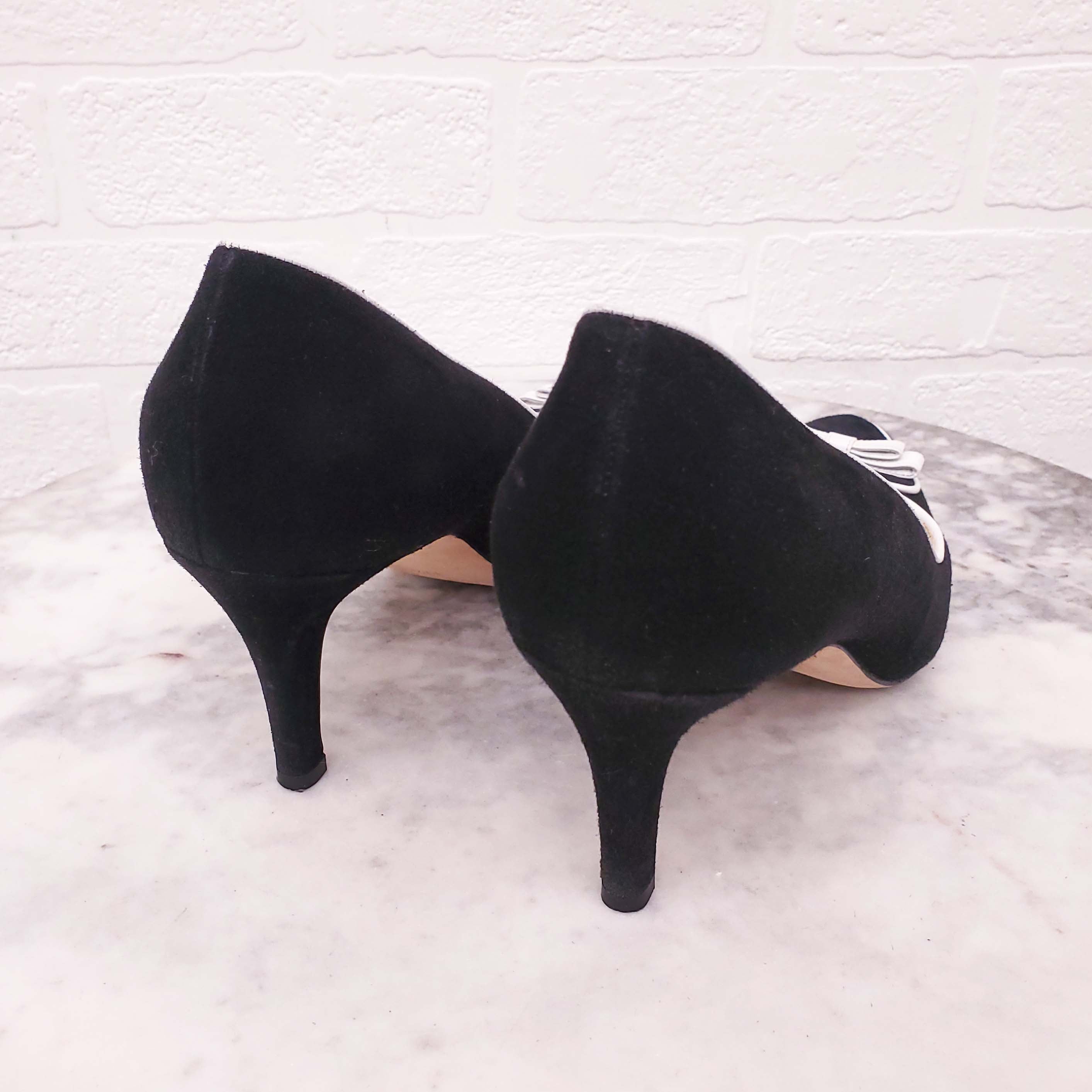 OSCAR DE LA RENTA BLACK SUEDE HEELS WITH WHITE BOW - SIZE 39.5