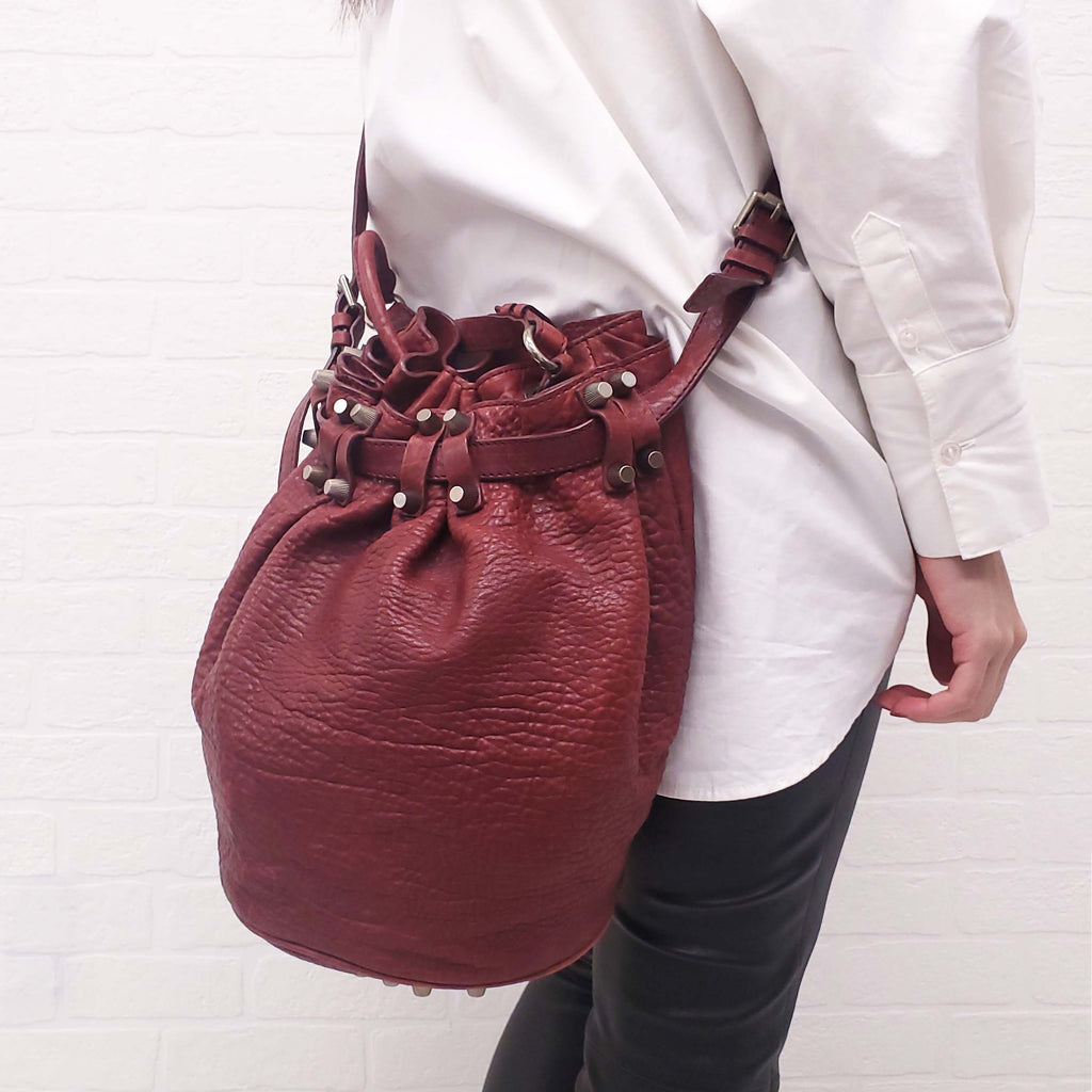 ALEXANDER WANG BURGUNDY LEATHER 'ROCCO' BUCKET BAG WITH GOLD STUDS