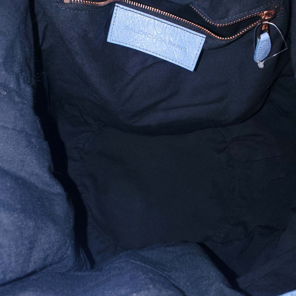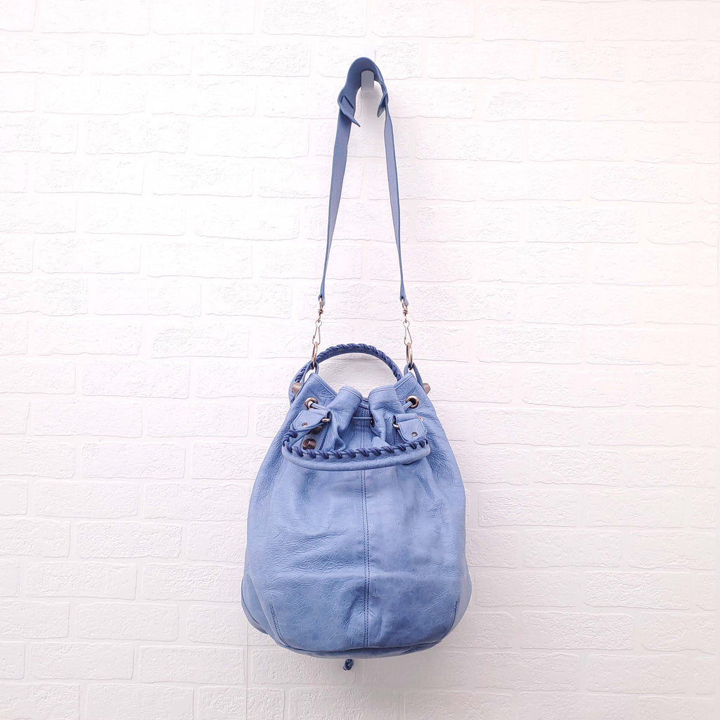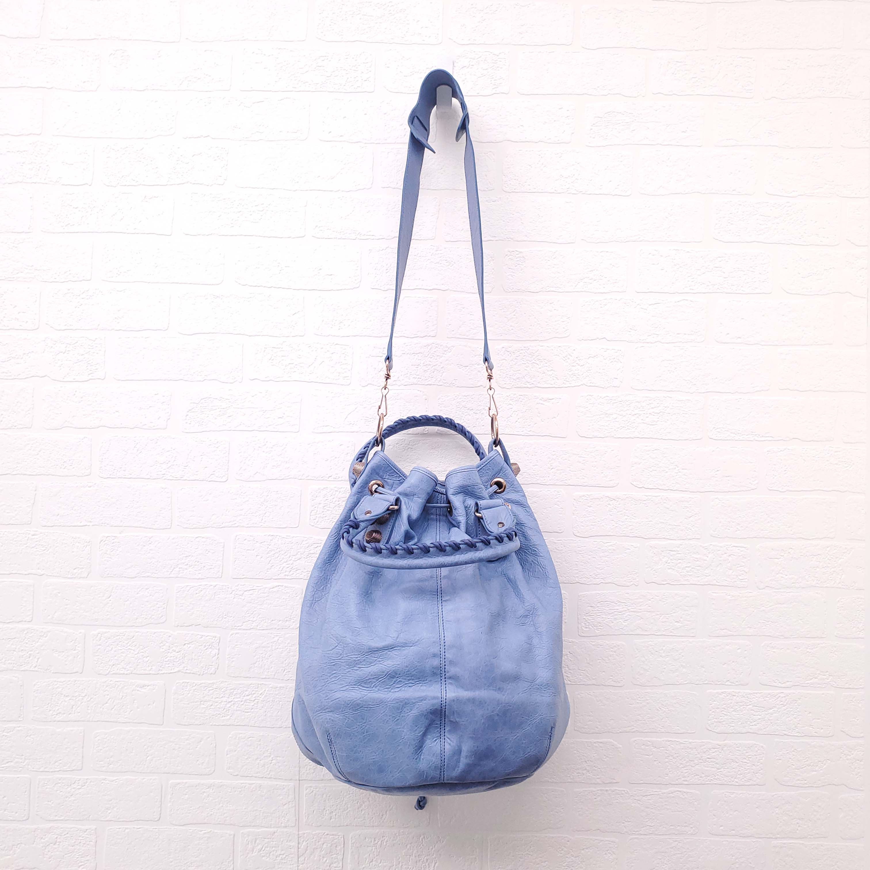 BALENCIAGA BLUE GIANT 'MOTOCROSS CITY' BUCKET BAG WITH ROSE GOLD GROMMETS
