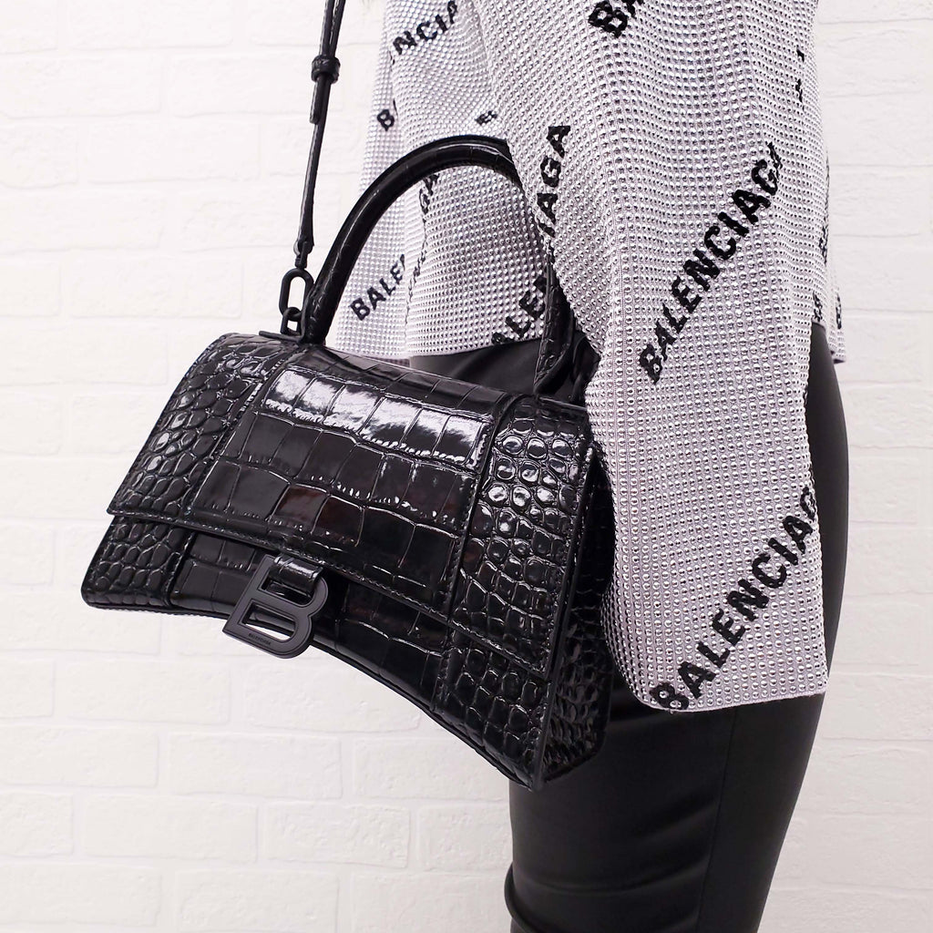 BALENCIAGA BLACK CROC EMBOSSED 'HOURGLASS' BAG