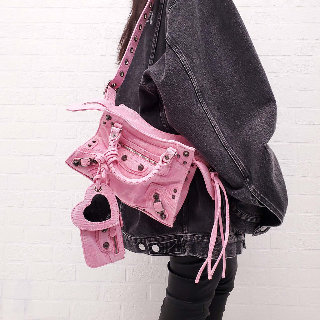 BALENCIAGA PINK ACID WASH DENIM LOGO 'NEO CAGOLE XS' BAG