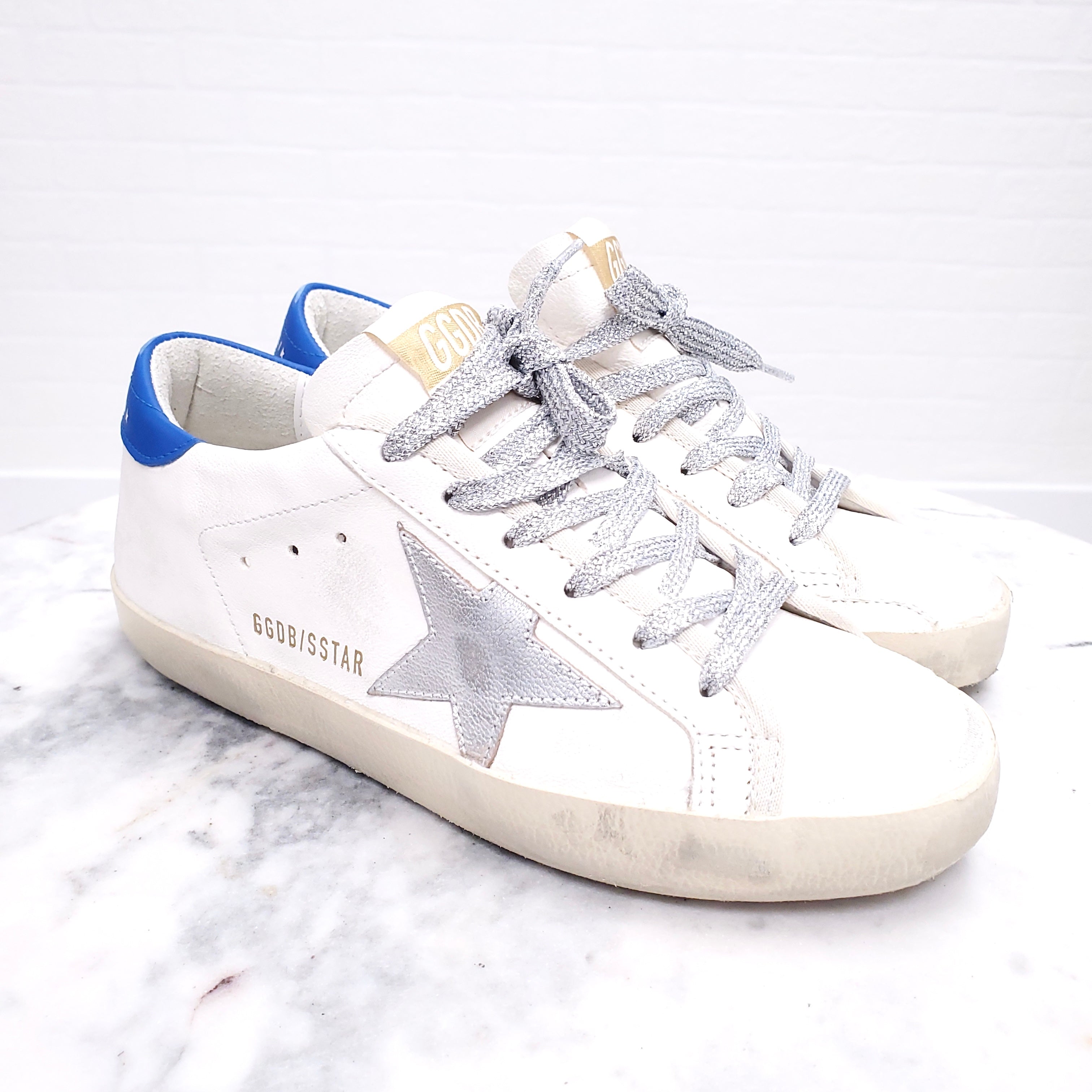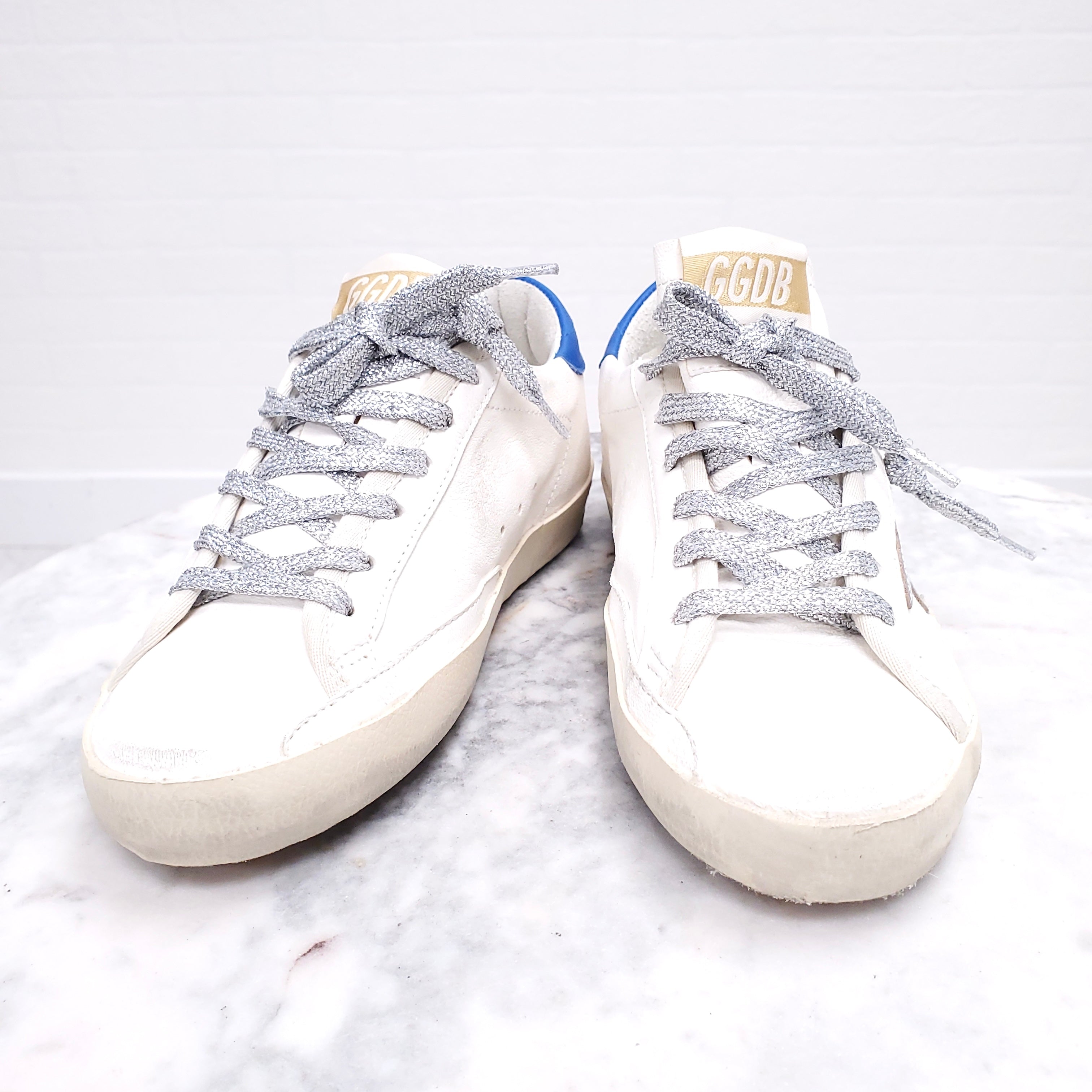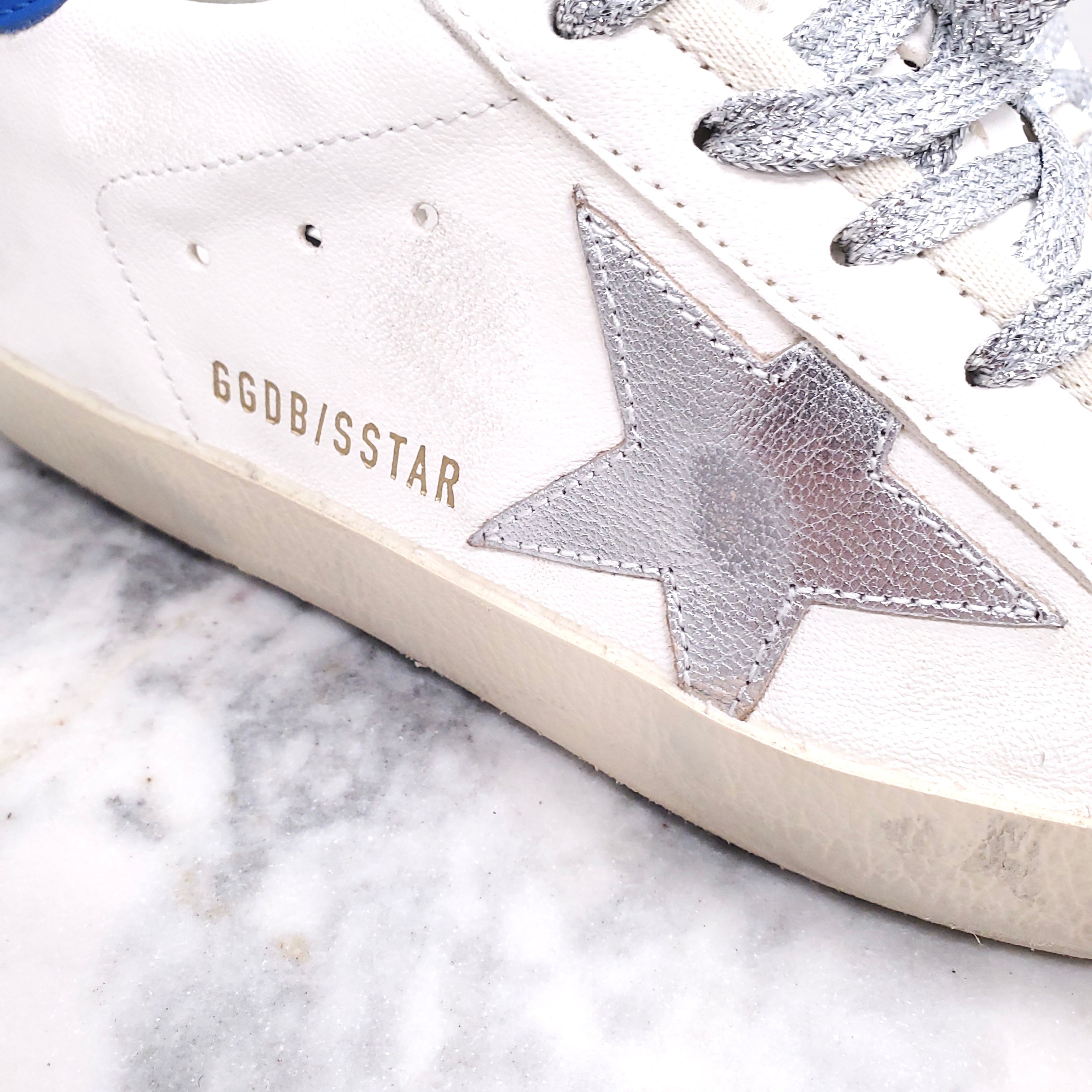 GOLDEN GOOSE CREAM, SILVER, AND BLUE SUPERSTARS - SIZE 35