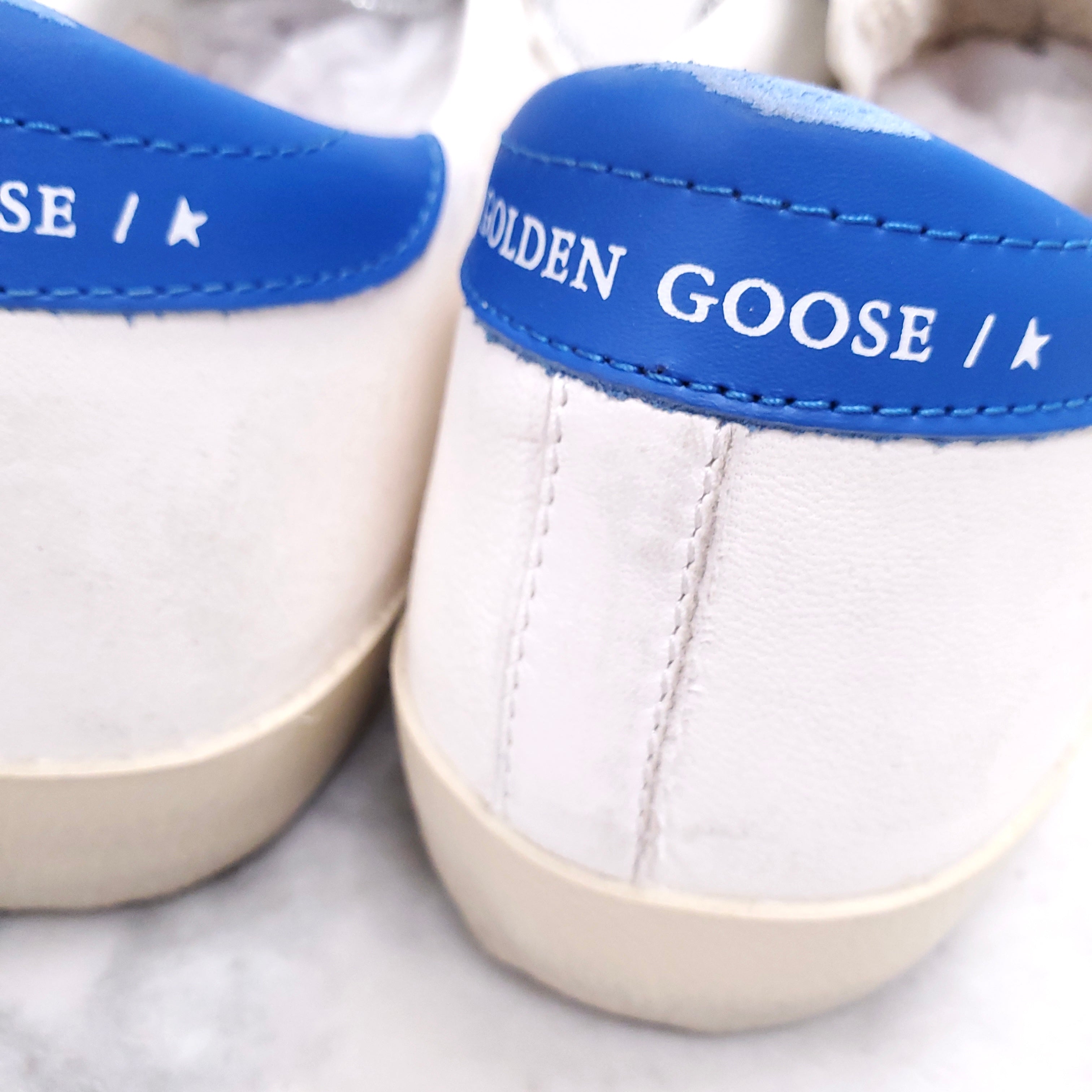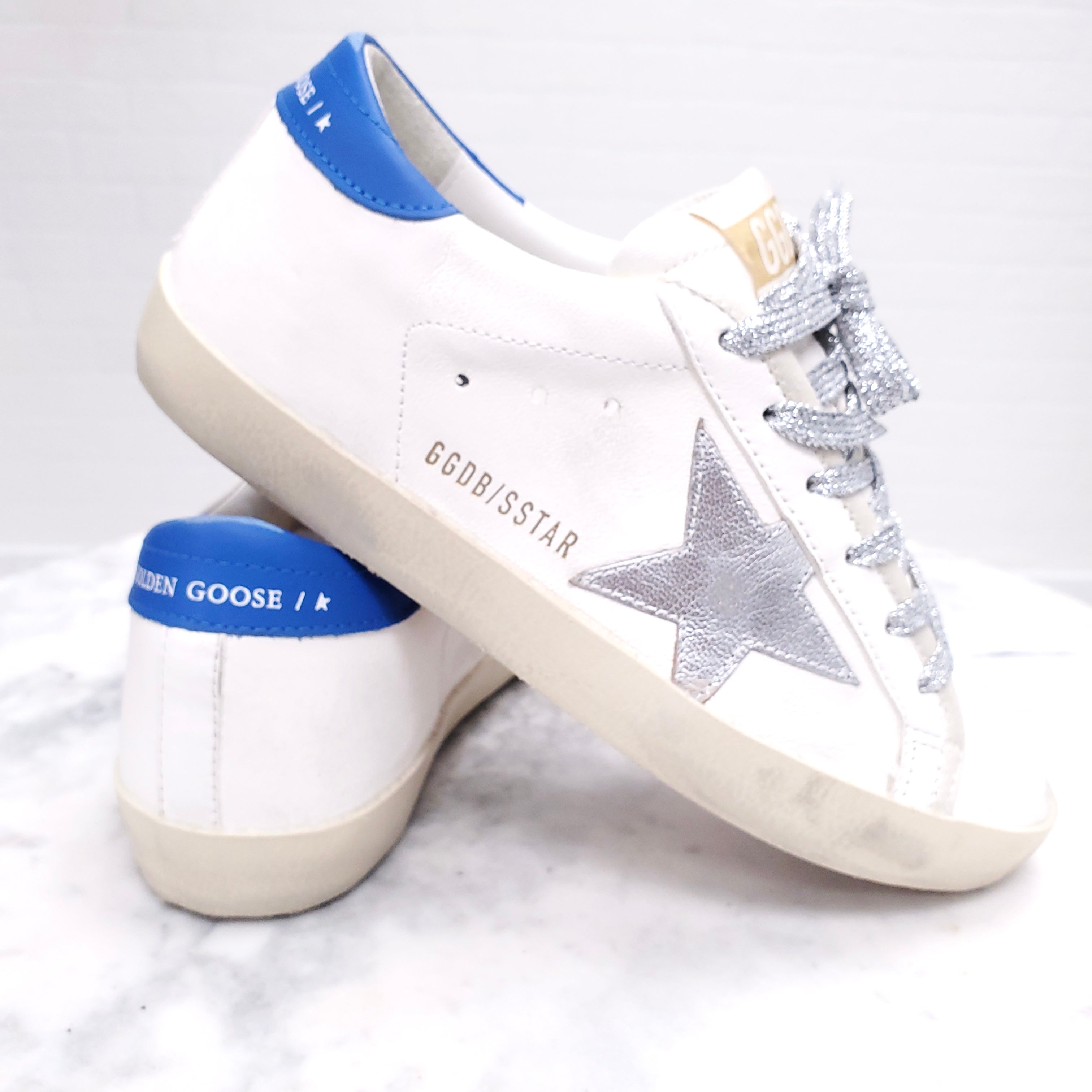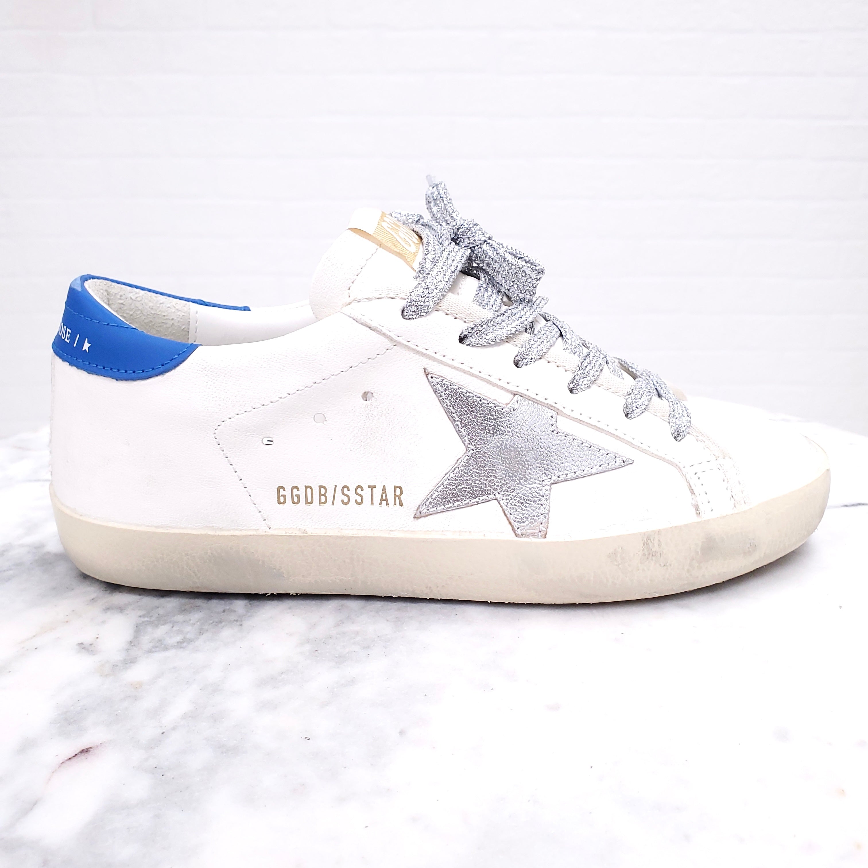 GOLDEN GOOSE CREAM, SILVER, AND BLUE SUPERSTARS - SIZE 35