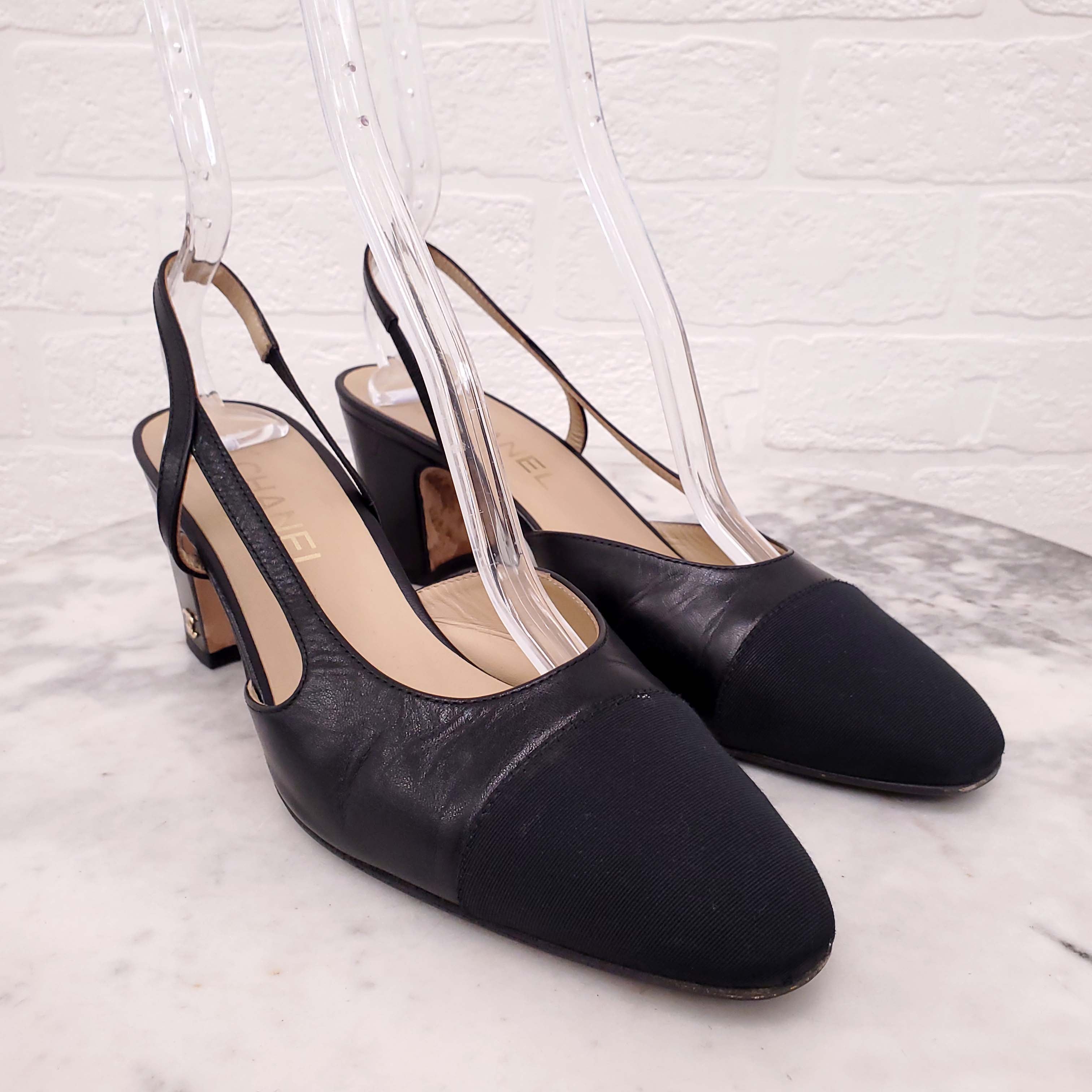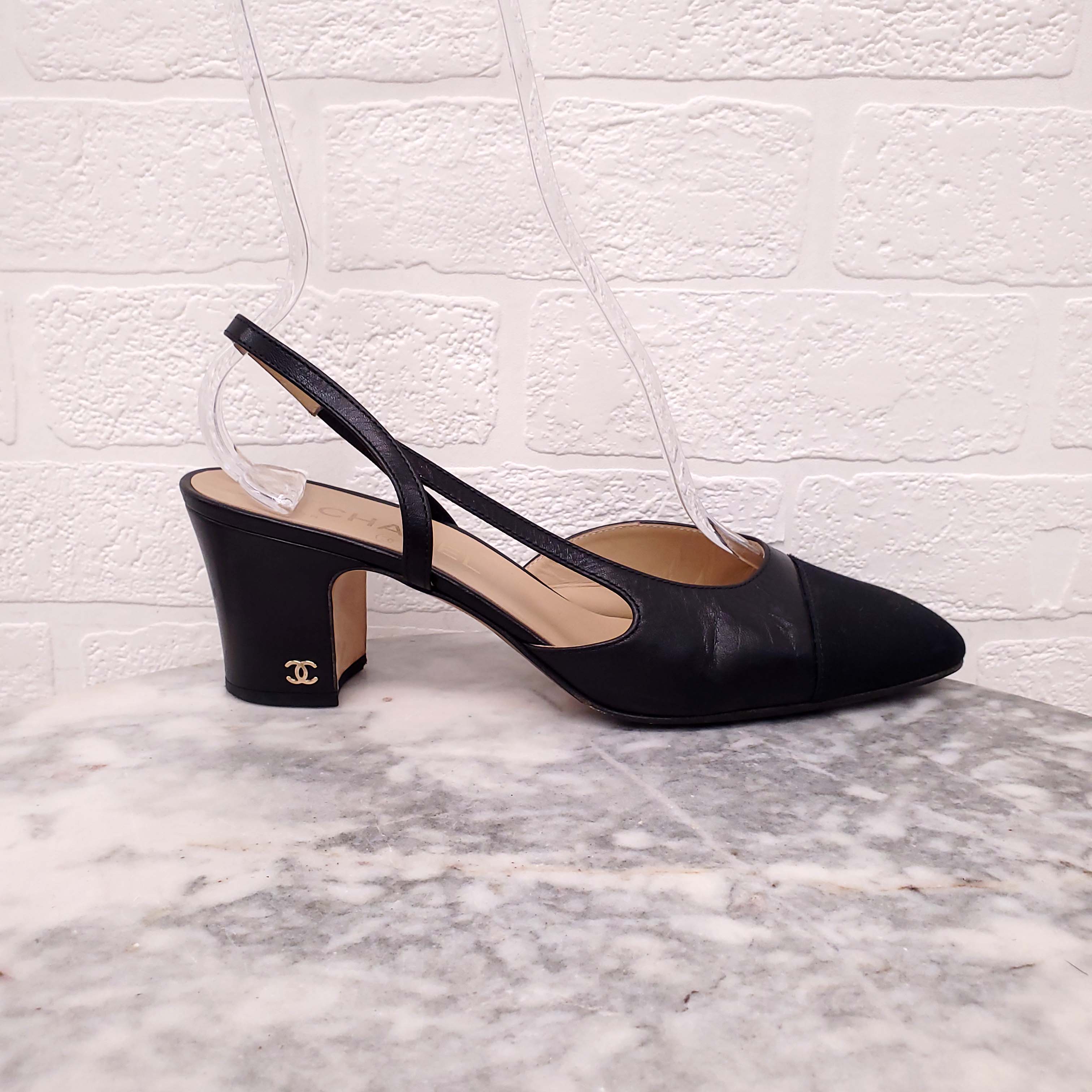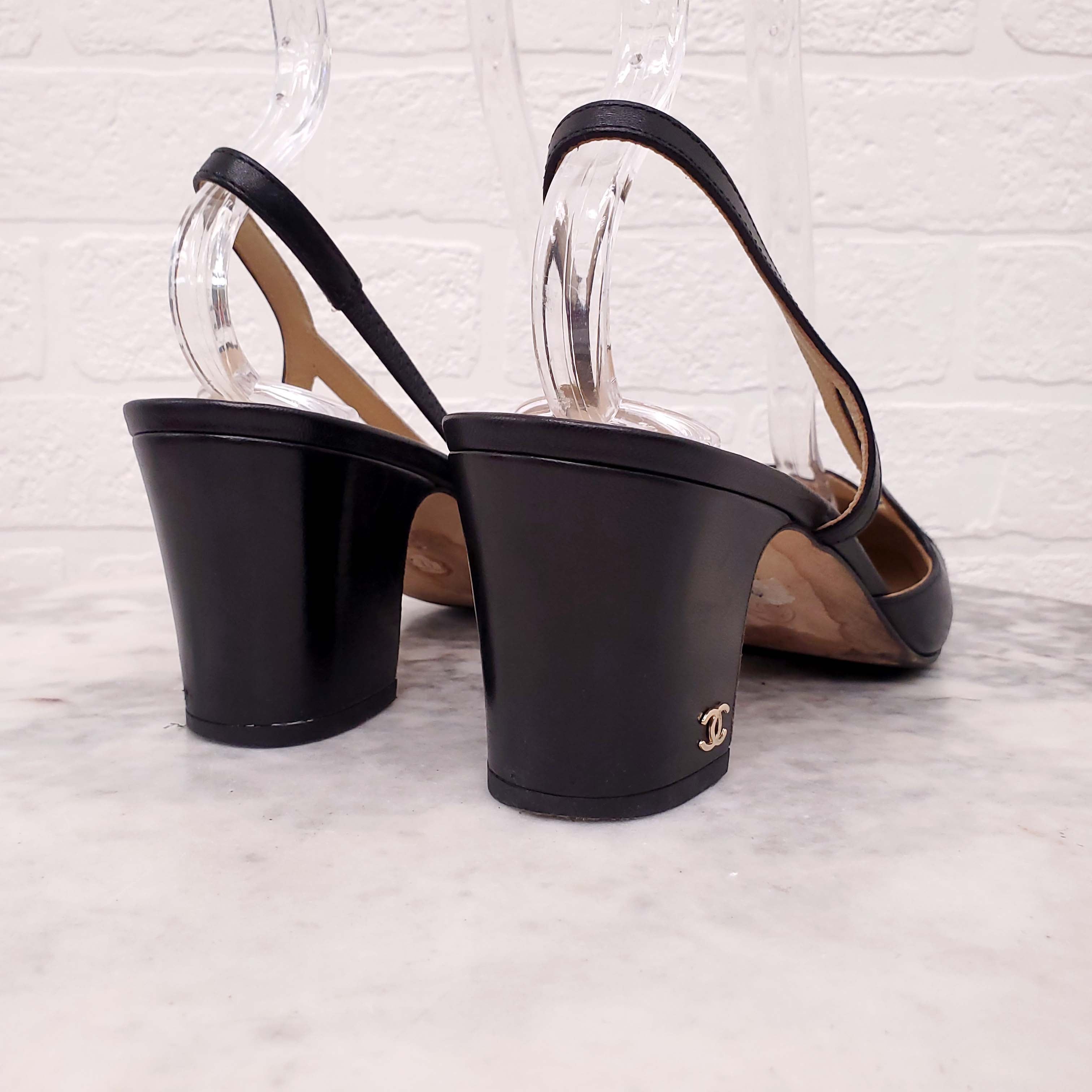 CHANEL BLACK CAP TOE SLINGBACKS - SIZE 39.5