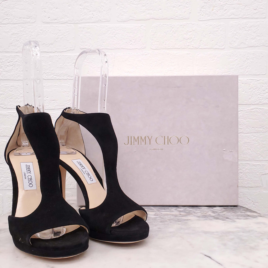 JIMMY CHOO BLACK SUEDE 'LANA 100' T-STRAP HEELS - SIZE 40