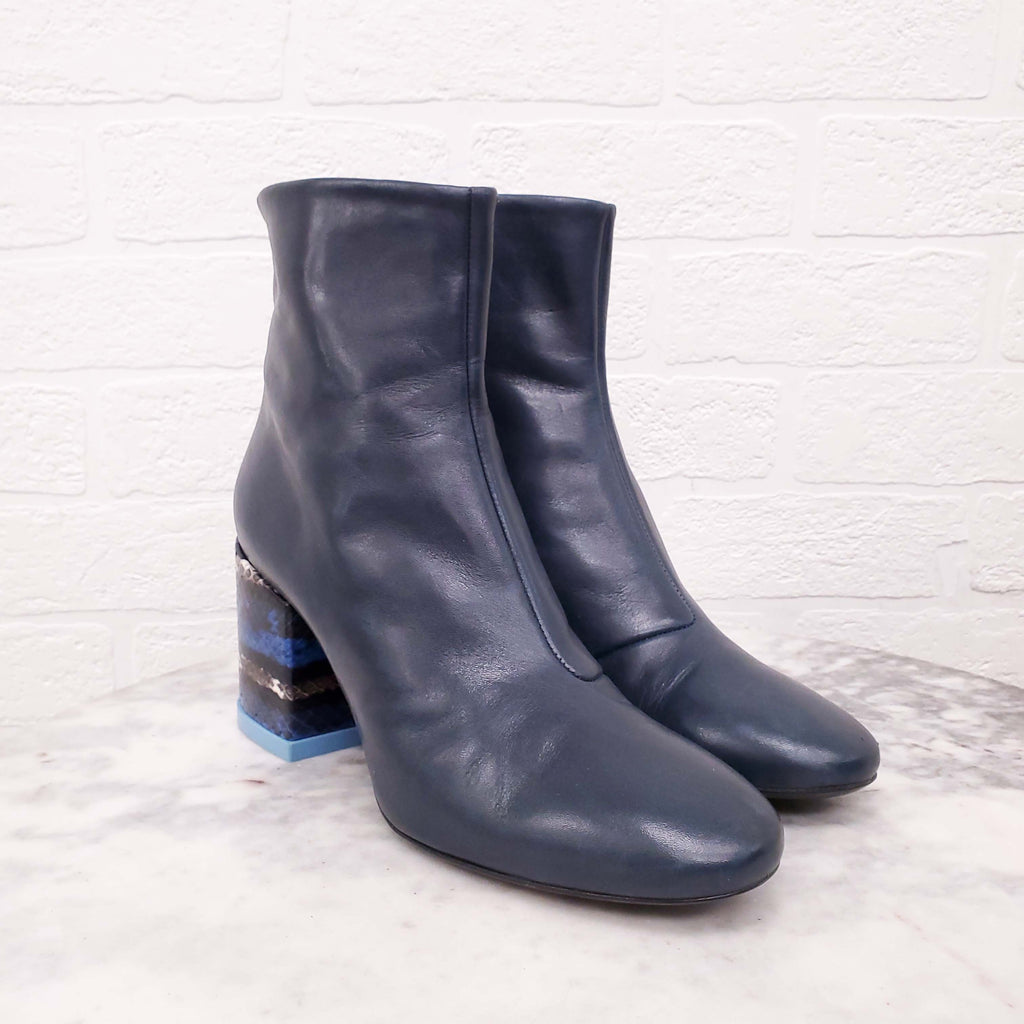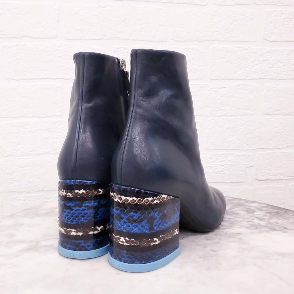 KENZO BLUE LEATHER BOOTS WITH SNAKESKIN BLOCK HEEL - SIZE 38