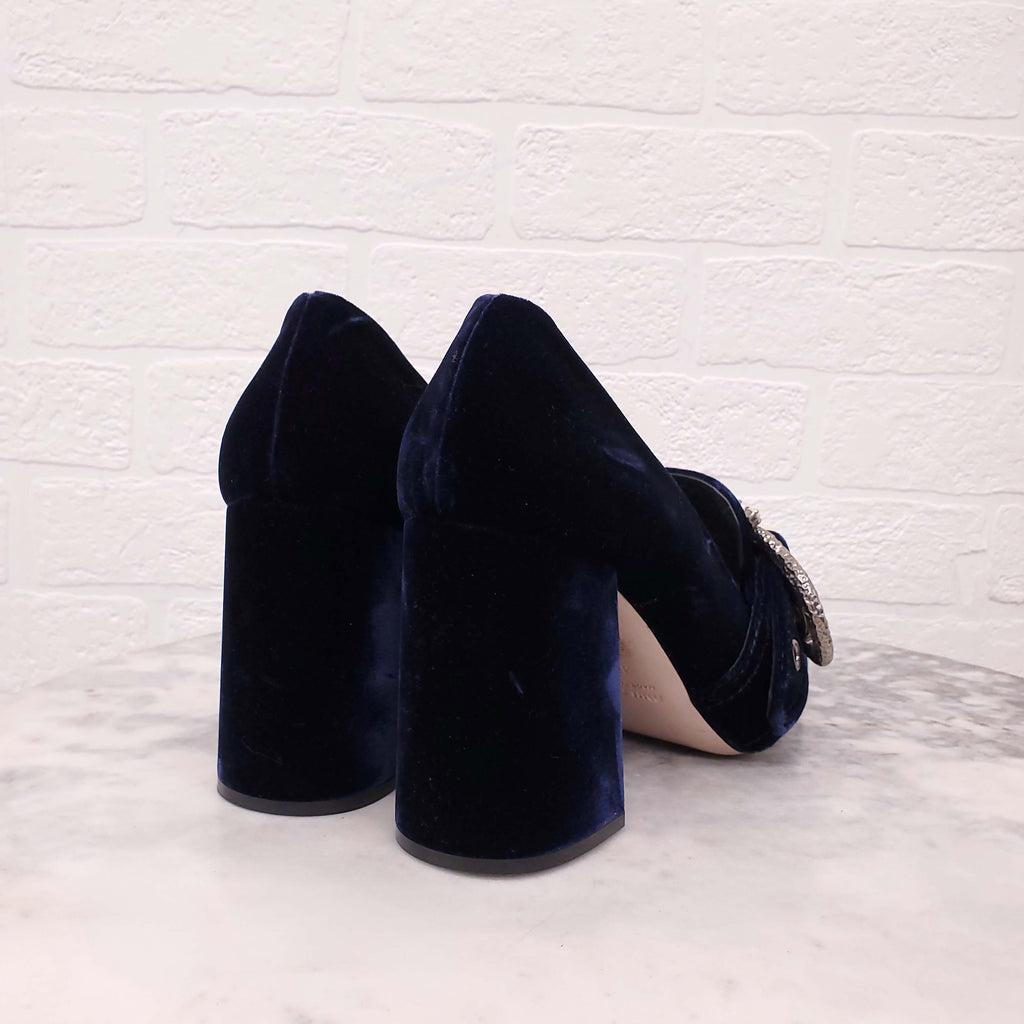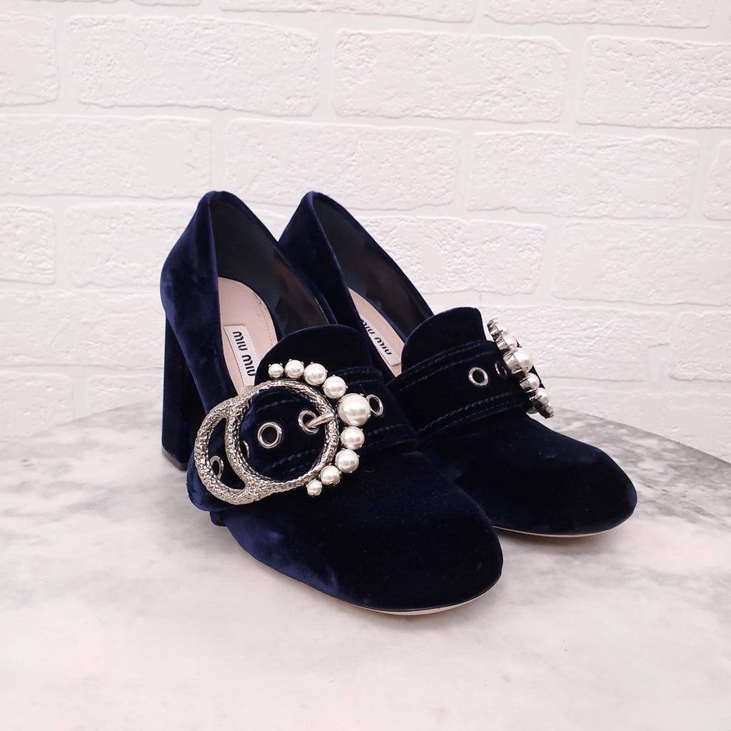 MIU MIU NAVY VELVET LOAFERS WITH BLOCK HEEL AND PEARL BUCKLE DETAIL - SIZE 38.5