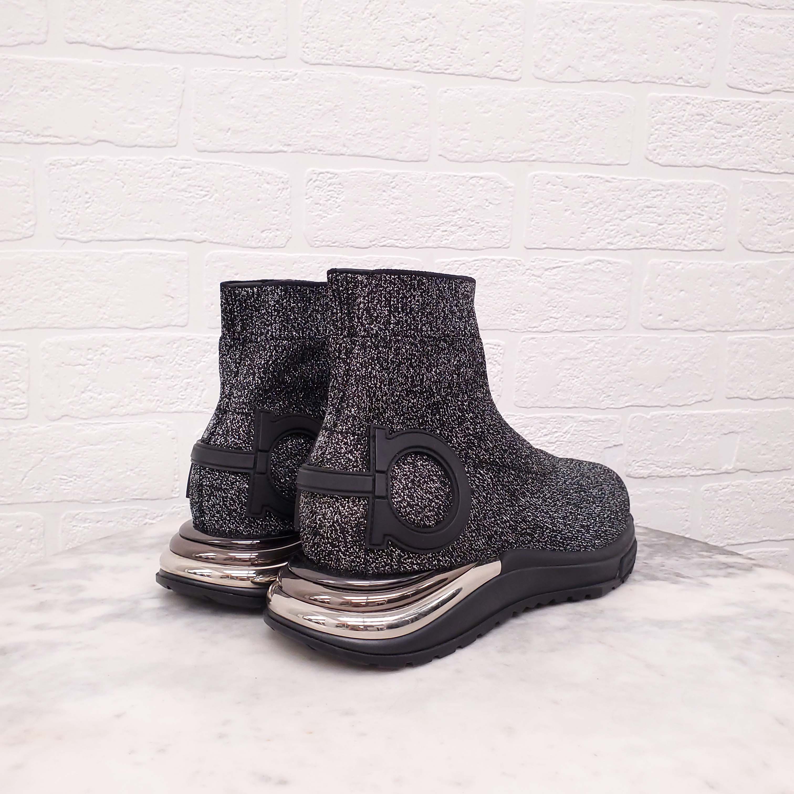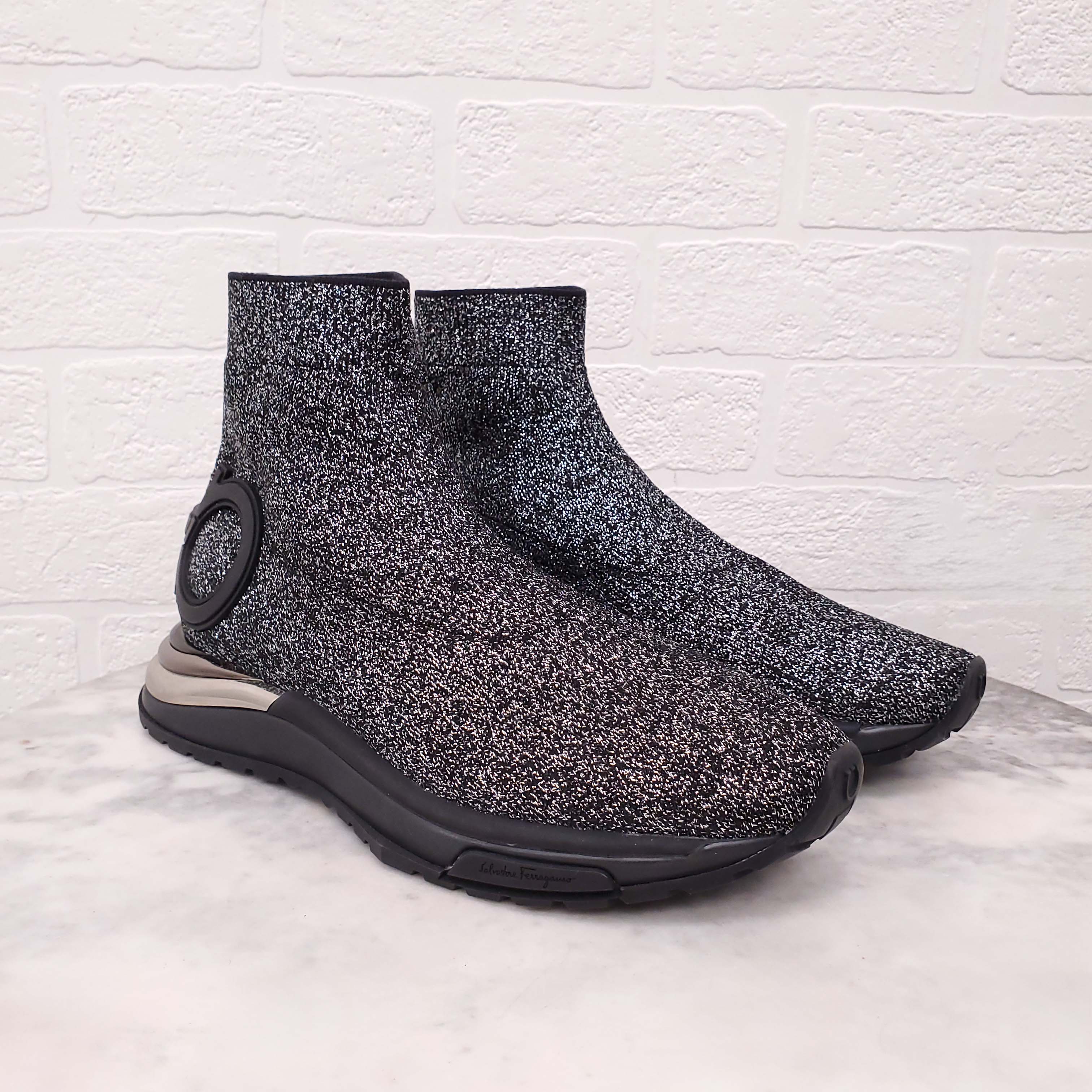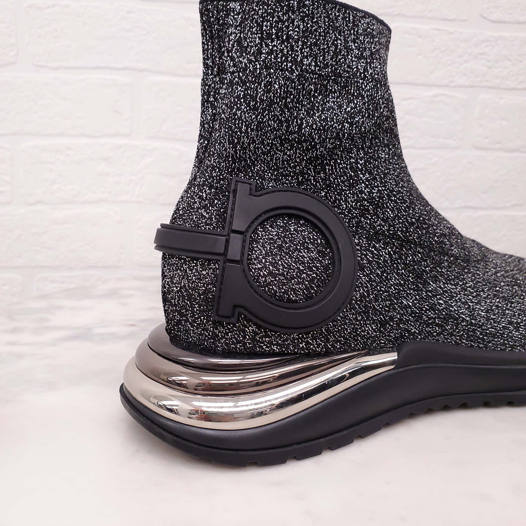 SALVATORE FERRAGAMO SILVER 'GANCINI' LOGO SOCK SNEAKERS - SIZE 8
