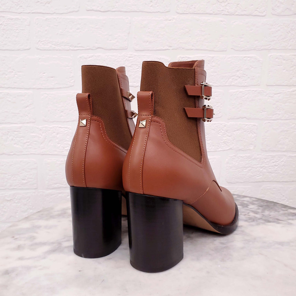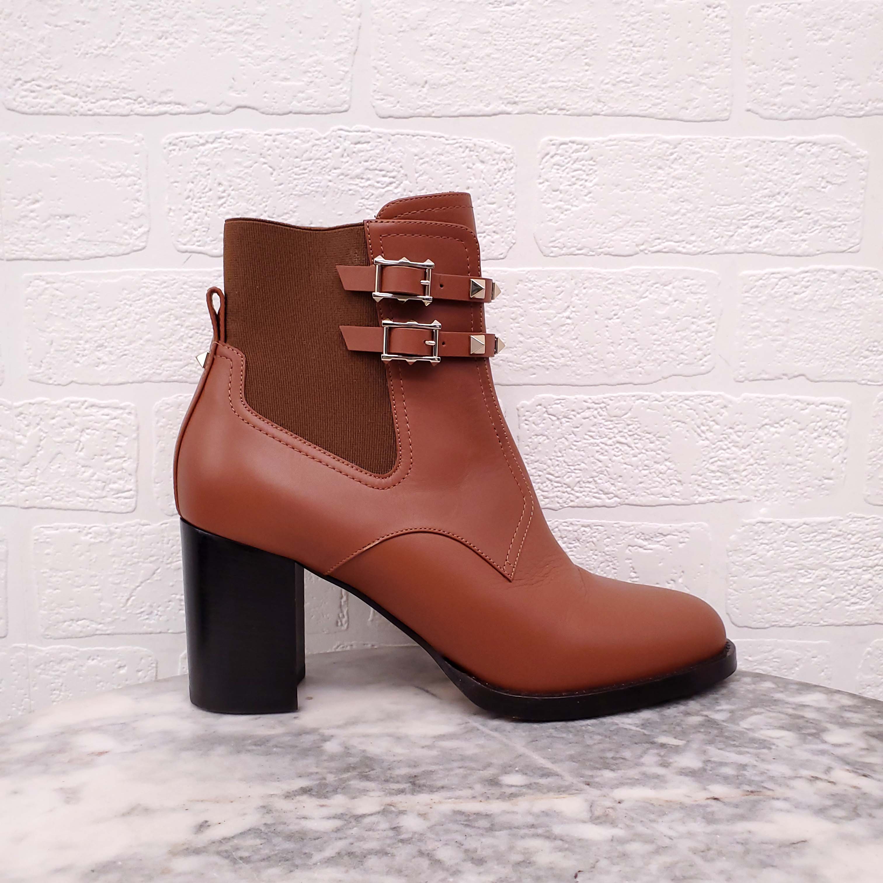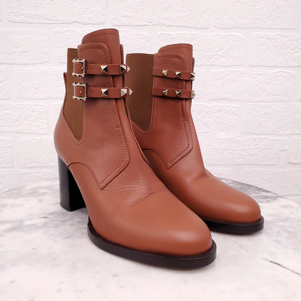 VALENTINO BROWN LEATHER ROCKSTUD BLOCK HEEL BOOTIES - SIZE 39.5