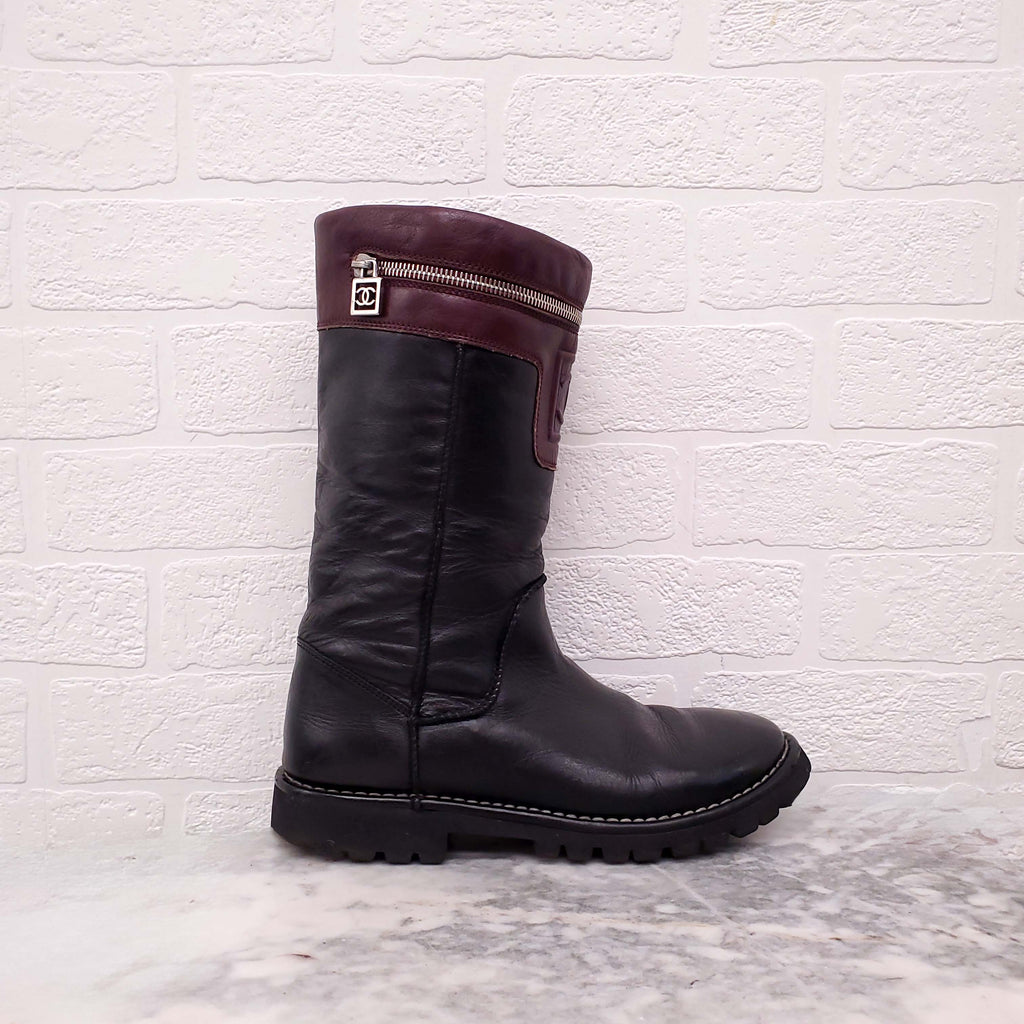 CHANEL BLACK AND BURGUNDY LOGO MOTORCYCLE BOOTS - SIZE 38