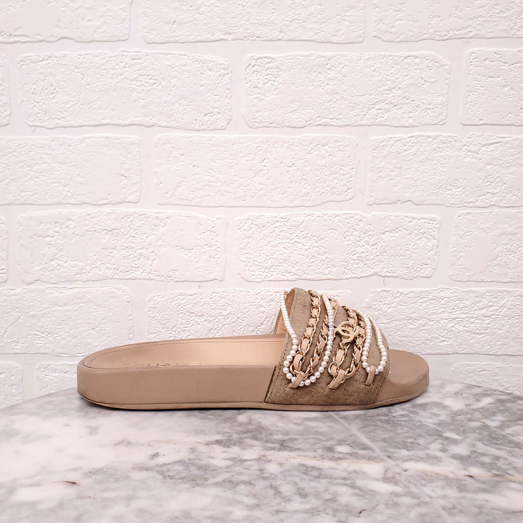 CHANEL CHAIN AND PEARL LOGO SLIDES - SIZE 39