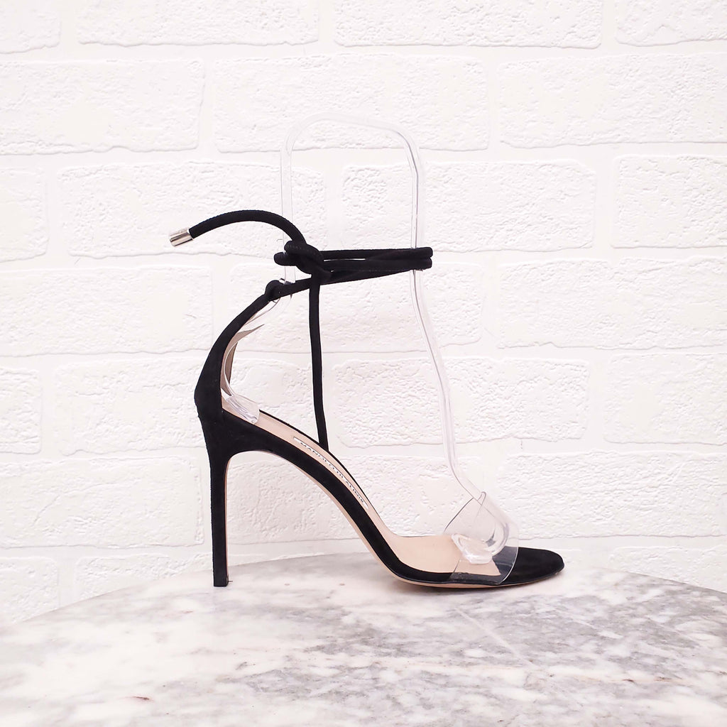 MANOLO BLAHNIK BLACK SUEDE AND PVC HEELS - SIZE 38.5